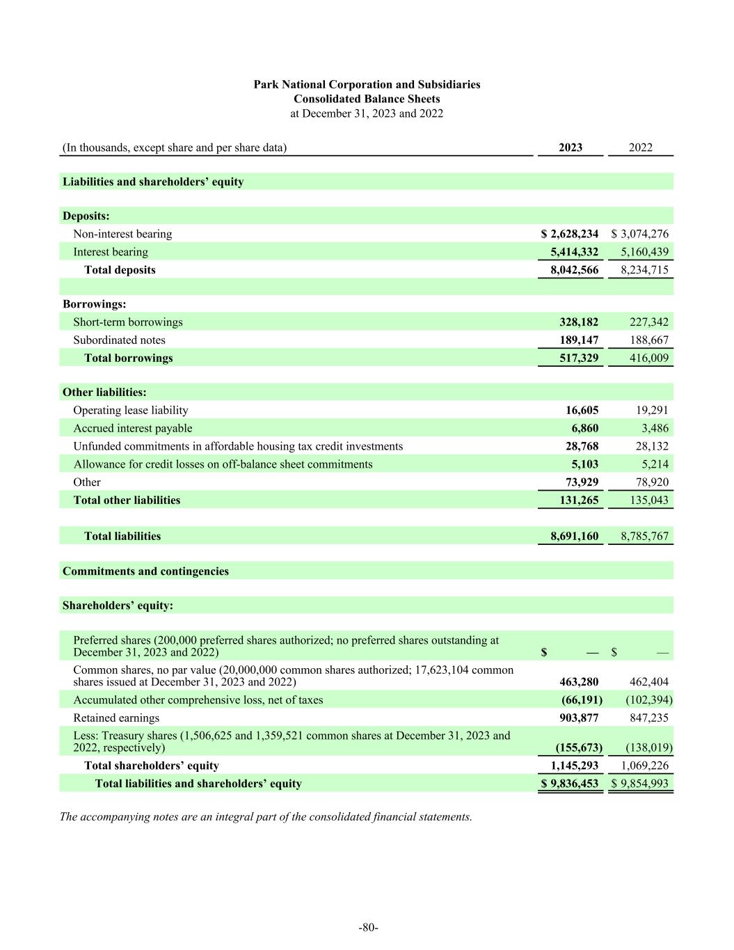Park National Corporation and Subsidiaries Consolidated Balance Sheets at December 31, 2023 and 2022 (In thousands, except share and per share data) 2023 2022 Liabilities and shareholders’ equity Deposits: Non-interest bearing $ 2,628,234 $ 3,074,276 Interest bearing 5,414,332 5,160,439 Total deposits 8,042,566 8,234,715 Borrowings: Short-term borrowings 328,182 227,342 Subordinated notes 189,147 188,667 Total borrowings 517,329 416,009 Other liabilities: Operating lease liability 16,605 19,291 Accrued interest payable 6,860 3,486 Unfunded commitments in affordable housing tax credit investments 28,768 28,132 Allowance for credit losses on off-balance sheet commitments 5,103 5,214 Other 73,929 78,920 Total other liabilities 131,265 135,043 Total liabilities 8,691,160 8,785,767 Commitments and contingencies Shareholders’ equity: Preferred shares (200,000 preferred shares authorized; no preferred shares outstanding at December 31, 2023 and 2022) $ — $ — Common shares, no par value (20,000,000 common shares authorized; 17,623,104 common shares issued at December 31, 2023 and 2022) 463,280 462,404 Accumulated other comprehensive loss, net of taxes (66,191) (102,394) Retained earnings 903,877 847,235 Less: Treasury shares (1,506,625 and 1,359,521 common shares at December 31, 2023 and 2022, respectively) (155,673) (138,019) Total shareholders’ equity 1,145,293 1,069,226 Total liabilities and shareholders’ equity $ 9,836,453 $ 9,854,993 The accompanying notes are an integral part of the consolidated financial statements. -80-