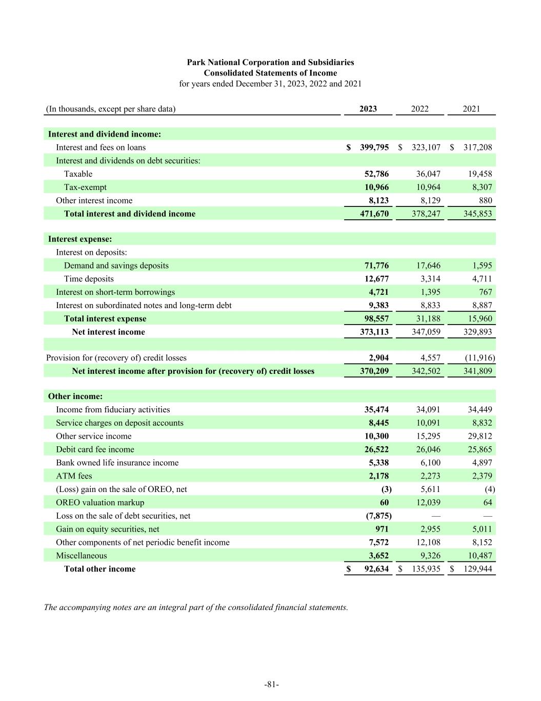 Park National Corporation and Subsidiaries Consolidated Statements of Income for years ended December 31, 2023, 2022 and 2021 (In thousands, except per share data) 2023 2022 2021 Interest and dividend income: Interest and fees on loans $ 399,795 $ 323,107 $ 317,208 Interest and dividends on debt securities: Taxable 52,786 36,047 19,458 Tax-exempt 10,966 10,964 8,307 Other interest income 8,123 8,129 880 Total interest and dividend income 471,670 378,247 345,853 Interest expense: Interest on deposits: Demand and savings deposits 71,776 17,646 1,595 Time deposits 12,677 3,314 4,711 Interest on short-term borrowings 4,721 1,395 767 Interest on subordinated notes and long-term debt 9,383 8,833 8,887 Total interest expense 98,557 31,188 15,960 Net interest income 373,113 347,059 329,893 Provision for (recovery of) credit losses 2,904 4,557 (11,916) Net interest income after provision for (recovery of) credit losses 370,209 342,502 341,809 Other income: Income from fiduciary activities 35,474 34,091 34,449 Service charges on deposit accounts 8,445 10,091 8,832 Other service income 10,300 15,295 29,812 Debit card fee income 26,522 26,046 25,865 Bank owned life insurance income 5,338 6,100 4,897 ATM fees 2,178 2,273 2,379 (Loss) gain on the sale of OREO, net (3) 5,611 (4) OREO valuation markup 60 12,039 64 Loss on the sale of debt securities, net (7,875) — — Gain on equity securities, net 971 2,955 5,011 Other components of net periodic benefit income 7,572 12,108 8,152 Miscellaneous 3,652 9,326 10,487 Total other income $ 92,634 $ 135,935 $ 129,944 The accompanying notes are an integral part of the consolidated financial statements. -81-