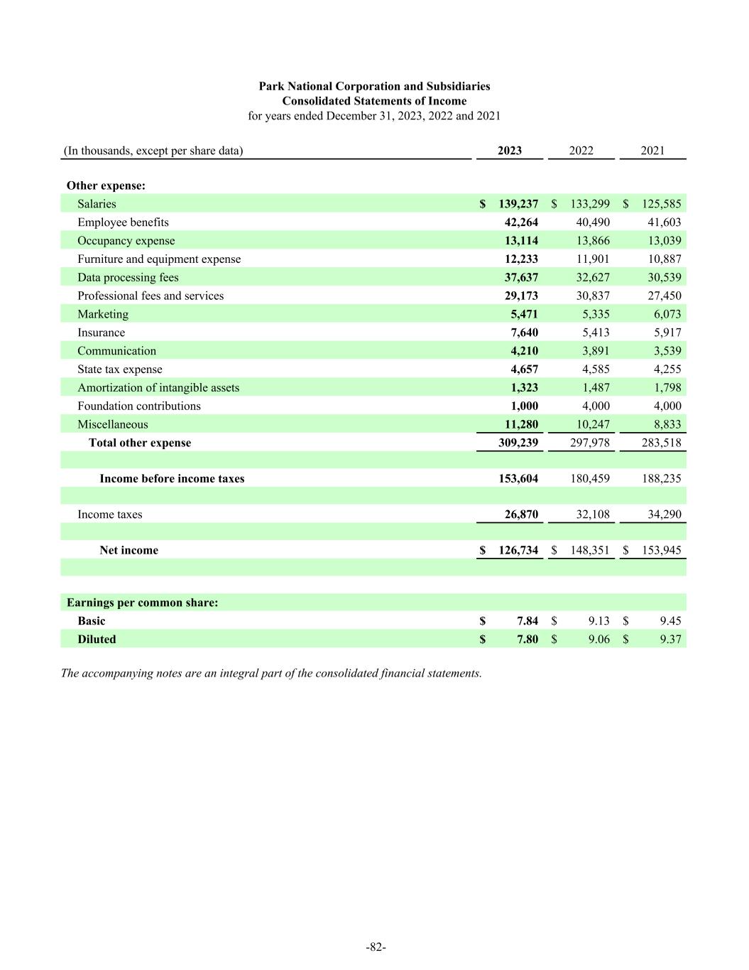 Park National Corporation and Subsidiaries Consolidated Statements of Income for years ended December 31, 2023, 2022 and 2021 (In thousands, except per share data) 2023 2022 2021 Other expense: Salaries $ 139,237 $ 133,299 $ 125,585 Employee benefits 42,264 40,490 41,603 Occupancy expense 13,114 13,866 13,039 Furniture and equipment expense 12,233 11,901 10,887 Data processing fees 37,637 32,627 30,539 Professional fees and services 29,173 30,837 27,450 Marketing 5,471 5,335 6,073 Insurance 7,640 5,413 5,917 Communication 4,210 3,891 3,539 State tax expense 4,657 4,585 4,255 Amortization of intangible assets 1,323 1,487 1,798 Foundation contributions 1,000 4,000 4,000 Miscellaneous 11,280 10,247 8,833 Total other expense 309,239 297,978 283,518 Income before income taxes 153,604 180,459 188,235 Income taxes 26,870 32,108 34,290 Net income $ 126,734 $ 148,351 $ 153,945 Earnings per common share: Basic $ 7.84 $ 9.13 $ 9.45 Diluted $ 7.80 $ 9.06 $ 9.37 The accompanying notes are an integral part of the consolidated financial statements. -82-