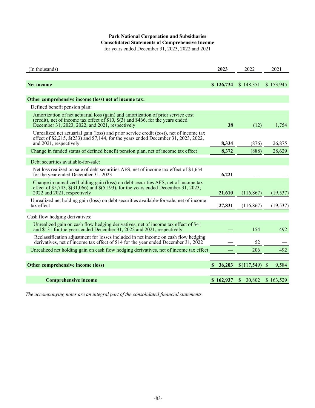 Park National Corporation and Subsidiaries Consolidated Statements of Comprehensive Income for years ended December 31, 2023, 2022 and 2021 (In thousands) 2023 2022 2021 Net income $ 126,734 $ 148,351 $ 153,945 Other comprehensive income (loss) net of income tax: Defined benefit pension plan: Amortization of net actuarial loss (gain) and amortization of prior service cost (credit), net of income tax effect of $10, $(3) and $466, for the years ended December 31, 2023, 2022, and 2021, respectively 38 (12) 1,754 Unrealized net actuarial gain (loss) and prior service credit (cost), net of income tax effect of $2,215, $(233) and $7,144, for the years ended December 31, 2023, 2022, and 2021, respectively 8,334 (876) 26,875 Change in funded status of defined benefit pension plan, net of income tax effect 8,372 (888) 28,629 Debt securities available-for-sale: Net loss realized on sale of debt securities AFS, net of income tax effect of $1,654 for the year ended December 31, 2023 6,221 — — Change in unrealized holding gain (loss) on debt securities AFS, net of income tax effect of $5,743, $(31,066) and $(5,193), for the years ended December 31, 2023, 2022 and 2021, respectively 21,610 (116,867) (19,537) Unrealized net holding gain (loss) on debt securities available-for-sale, net of income tax effect 27,831 (116,867) (19,537) Cash flow hedging derivatives: Unrealized gain on cash flow hedging derivatives, net of income tax effect of $41 and $131 for the years ended December 31, 2022 and 2021, respectively — 154 492 Reclassification adjustment for losses included in net income on cash flow hedging derivatives, net of income tax effect of $14 for the year ended December 31, 2022 — 52 — Unrealized net holding gain on cash flow hedging derivatives, net of income tax effect — 206 492 Other comprehensive income (loss) $ 36,203 $ (117,549) $ 9,584 Comprehensive income $ 162,937 $ 30,802 $ 163,529 The accompanying notes are an integral part of the consolidated financial statements. -83-