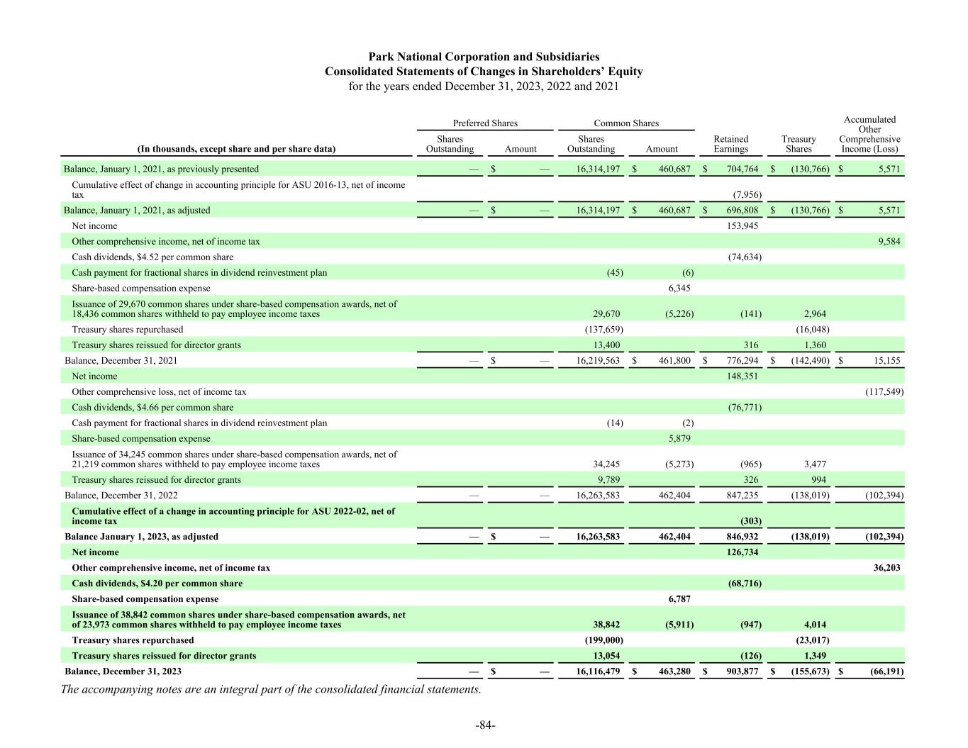 Park National Corporation and Subsidiaries Consolidated Statements of Changes in Shareholders’ Equity for the years ended December 31, 2023, 2022 and 2021 Balance, January 1, 2021, as previously presented — $ — 16,314,197 $ 460,687 $ 704,764 $ (130,766) $ 5,571 Cumulative effect of change in accounting principle for ASU 2016-13, net of income tax (7,956) Balance, January 1, 2021, as adjusted — $ — 16,314,197 $ 460,687 $ 696,808 $ (130,766) $ 5,571 Net income 153,945 Other comprehensive income, net of income tax 9,584 Cash dividends, $4.52 per common share (74,634) Cash payment for fractional shares in dividend reinvestment plan (45) (6) Share-based compensation expense 6,345 Issuance of 29,670 common shares under share-based compensation awards, net of 18,436 common shares withheld to pay employee income taxes 29,670 (5,226) (141) 2,964 Treasury shares repurchased (137,659) (16,048) Treasury shares reissued for director grants 13,400 316 1,360 Balance, December 31, 2021 — $ — 16,219,563 $ 461,800 $ 776,294 $ (142,490) $ 15,155 Net income 148,351 Other comprehensive loss, net of income tax (117,549) Cash dividends, $4.66 per common share (76,771) Cash payment for fractional shares in dividend reinvestment plan (14) (2) Share-based compensation expense 5,879 Issuance of 34,245 common shares under share-based compensation awards, net of 21,219 common shares withheld to pay employee income taxes 34,245 (5,273) (965) 3,477 Treasury shares reissued for director grants 9,789 326 994 Balance, December 31, 2022 — — 16,263,583 462,404 847,235 (138,019) (102,394) Cumulative effect of a change in accounting principle for ASU 2022-02, net of income tax (303) Balance January 1, 2023, as adjusted — $ — 16,263,583 462,404 846,932 (138,019) (102,394) Net income 126,734 Other comprehensive income, net of income tax 36,203 Cash dividends, $4.20 per common share (68,716) Share-based compensation expense 6,787 Issuance of 38,842 common shares under share-based compensation awards, net of 23,973 common shares withheld to pay employee income taxes 38,842 (5,911) (947) 4,014 Treasury shares repurchased (199,000) (23,017) Treasury shares reissued for director grants 13,054 (126) 1,349 Balance, December 31, 2023 — $ — 16,116,479 $ 463,280 $ 903,877 $ (155,673) $ (66,191) Preferred Shares Common Shares Retained Earnings Treasury Shares Accumulated Other Comprehensive Income (Loss)(In thousands, except share and per share data) Shares Outstanding Amount Shares Outstanding Amount The accompanying notes are an integral part of the consolidated financial statements. -84-