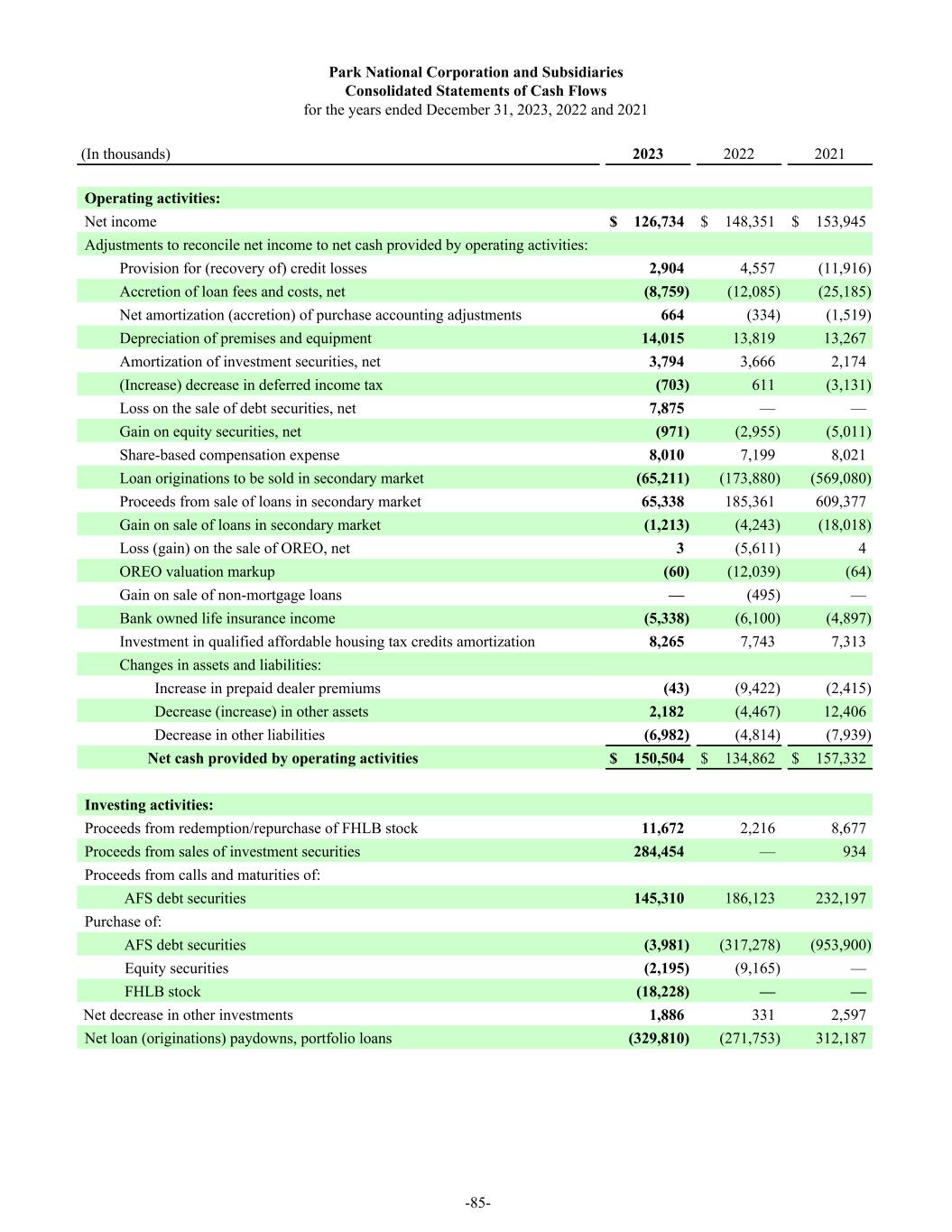Park National Corporation and Subsidiaries Consolidated Statements of Cash Flows for the years ended December 31, 2023, 2022 and 2021 (In thousands) 2023 2022 2021 Operating activities: Net income $ 126,734 $ 148,351 $ 153,945 Adjustments to reconcile net income to net cash provided by operating activities: Provision for (recovery of) credit losses 2,904 4,557 (11,916) Accretion of loan fees and costs, net (8,759) (12,085) (25,185) Net amortization (accretion) of purchase accounting adjustments 664 (334) (1,519) Depreciation of premises and equipment 14,015 13,819 13,267 Amortization of investment securities, net 3,794 3,666 2,174 (Increase) decrease in deferred income tax (703) 611 (3,131) Loss on the sale of debt securities, net 7,875 — — Gain on equity securities, net (971) (2,955) (5,011) Share-based compensation expense 8,010 7,199 8,021 Loan originations to be sold in secondary market (65,211) (173,880) (569,080) Proceeds from sale of loans in secondary market 65,338 185,361 609,377 Gain on sale of loans in secondary market (1,213) (4,243) (18,018) Loss (gain) on the sale of OREO, net 3 (5,611) 4 OREO valuation markup (60) (12,039) (64) Gain on sale of non-mortgage loans — (495) — Bank owned life insurance income (5,338) (6,100) (4,897) Investment in qualified affordable housing tax credits amortization 8,265 7,743 7,313 Changes in assets and liabilities: Increase in prepaid dealer premiums (43) (9,422) (2,415) Decrease (increase) in other assets 2,182 (4,467) 12,406 Decrease in other liabilities (6,982) (4,814) (7,939) Net cash provided by operating activities $ 150,504 $ 134,862 $ 157,332 Investing activities: Proceeds from redemption/repurchase of FHLB stock 11,672 2,216 8,677 Proceeds from sales of investment securities 284,454 — 934 Proceeds from calls and maturities of: AFS debt securities 145,310 186,123 232,197 Purchase of: AFS debt securities (3,981) (317,278) (953,900) Equity securities (2,195) (9,165) — FHLB stock (18,228) — — Net decrease in other investments 1,886 331 2,597 Net loan (originations) paydowns, portfolio loans (329,810) (271,753) 312,187 -85-