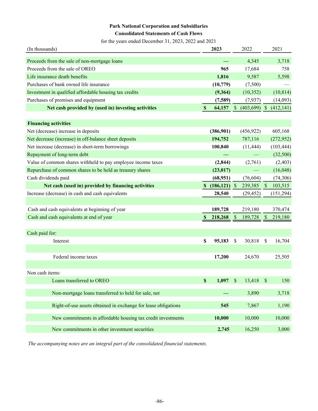 Park National Corporation and Subsidiaries Consolidated Statements of Cash Flows for the years ended December 31, 2023, 2022 and 2021 (In thousands) 2023 2022 2021 Proceeds from the sale of non-mortgage loans — 4,345 3,718 Proceeds from the sale of OREO 965 17,684 758 Life insurance death benefits 1,816 9,587 5,598 Purchases of bank owned life insurance (10,779) (7,500) — Investment in qualified affordable housing tax credits (9,364) (10,352) (10,814) Purchases of premises and equipment (7,589) (7,937) (14,093) Net cash provided by (used in) investing activities $ 64,157 $ (403,699) $ (412,141) Financing activities Net (decrease) increase in deposits (386,901) (456,922) 605,168 Net decrease (increase) in off-balance sheet deposits 194,752 787,116 (272,952) Net increase (decrease) in short-term borrowings 100,840 (11,444) (103,444) Repayment of long-term debt — — (32,500) Value of common shares withheld to pay employee income taxes (2,844) (2,761) (2,403) Repurchase of common shares to be held as treasury shares (23,017) — (16,048) Cash dividends paid (68,951) (76,604) (74,306) Net cash (used in) provided by financing activities $ (186,121) $ 239,385 $ 103,515 Increase (decrease) in cash and cash equivalents 28,540 (29,452) (151,294) Cash and cash equivalents at beginning of year 189,728 219,180 370,474 Cash and cash equivalents at end of year $ 218,268 $ 189,728 $ 219,180 Cash paid for: Interest $ 95,183 $ 30,818 $ 16,704 Federal income taxes 17,200 24,670 25,505 Non cash items: Loans transferred to OREO $ 1,097 $ 13,418 $ 150 Non-mortgage loans transferred to held for sale, net — 3,890 3,718 Right-of-use assets obtained in exchange for lease obligations 545 7,867 1,190 New commitments in affordable housing tax credit investments 10,000 10,000 10,000 New commitments in other investment securities 2,745 16,250 3,000 The accompanying notes are an integral part of the consolidated financial statements. -86-