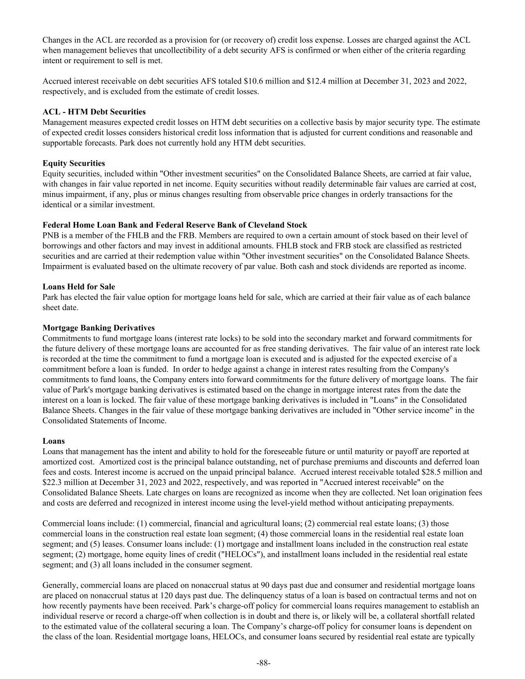 Changes in the ACL are recorded as a provision for (or recovery of) credit loss expense. Losses are charged against the ACL when management believes that uncollectibility of a debt security AFS is confirmed or when either of the criteria regarding intent or requirement to sell is met. Accrued interest receivable on debt securities AFS totaled $10.6 million and $12.4 million at December 31, 2023 and 2022, respectively, and is excluded from the estimate of credit losses. ACL - HTM Debt Securities Management measures expected credit losses on HTM debt securities on a collective basis by major security type. The estimate of expected credit losses considers historical credit loss information that is adjusted for current conditions and reasonable and supportable forecasts. Park does not currently hold any HTM debt securities. Equity Securities Equity securities, included within "Other investment securities" on the Consolidated Balance Sheets, are carried at fair value, with changes in fair value reported in net income. Equity securities without readily determinable fair values are carried at cost, minus impairment, if any, plus or minus changes resulting from observable price changes in orderly transactions for the identical or a similar investment. Federal Home Loan Bank and Federal Reserve Bank of Cleveland Stock PNB is a member of the FHLB and the FRB. Members are required to own a certain amount of stock based on their level of borrowings and other factors and may invest in additional amounts. FHLB stock and FRB stock are classified as restricted securities and are carried at their redemption value within "Other investment securities" on the Consolidated Balance Sheets. Impairment is evaluated based on the ultimate recovery of par value. Both cash and stock dividends are reported as income. Loans Held for Sale Park has elected the fair value option for mortgage loans held for sale, which are carried at their fair value as of each balance sheet date. Mortgage Banking Derivatives Commitments to fund mortgage loans (interest rate locks) to be sold into the secondary market and forward commitments for the future delivery of these mortgage loans are accounted for as free standing derivatives. The fair value of an interest rate lock is recorded at the time the commitment to fund a mortgage loan is executed and is adjusted for the expected exercise of a commitment before a loan is funded. In order to hedge against a change in interest rates resulting from the Company's commitments to fund loans, the Company enters into forward commitments for the future delivery of mortgage loans. The fair value of Park's mortgage banking derivatives is estimated based on the change in mortgage interest rates from the date the interest on a loan is locked. The fair value of these mortgage banking derivatives is included in "Loans" in the Consolidated Balance Sheets. Changes in the fair value of these mortgage banking derivatives are included in "Other service income" in the Consolidated Statements of Income. Loans Loans that management has the intent and ability to hold for the foreseeable future or until maturity or payoff are reported at amortized cost. Amortized cost is the principal balance outstanding, net of purchase premiums and discounts and deferred loan fees and costs. Interest income is accrued on the unpaid principal balance. Accrued interest receivable totaled $28.5 million and $22.3 million at December 31, 2023 and 2022, respectively, and was reported in "Accrued interest receivable" on the Consolidated Balance Sheets. Late charges on loans are recognized as income when they are collected. Net loan origination fees and costs are deferred and recognized in interest income using the level-yield method without anticipating prepayments. Commercial loans include: (1) commercial, financial and agricultural loans; (2) commercial real estate loans; (3) those commercial loans in the construction real estate loan segment; (4) those commercial loans in the residential real estate loan segment; and (5) leases. Consumer loans include: (1) mortgage and installment loans included in the construction real estate segment; (2) mortgage, home equity lines of credit ("HELOCs"), and installment loans included in the residential real estate segment; and (3) all loans included in the consumer segment. Generally, commercial loans are placed on nonaccrual status at 90 days past due and consumer and residential mortgage loans are placed on nonaccrual status at 120 days past due. The delinquency status of a loan is based on contractual terms and not on how recently payments have been received. Park’s charge-off policy for commercial loans requires management to establish an individual reserve or record a charge-off when collection is in doubt and there is, or likely will be, a collateral shortfall related to the estimated value of the collateral securing a loan. The Company’s charge-off policy for consumer loans is dependent on the class of the loan. Residential mortgage loans, HELOCs, and consumer loans secured by residential real estate are typically -88-