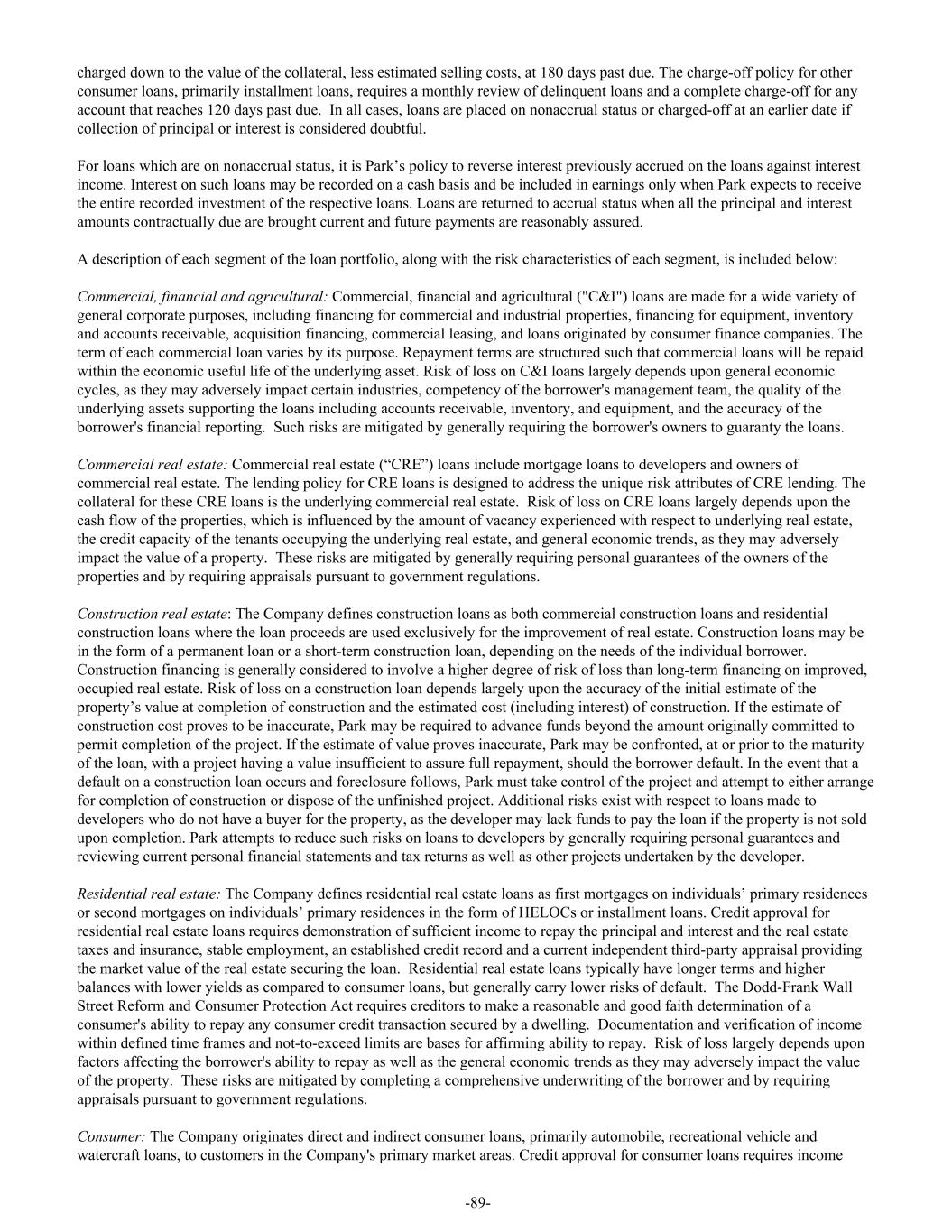 charged down to the value of the collateral, less estimated selling costs, at 180 days past due. The charge-off policy for other consumer loans, primarily installment loans, requires a monthly review of delinquent loans and a complete charge-off for any account that reaches 120 days past due. In all cases, loans are placed on nonaccrual status or charged-off at an earlier date if collection of principal or interest is considered doubtful. For loans which are on nonaccrual status, it is Park’s policy to reverse interest previously accrued on the loans against interest income. Interest on such loans may be recorded on a cash basis and be included in earnings only when Park expects to receive the entire recorded investment of the respective loans. Loans are returned to accrual status when all the principal and interest amounts contractually due are brought current and future payments are reasonably assured. A description of each segment of the loan portfolio, along with the risk characteristics of each segment, is included below: Commercial, financial and agricultural: Commercial, financial and agricultural ("C&I") loans are made for a wide variety of general corporate purposes, including financing for commercial and industrial properties, financing for equipment, inventory and accounts receivable, acquisition financing, commercial leasing, and loans originated by consumer finance companies. The term of each commercial loan varies by its purpose. Repayment terms are structured such that commercial loans will be repaid within the economic useful life of the underlying asset. Risk of loss on C&I loans largely depends upon general economic cycles, as they may adversely impact certain industries, competency of the borrower's management team, the quality of the underlying assets supporting the loans including accounts receivable, inventory, and equipment, and the accuracy of the borrower's financial reporting. Such risks are mitigated by generally requiring the borrower's owners to guaranty the loans. Commercial real estate: Commercial real estate (“CRE”) loans include mortgage loans to developers and owners of commercial real estate. The lending policy for CRE loans is designed to address the unique risk attributes of CRE lending. The collateral for these CRE loans is the underlying commercial real estate. Risk of loss on CRE loans largely depends upon the cash flow of the properties, which is influenced by the amount of vacancy experienced with respect to underlying real estate, the credit capacity of the tenants occupying the underlying real estate, and general economic trends, as they may adversely impact the value of a property. These risks are mitigated by generally requiring personal guarantees of the owners of the properties and by requiring appraisals pursuant to government regulations. Construction real estate: The Company defines construction loans as both commercial construction loans and residential construction loans where the loan proceeds are used exclusively for the improvement of real estate. Construction loans may be in the form of a permanent loan or a short-term construction loan, depending on the needs of the individual borrower. Construction financing is generally considered to involve a higher degree of risk of loss than long-term financing on improved, occupied real estate. Risk of loss on a construction loan depends largely upon the accuracy of the initial estimate of the property’s value at completion of construction and the estimated cost (including interest) of construction. If the estimate of construction cost proves to be inaccurate, Park may be required to advance funds beyond the amount originally committed to permit completion of the project. If the estimate of value proves inaccurate, Park may be confronted, at or prior to the maturity of the loan, with a project having a value insufficient to assure full repayment, should the borrower default. In the event that a default on a construction loan occurs and foreclosure follows, Park must take control of the project and attempt to either arrange for completion of construction or dispose of the unfinished project. Additional risks exist with respect to loans made to developers who do not have a buyer for the property, as the developer may lack funds to pay the loan if the property is not sold upon completion. Park attempts to reduce such risks on loans to developers by generally requiring personal guarantees and reviewing current personal financial statements and tax returns as well as other projects undertaken by the developer. Residential real estate: The Company defines residential real estate loans as first mortgages on individuals’ primary residences or second mortgages on individuals’ primary residences in the form of HELOCs or installment loans. Credit approval for residential real estate loans requires demonstration of sufficient income to repay the principal and interest and the real estate taxes and insurance, stable employment, an established credit record and a current independent third-party appraisal providing the market value of the real estate securing the loan. Residential real estate loans typically have longer terms and higher balances with lower yields as compared to consumer loans, but generally carry lower risks of default. The Dodd-Frank Wall Street Reform and Consumer Protection Act requires creditors to make a reasonable and good faith determination of a consumer's ability to repay any consumer credit transaction secured by a dwelling. Documentation and verification of income within defined time frames and not-to-exceed limits are bases for affirming ability to repay. Risk of loss largely depends upon factors affecting the borrower's ability to repay as well as the general economic trends as they may adversely impact the value of the property. These risks are mitigated by completing a comprehensive underwriting of the borrower and by requiring appraisals pursuant to government r