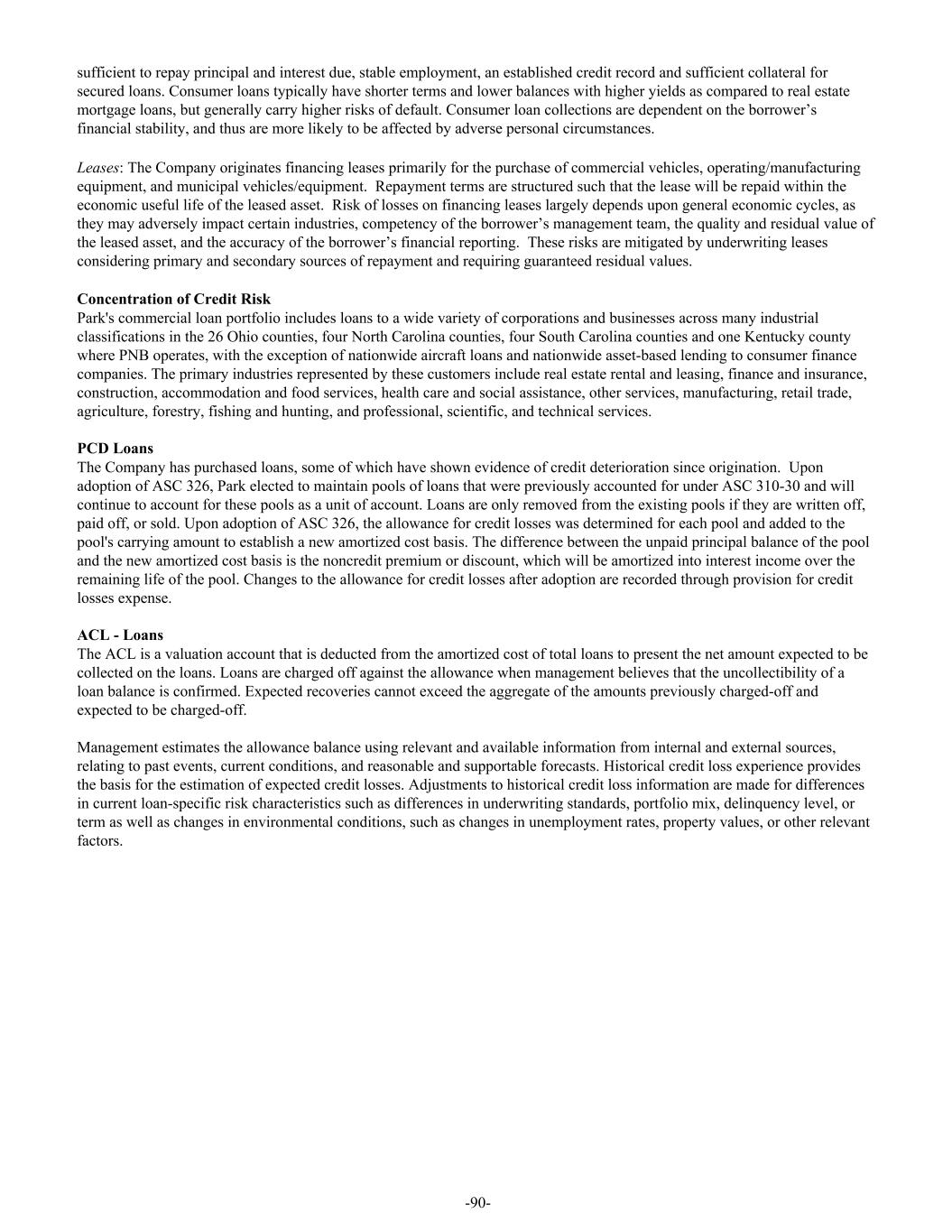 sufficient to repay principal and interest due, stable employment, an established credit record and sufficient collateral for secured loans. Consumer loans typically have shorter terms and lower balances with higher yields as compared to real estate mortgage loans, but generally carry higher risks of default. Consumer loan collections are dependent on the borrower’s financial stability, and thus are more likely to be affected by adverse personal circumstances. Leases: The Company originates financing leases primarily for the purchase of commercial vehicles, operating/manufacturing equipment, and municipal vehicles/equipment. Repayment terms are structured such that the lease will be repaid within the economic useful life of the leased asset. Risk of losses on financing leases largely depends upon general economic cycles, as they may adversely impact certain industries, competency of the borrower’s management team, the quality and residual value of the leased asset, and the accuracy of the borrower’s financial reporting. These risks are mitigated by underwriting leases considering primary and secondary sources of repayment and requiring guaranteed residual values. Concentration of Credit Risk Park's commercial loan portfolio includes loans to a wide variety of corporations and businesses across many industrial classifications in the 26 Ohio counties, four North Carolina counties, four South Carolina counties and one Kentucky county where PNB operates, with the exception of nationwide aircraft loans and nationwide asset-based lending to consumer finance companies. The primary industries represented by these customers include real estate rental and leasing, finance and insurance, construction, accommodation and food services, health care and social assistance, other services, manufacturing, retail trade, agriculture, forestry, fishing and hunting, and professional, scientific, and technical services. PCD Loans The Company has purchased loans, some of which have shown evidence of credit deterioration since origination. Upon adoption of ASC 326, Park elected to maintain pools of loans that were previously accounted for under ASC 310-30 and will continue to account for these pools as a unit of account. Loans are only removed from the existing pools if they are written off, paid off, or sold. Upon adoption of ASC 326, the allowance for credit losses was determined for each pool and added to the pool's carrying amount to establish a new amortized cost basis. The difference between the unpaid principal balance of the pool and the new amortized cost basis is the noncredit premium or discount, which will be amortized into interest income over the remaining life of the pool. Changes to the allowance for credit losses after adoption are recorded through provision for credit losses expense. ACL - Loans The ACL is a valuation account that is deducted from the amortized cost of total loans to present the net amount expected to be collected on the loans. Loans are charged off against the allowance when management believes that the uncollectibility of a loan balance is confirmed. Expected recoveries cannot exceed the aggregate of the amounts previously charged-off and expected to be charged-off. Management estimates the allowance balance using relevant and available information from internal and external sources, relating to past events, current conditions, and reasonable and supportable forecasts. Historical credit loss experience provides the basis for the estimation of expected credit losses. Adjustments to historical credit loss information are made for differences in current loan-specific risk characteristics such as differences in underwriting standards, portfolio mix, delinquency level, or term as well as changes in environmental conditions, such as changes in unemployment rates, property values, or other relevant factors. -90-