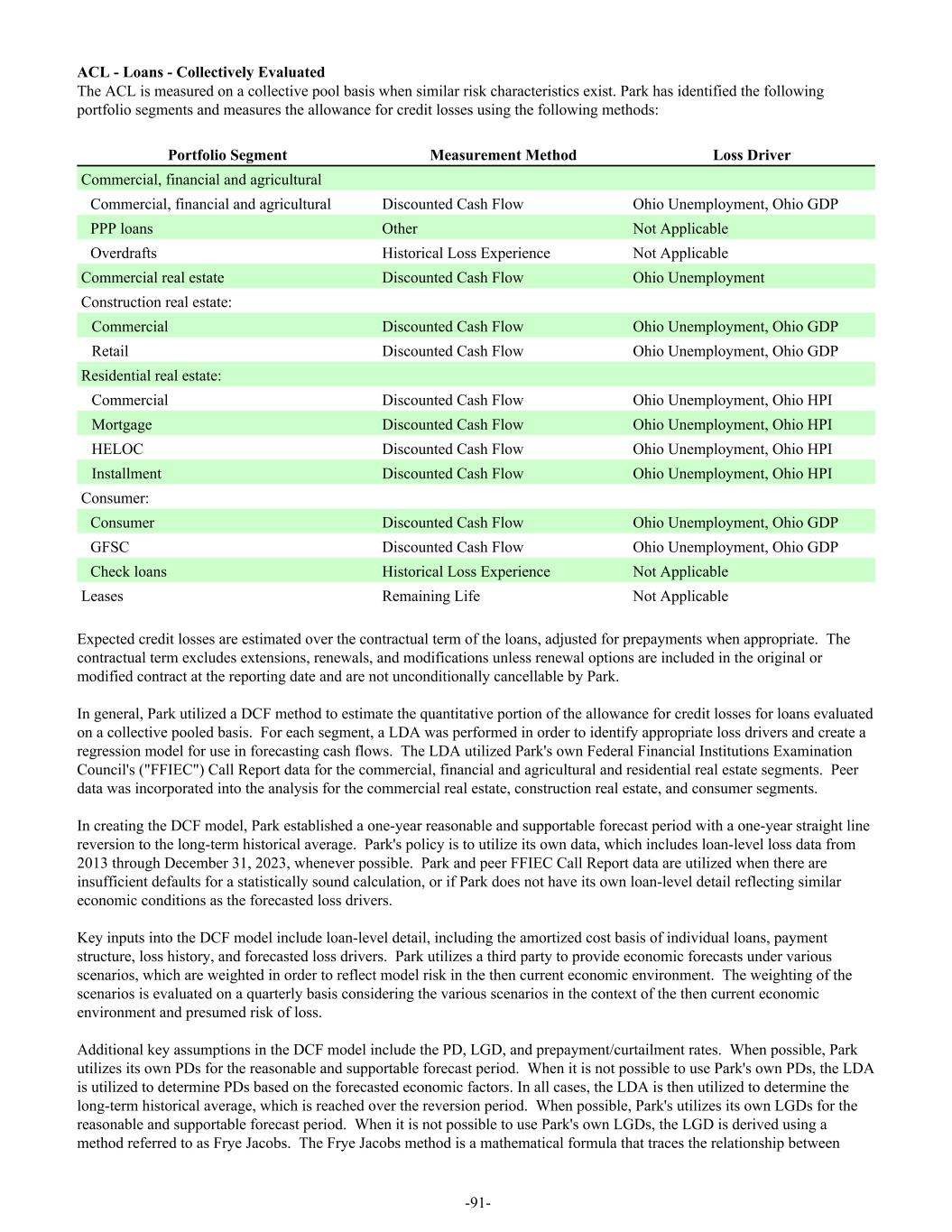 ACL - Loans - Collectively Evaluated The ACL is measured on a collective pool basis when similar risk characteristics exist. Park has identified the following portfolio segments and measures the allowance for credit losses using the following methods: Portfolio Segment Measurement Method Loss Driver Commercial, financial and agricultural Commercial, financial and agricultural Discounted Cash Flow Ohio Unemployment, Ohio GDP PPP loans Other Not Applicable Overdrafts Historical Loss Experience Not Applicable Commercial real estate Discounted Cash Flow Ohio Unemployment Construction real estate: Commercial Discounted Cash Flow Ohio Unemployment, Ohio GDP Retail Discounted Cash Flow Ohio Unemployment, Ohio GDP Residential real estate: Commercial Discounted Cash Flow Ohio Unemployment, Ohio HPI Mortgage Discounted Cash Flow Ohio Unemployment, Ohio HPI HELOC Discounted Cash Flow Ohio Unemployment, Ohio HPI Installment Discounted Cash Flow Ohio Unemployment, Ohio HPI Consumer: Consumer Discounted Cash Flow Ohio Unemployment, Ohio GDP GFSC Discounted Cash Flow Ohio Unemployment, Ohio GDP Check loans Historical Loss Experience Not Applicable Leases Remaining Life Not Applicable Expected credit losses are estimated over the contractual term of the loans, adjusted for prepayments when appropriate. The contractual term excludes extensions, renewals, and modifications unless renewal options are included in the original or modified contract at the reporting date and are not unconditionally cancellable by Park. In general, Park utilized a DCF method to estimate the quantitative portion of the allowance for credit losses for loans evaluated on a collective pooled basis. For each segment, a LDA was performed in order to identify appropriate loss drivers and create a regression model for use in forecasting cash flows. The LDA utilized Park's own Federal Financial Institutions Examination Council's ("FFIEC") Call Report data for the commercial, financial and agricultural and residential real estate segments. Peer data was incorporated into the analysis for the commercial real estate, construction real estate, and consumer segments. In creating the DCF model, Park established a one-year reasonable and supportable forecast period with a one-year straight line reversion to the long-term historical average. Park's policy is to utilize its own data, which includes loan-level loss data from 2013 through December 31, 2023, whenever possible. Park and peer FFIEC Call Report data are utilized when there are insufficient defaults for a statistically sound calculation, or if Park does not have its own loan-level detail reflecting similar economic conditions as the forecasted loss drivers. Key inputs into the DCF model include loan-level detail, including the amortized cost basis of individual loans, payment structure, loss history, and forecasted loss drivers. Park utilizes a third party to provide economic forecasts under various scenarios, which are weighted in order to reflect model risk in the then current economic environment. The weighting of the scenarios is evaluated on a quarterly basis considering the various scenarios in the context of the then current economic environment and presumed risk of loss. Additional key assumptions in the DCF model include the PD, LGD, and prepayment/curtailment rates. When possible, Park utilizes its own PDs for the reasonable and supportable forecast period. When it is not possible to use Park's own PDs, the LDA is utilized to determine PDs based on the forecasted economic factors. In all cases, the LDA is then utilized to determine the long-term historical average, which is reached over the reversion period. When possible, Park's utilizes its own LGDs for the reasonable and supportable forecast period. When it is not possible to use Park's own LGDs, the LGD is derived using a method referred to as Frye Jacobs. The Frye Jacobs method is a mathematical formula that traces the relationship between -91-