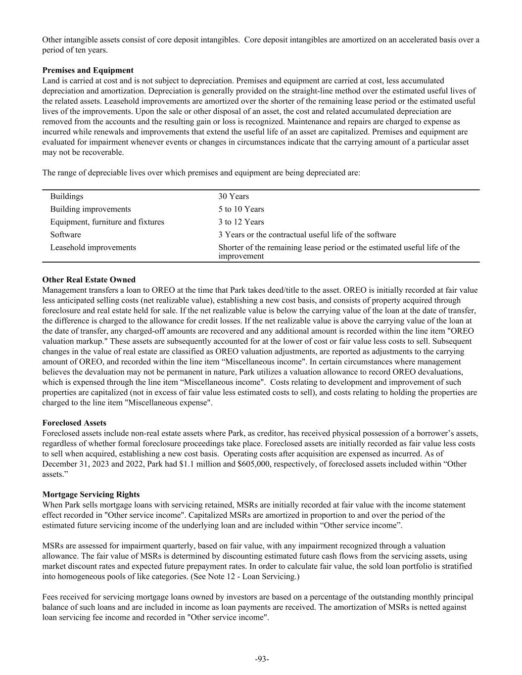 Other intangible assets consist of core deposit intangibles. Core deposit intangibles are amortized on an accelerated basis over a period of ten years. Premises and Equipment Land is carried at cost and is not subject to depreciation. Premises and equipment are carried at cost, less accumulated depreciation and amortization. Depreciation is generally provided on the straight-line method over the estimated useful lives of the related assets. Leasehold improvements are amortized over the shorter of the remaining lease period or the estimated useful lives of the improvements. Upon the sale or other disposal of an asset, the cost and related accumulated depreciation are removed from the accounts and the resulting gain or loss is recognized. Maintenance and repairs are charged to expense as incurred while renewals and improvements that extend the useful life of an asset are capitalized. Premises and equipment are evaluated for impairment whenever events or changes in circumstances indicate that the carrying amount of a particular asset may not be recoverable. The range of depreciable lives over which premises and equipment are being depreciated are: Buildings 30 Years Building improvements 5 to 10 Years Equipment, furniture and fixtures 3 to 12 Years Software 3 Years or the contractual useful life of the software Leasehold improvements Shorter of the remaining lease period or the estimated useful life of the improvement Other Real Estate Owned Management transfers a loan to OREO at the time that Park takes deed/title to the asset. OREO is initially recorded at fair value less anticipated selling costs (net realizable value), establishing a new cost basis, and consists of property acquired through foreclosure and real estate held for sale. If the net realizable value is below the carrying value of the loan at the date of transfer, the difference is charged to the allowance for credit losses. If the net realizable value is above the carrying value of the loan at the date of transfer, any charged-off amounts are recovered and any additional amount is recorded within the line item "OREO valuation markup." These assets are subsequently accounted for at the lower of cost or fair value less costs to sell. Subsequent changes in the value of real estate are classified as OREO valuation adjustments, are reported as adjustments to the carrying amount of OREO, and recorded within the line item “Miscellaneous income". In certain circumstances where management believes the devaluation may not be permanent in nature, Park utilizes a valuation allowance to record OREO devaluations, which is expensed through the line item “Miscellaneous income". Costs relating to development and improvement of such properties are capitalized (not in excess of fair value less estimated costs to sell), and costs relating to holding the properties are charged to the line item "Miscellaneous expense". Foreclosed Assets Foreclosed assets include non-real estate assets where Park, as creditor, has received physical possession of a borrower’s assets, regardless of whether formal foreclosure proceedings take place. Foreclosed assets are initially recorded as fair value less costs to sell when acquired, establishing a new cost basis. Operating costs after acquisition are expensed as incurred. As of December 31, 2023 and 2022, Park had $1.1 million and $605,000, respectively, of foreclosed assets included within “Other assets.” Mortgage Servicing Rights When Park sells mortgage loans with servicing retained, MSRs are initially recorded at fair value with the income statement effect recorded in "Other service income". Capitalized MSRs are amortized in proportion to and over the period of the estimated future servicing income of the underlying loan and are included within “Other service income”. MSRs are assessed for impairment quarterly, based on fair value, with any impairment recognized through a valuation allowance. The fair value of MSRs is determined by discounting estimated future cash flows from the servicing assets, using market discount rates and expected future prepayment rates. In order to calculate fair value, the sold loan portfolio is stratified into homogeneous pools of like categories. (See Note 12 - Loan Servicing.) Fees received for servicing mortgage loans owned by investors are based on a percentage of the outstanding monthly principal balance of such loans and are included in income as loan payments are received. The amortization of MSRs is netted against loan servicing fee income and recorded in "Other service income". -93-