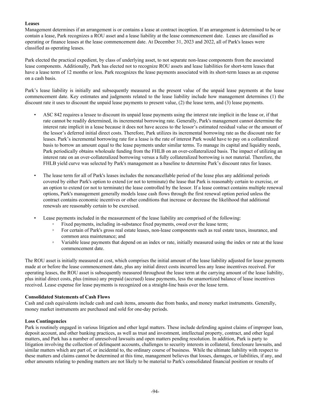 Leases Management determines if an arrangement is or contains a lease at contract inception. If an arrangement is determined to be or contain a lease, Park recognizes a ROU asset and a lease liability at the lease commencement date. Leases are classified as operating or finance leases at the lease commencement date. At December 31, 2023 and 2022, all of Park's leases were classified as operating leases. Park elected the practical expedient, by class of underlying asset, to not separate non-lease components from the associated lease components. Additionally, Park has elected not to recognize ROU assets and lease liabilities for short-term leases that have a lease term of 12 months or less. Park recognizes the lease payments associated with its short-term leases as an expense on a cash basis. Park’s lease liability is initially and subsequently measured as the present value of the unpaid lease payments at the lease commencement date. Key estimates and judgments related to the lease liability include how management determines (1) the discount rate it uses to discount the unpaid lease payments to present value, (2) the lease term, and (3) lease payments. • ASC 842 requires a lessee to discount its unpaid lease payments using the interest rate implicit in the lease or, if that rate cannot be readily determined, its incremental borrowing rate. Generally, Park's management cannot determine the interest rate implicit in a lease because it does not have access to the lessor’s estimated residual value or the amount of the lessor’s deferred initial direct costs. Therefore, Park utilizes its incremental borrowing rate as the discount rate for leases. Park’s incremental borrowing rate for a lease is the rate of interest Park would have to pay on a collateralized basis to borrow an amount equal to the lease payments under similar terms. To manage its capital and liquidity needs, Park periodically obtains wholesale funding from the FHLB on an over-collateralized basis. The impact of utilizing an interest rate on an over-collateralized borrowing versus a fully collateralized borrowing is not material. Therefore, the FHLB yield curve was selected by Park's management as a baseline to determine Park’s discount rates for leases. • The lease term for all of Park's leases includes the noncancellable period of the lease plus any additional periods covered by either Park's option to extend (or not to terminate) the lease that Park is reasonably certain to exercise, or an option to extend (or not to terminate) the lease controlled by the lessor. If a lease contract contains multiple renewal options, Park's management generally models lease cash flows through the first renewal option period unless the contract contains economic incentives or other conditions that increase or decrease the likelihood that additional renewals are reasonably certain to be exercised. • Lease payments included in the measurement of the lease liability are comprised of the following: ◦ Fixed payments, including in-substance fixed payments, owed over the lease term; ◦ For certain of Park's gross real estate leases, non-lease components such as real estate taxes, insurance, and common area maintenance; and ◦ Variable lease payments that depend on an index or rate, initially measured using the index or rate at the lease commencement date. The ROU asset is initially measured at cost, which comprises the initial amount of the lease liability adjusted for lease payments made at or before the lease commencement date, plus any initial direct costs incurred less any lease incentives received. For operating leases, the ROU asset is subsequently measured throughout the lease term at the carrying amount of the lease liability, plus initial direct costs, plus (minus) any prepaid (accrued) lease payments, less the unamortized balance of lease incentives received. Lease expense for lease payments is recognized on a straight-line basis over the lease term. Consolidated Statements of Cash Flows Cash and cash equivalents include cash and cash items, amounts due from banks, and money market instruments. Generally, money market instruments are purchased and sold for one-day periods. Loss Contingencies Park is routinely engaged in various litigation and other legal matters. These include defending against claims of improper loan, deposit account, and other banking practices, as well as trust and investment, intellectual property, contract, and other legal matters, and Park has a number of unresolved lawsuits and open matters pending resolution. In addition, Park is party to litigation involving the collection of delinquent accounts, challenges to security interests in collateral, foreclosure lawsuits, and similar matters which are part of, or incidental to, the ordinary course of business. While the ultimate liability with respect to these matters and claims cannot be determined at this time, management believes that losses, damages, or liabilities, if any, and other amounts relating to pending matters are not likely to be material to Park's consolidated financial position or results of -94-