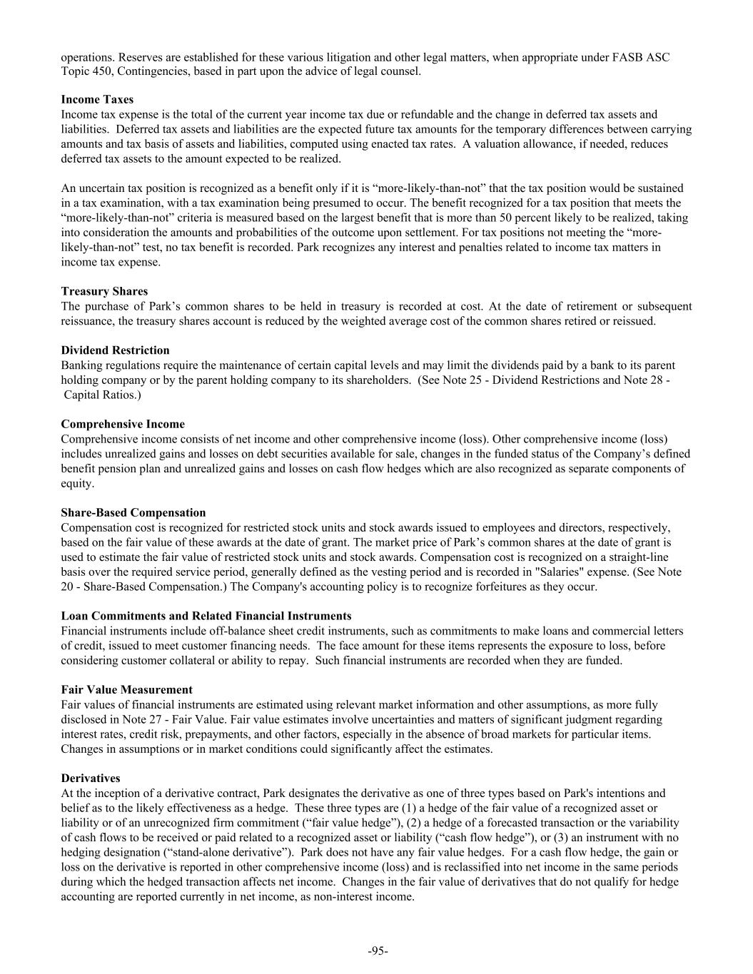 operations. Reserves are established for these various litigation and other legal matters, when appropriate under FASB ASC Topic 450, Contingencies, based in part upon the advice of legal counsel. Income Taxes Income tax expense is the total of the current year income tax due or refundable and the change in deferred tax assets and liabilities. Deferred tax assets and liabilities are the expected future tax amounts for the temporary differences between carrying amounts and tax basis of assets and liabilities, computed using enacted tax rates. A valuation allowance, if needed, reduces deferred tax assets to the amount expected to be realized. An uncertain tax position is recognized as a benefit only if it is “more-likely-than-not” that the tax position would be sustained in a tax examination, with a tax examination being presumed to occur. The benefit recognized for a tax position that meets the “more-likely-than-not” criteria is measured based on the largest benefit that is more than 50 percent likely to be realized, taking into consideration the amounts and probabilities of the outcome upon settlement. For tax positions not meeting the “more- likely-than-not” test, no tax benefit is recorded. Park recognizes any interest and penalties related to income tax matters in income tax expense. Treasury Shares The purchase of Park’s common shares to be held in treasury is recorded at cost. At the date of retirement or subsequent reissuance, the treasury shares account is reduced by the weighted average cost of the common shares retired or reissued. Dividend Restriction Banking regulations require the maintenance of certain capital levels and may limit the dividends paid by a bank to its parent holding company or by the parent holding company to its shareholders. (See Note 25 - Dividend Restrictions and Note 28 - Capital Ratios.) Comprehensive Income Comprehensive income consists of net income and other comprehensive income (loss). Other comprehensive income (loss) includes unrealized gains and losses on debt securities available for sale, changes in the funded status of the Company’s defined benefit pension plan and unrealized gains and losses on cash flow hedges which are also recognized as separate components of equity. Share-Based Compensation Compensation cost is recognized for restricted stock units and stock awards issued to employees and directors, respectively, based on the fair value of these awards at the date of grant. The market price of Park’s common shares at the date of grant is used to estimate the fair value of restricted stock units and stock awards. Compensation cost is recognized on a straight-line basis over the required service period, generally defined as the vesting period and is recorded in "Salaries" expense. (See Note 20 - Share-Based Compensation.) The Company's accounting policy is to recognize forfeitures as they occur. Loan Commitments and Related Financial Instruments Financial instruments include off-balance sheet credit instruments, such as commitments to make loans and commercial letters of credit, issued to meet customer financing needs. The face amount for these items represents the exposure to loss, before considering customer collateral or ability to repay. Such financial instruments are recorded when they are funded. Fair Value Measurement Fair values of financial instruments are estimated using relevant market information and other assumptions, as more fully disclosed in Note 27 - Fair Value. Fair value estimates involve uncertainties and matters of significant judgment regarding interest rates, credit risk, prepayments, and other factors, especially in the absence of broad markets for particular items. Changes in assumptions or in market conditions could significantly affect the estimates. Derivatives At the inception of a derivative contract, Park designates the derivative as one of three types based on Park's intentions and belief as to the likely effectiveness as a hedge. These three types are (1) a hedge of the fair value of a recognized asset or liability or of an unrecognized firm commitment (“fair value hedge”), (2) a hedge of a forecasted transaction or the variability of cash flows to be received or paid related to a recognized asset or liability (“cash flow hedge”), or (3) an instrument with no hedging designation (“stand-alone derivative”). Park does not have any fair value hedges. For a cash flow hedge, the gain or loss on the derivative is reported in other comprehensive income (loss) and is reclassified into net income in the same periods during which the hedged transaction affects net income. Changes in the fair value of derivatives that do not qualify for hedge accounting are reported currently in net income, as non-interest income. -95-