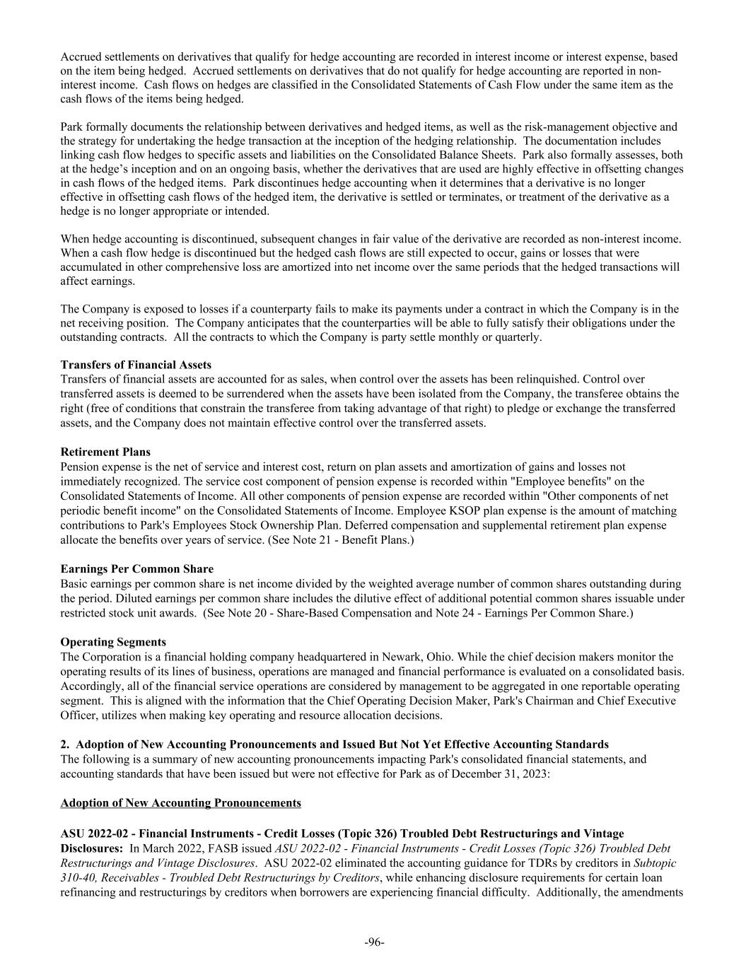 Accrued settlements on derivatives that qualify for hedge accounting are recorded in interest income or interest expense, based on the item being hedged. Accrued settlements on derivatives that do not qualify for hedge accounting are reported in non- interest income. Cash flows on hedges are classified in the Consolidated Statements of Cash Flow under the same item as the cash flows of the items being hedged. Park formally documents the relationship between derivatives and hedged items, as well as the risk-management objective and the strategy for undertaking the hedge transaction at the inception of the hedging relationship. The documentation includes linking cash flow hedges to specific assets and liabilities on the Consolidated Balance Sheets. Park also formally assesses, both at the hedge’s inception and on an ongoing basis, whether the derivatives that are used are highly effective in offsetting changes in cash flows of the hedged items. Park discontinues hedge accounting when it determines that a derivative is no longer effective in offsetting cash flows of the hedged item, the derivative is settled or terminates, or treatment of the derivative as a hedge is no longer appropriate or intended. When hedge accounting is discontinued, subsequent changes in fair value of the derivative are recorded as non-interest income. When a cash flow hedge is discontinued but the hedged cash flows are still expected to occur, gains or losses that were accumulated in other comprehensive loss are amortized into net income over the same periods that the hedged transactions will affect earnings. The Company is exposed to losses if a counterparty fails to make its payments under a contract in which the Company is in the net receiving position. The Company anticipates that the counterparties will be able to fully satisfy their obligations under the outstanding contracts. All the contracts to which the Company is party settle monthly or quarterly. Transfers of Financial Assets Transfers of financial assets are accounted for as sales, when control over the assets has been relinquished. Control over transferred assets is deemed to be surrendered when the assets have been isolated from the Company, the transferee obtains the right (free of conditions that constrain the transferee from taking advantage of that right) to pledge or exchange the transferred assets, and the Company does not maintain effective control over the transferred assets. Retirement Plans Pension expense is the net of service and interest cost, return on plan assets and amortization of gains and losses not immediately recognized. The service cost component of pension expense is recorded within "Employee benefits" on the Consolidated Statements of Income. All other components of pension expense are recorded within "Other components of net periodic benefit income" on the Consolidated Statements of Income. Employee KSOP plan expense is the amount of matching contributions to Park's Employees Stock Ownership Plan. Deferred compensation and supplemental retirement plan expense allocate the benefits over years of service. (See Note 21 - Benefit Plans.) Earnings Per Common Share Basic earnings per common share is net income divided by the weighted average number of common shares outstanding during the period. Diluted earnings per common share includes the dilutive effect of additional potential common shares issuable under restricted stock unit awards. (See Note 20 - Share-Based Compensation and Note 24 - Earnings Per Common Share.) Operating Segments The Corporation is a financial holding company headquartered in Newark, Ohio. While the chief decision makers monitor the operating results of its lines of business, operations are managed and financial performance is evaluated on a consolidated basis. Accordingly, all of the financial service operations are considered by management to be aggregated in one reportable operating segment. This is aligned with the information that the Chief Operating Decision Maker, Park's Chairman and Chief Executive Officer, utilizes when making key operating and resource allocation decisions. 2. Adoption of New Accounting Pronouncements and Issued But Not Yet Effective Accounting Standards The following is a summary of new accounting pronouncements impacting Park's consolidated financial statements, and accounting standards that have been issued but were not effective for Park as of December 31, 2023: Adoption of New Accounting Pronouncements ASU 2022-02 - Financial Instruments - Credit Losses (Topic 326) Troubled Debt Restructurings and Vintage Disclosures: In March 2022, FASB issued ASU 2022-02 - Financial Instruments - Credit Losses (Topic 326) Troubled Debt Restructurings and Vintage Disclosures. ASU 2022-02 eliminated the accounting guidance for TDRs by creditors in Subtopic 310-40, Receivables - Troubled Debt Restructurings by Creditors, while enhancing disclosure requirements for certain loan refinancing and restructurings by creditors when borrowers are experiencing financial difficulty. Additionally, the amendments -96-