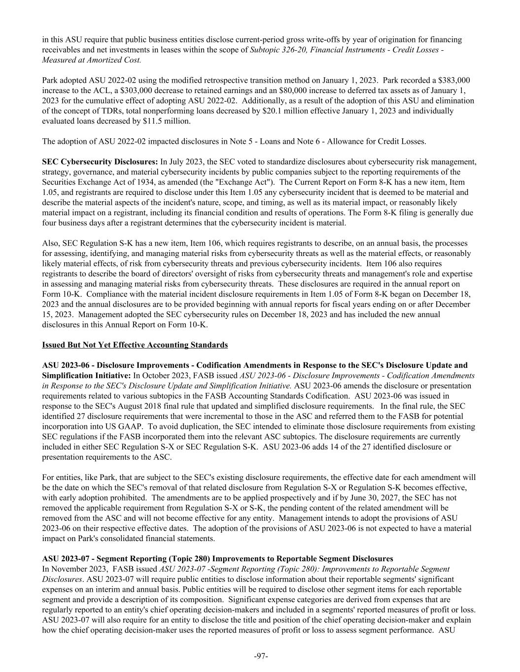 in this ASU require that public business entities disclose current-period gross write-offs by year of origination for financing receivables and net investments in leases within the scope of Subtopic 326-20, Financial Instruments - Credit Losses - Measured at Amortized Cost. Park adopted ASU 2022-02 using the modified retrospective transition method on January 1, 2023. Park recorded a $383,000 increase to the ACL, a $303,000 decrease to retained earnings and an $80,000 increase to deferred tax assets as of January 1, 2023 for the cumulative effect of adopting ASU 2022-02. Additionally, as a result of the adoption of this ASU and elimination of the concept of TDRs, total nonperforming loans decreased by $20.1 million effective January 1, 2023 and individually evaluated loans decreased by $11.5 million. The adoption of ASU 2022-02 impacted disclosures in Note 5 - Loans and Note 6 - Allowance for Credit Losses. SEC Cybersecurity Disclosures: In July 2023, the SEC voted to standardize disclosures about cybersecurity risk management, strategy, governance, and material cybersecurity incidents by public companies subject to the reporting requirements of the Securities Exchange Act of 1934, as amended (the "Exchange Act"). The Current Report on Form 8-K has a new item, Item 1.05, and registrants are required to disclose under this Item 1.05 any cybersecurity incident that is deemed to be material and describe the material aspects of the incident's nature, scope, and timing, as well as its material impact, or reasonably likely material impact on a registrant, including its financial condition and results of operations. The Form 8-K filing is generally due four business days after a registrant determines that the cybersecurity incident is material. Also, SEC Regulation S-K has a new item, Item 106, which requires registrants to describe, on an annual basis, the processes for assessing, identifying, and managing material risks from cybersecurity threats as well as the material effects, or reasonably likely material effects, of risk from cybersecurity threats and previous cybersecurity incidents. Item 106 also requires registrants to describe the board of directors' oversight of risks from cybersecurity threats and management's role and expertise in assessing and managing material risks from cybersecurity threats. These disclosures are required in the annual report on Form 10-K. Compliance with the material incident disclosure requirements in Item 1.05 of Form 8-K began on December 18, 2023 and the annual disclosures are to be provided beginning with annual reports for fiscal years ending on or after December 15, 2023. Management adopted the SEC cybersecurity rules on December 18, 2023 and has included the new annual disclosures in this Annual Report on Form 10-K. Issued But Not Yet Effective Accounting Standards ASU 2023-06 - Disclosure Improvements - Codification Amendments in Response to the SEC's Disclosure Update and Simplification Initiative: In October 2023, FASB issued ASU 2023-06 - Disclosure Improvements - Codification Amendments in Response to the SEC's Disclosure Update and Simplification Initiative. ASU 2023-06 amends the disclosure or presentation requirements related to various subtopics in the FASB Accounting Standards Codification. ASU 2023-06 was issued in response to the SEC's August 2018 final rule that updated and simplified disclosure requirements. In the final rule, the SEC identified 27 disclosure requirements that were incremental to those in the ASC and referred them to the FASB for potential incorporation into US GAAP. To avoid duplication, the SEC intended to eliminate those disclosure requirements from existing SEC regulations if the FASB incorporated them into the relevant ASC subtopics. The disclosure requirements are currently included in either SEC Regulation S-X or SEC Regulation S-K. ASU 2023-06 adds 14 of the 27 identified disclosure or presentation requirements to the ASC. For entities, like Park, that are subject to the SEC's existing disclosure requirements, the effective date for each amendment will be the date on which the SEC's removal of that related disclosure from Regulation S-X or Regulation S-K becomes effective, with early adoption prohibited. The amendments are to be applied prospectively and if by June 30, 2027, the SEC has not removed the applicable requirement from Regulation S-X or S-K, the pending content of the related amendment will be removed from the ASC and will not become effective for any entity. Management intends to adopt the provisions of ASU 2023-06 on their respective effective dates. The adoption of the provisions of ASU 2023-06 is not expected to have a material impact on Park's consolidated financial statements. ASU 2023-07 - Segment Reporting (Topic 280) Improvements to Reportable Segment Disclosures In November 2023, FASB issued ASU 2023-07 -Segment Reporting (Topic 280): Improvements to Reportable Segment Disclosures. ASU 2023-07 will require public entities to disclose information about their reportable segments' significant expenses on an interim and annual basis. Public entities will be required to disclose other segment items for each reportable segment and provide a description of its composition. Significant expense categories are derived from expenses that are regularly reported to an entity's chief operating decision-makers and included in a segments' reported measures of profit or loss. ASU 2023-07 will also require for an entity to disclose the title and position of the chief operating decision-maker and explain how the chief operating decision-maker uses the reported measures of profit or loss to assess segment performance. ASU -97-
