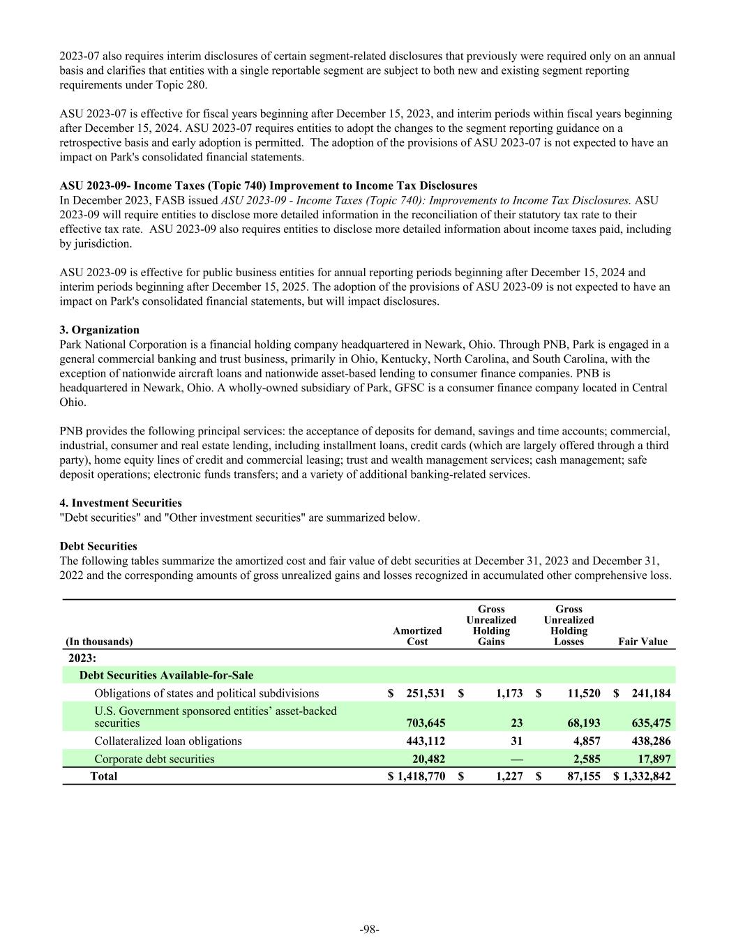2023-07 also requires interim disclosures of certain segment-related disclosures that previously were required only on an annual basis and clarifies that entities with a single reportable segment are subject to both new and existing segment reporting requirements under Topic 280. ASU 2023-07 is effective for fiscal years beginning after December 15, 2023, and interim periods within fiscal years beginning after December 15, 2024. ASU 2023-07 requires entities to adopt the changes to the segment reporting guidance on a retrospective basis and early adoption is permitted. The adoption of the provisions of ASU 2023-07 is not expected to have an impact on Park's consolidated financial statements. ASU 2023-09- Income Taxes (Topic 740) Improvement to Income Tax Disclosures In December 2023, FASB issued ASU 2023-09 - Income Taxes (Topic 740): Improvements to Income Tax Disclosures. ASU 2023-09 will require entities to disclose more detailed information in the reconciliation of their statutory tax rate to their effective tax rate. ASU 2023-09 also requires entities to disclose more detailed information about income taxes paid, including by jurisdiction. ASU 2023-09 is effective for public business entities for annual reporting periods beginning after December 15, 2024 and interim periods beginning after December 15, 2025. The adoption of the provisions of ASU 2023-09 is not expected to have an impact on Park's consolidated financial statements, but will impact disclosures. 3. Organization Park National Corporation is a financial holding company headquartered in Newark, Ohio. Through PNB, Park is engaged in a general commercial banking and trust business, primarily in Ohio, Kentucky, North Carolina, and South Carolina, with the exception of nationwide aircraft loans and nationwide asset-based lending to consumer finance companies. PNB is headquartered in Newark, Ohio. A wholly-owned subsidiary of Park, GFSC is a consumer finance company located in Central Ohio. PNB provides the following principal services: the acceptance of deposits for demand, savings and time accounts; commercial, industrial, consumer and real estate lending, including installment loans, credit cards (which are largely offered through a third party), home equity lines of credit and commercial leasing; trust and wealth management services; cash management; safe deposit operations; electronic funds transfers; and a variety of additional banking-related services. 4. Investment Securities "Debt securities" and "Other investment securities" are summarized below. Debt Securities The following tables summarize the amortized cost and fair value of debt securities at December 31, 2023 and December 31, 2022 and the corresponding amounts of gross unrealized gains and losses recognized in accumulated other comprehensive loss. (In thousands) Amortized Cost Gross Unrealized Holding Gains Gross Unrealized Holding Losses Fair Value 2023: Debt Securities Available-for-Sale Obligations of states and political subdivisions $ 251,531 $ 1,173 $ 11,520 $ 241,184 U.S. Government sponsored entities’ asset-backed securities 703,645 23 68,193 635,475 Collateralized loan obligations 443,112 31 4,857 438,286 Corporate debt securities 20,482 — 2,585 17,897 Total $ 1,418,770 $ 1,227 $ 87,155 $ 1,332,842 -98-