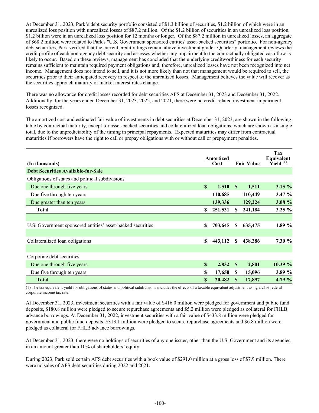At December 31, 2023, Park’s debt security portfolio consisted of $1.3 billion of securities, $1.2 billion of which were in an unrealized loss position with unrealized losses of $87.2 million. Of the $1.2 billion of securities in an unrealized loss position, $1.2 billion were in an unrealized loss position for 12 months or longer. Of the $87.2 million in unrealized losses, an aggregate of $68.2 million were related to Park's "U.S. Government sponsored entities' asset-backed securities" portfolio. For non-agency debt securities, Park verified that the current credit ratings remain above investment grade. Quarterly, management reviews the credit profile of each non-agency debt security and assesses whether any impairment to the contractually obligated cash flow is likely to occur. Based on these reviews, management has concluded that the underlying creditworthiness for each security remains sufficient to maintain required payment obligations and, therefore, unrealized losses have not been recognized into net income. Management does not intend to sell, and it is not more likely than not that management would be required to sell, the securities prior to their anticipated recovery in respect of the unrealized losses. Management believes the value will recover as the securities approach maturity or market interest rates change. There was no allowance for credit losses recorded for debt securities AFS at December 31, 2023 and December 31, 2022. Additionally, for the years ended December 31, 2023, 2022, and 2021, there were no credit-related investment impairment losses recognized. The amortized cost and estimated fair value of investments in debt securities at December 31, 2023, are shown in the following table by contractual maturity, except for asset-backed securities and collateralized loan obligations, which are shown as a single total, due to the unpredictability of the timing in principal repayments. Expected maturities may differ from contractual maturities if borrowers have the right to call or prepay obligations with or without call or prepayment penalties. (In thousands) Amortized Cost Fair Value Tax Equivalent Yield (1) Debt Securities Available-for-Sale Obligations of states and political subdivisions Due one through five years $ 1,510 $ 1,511 3.15 % Due five through ten years 110,685 110,449 3.47 % Due greater than ten years 139,336 129,224 3.08 % Total $ 251,531 $ 241,184 3.25 % U.S. Government sponsored entities’ asset-backed securities $ 703,645 $ 635,475 1.89 % Collateralized loan obligations $ 443,112 $ 438,286 7.30 % Corporate debt securities Due one through five years $ 2,832 $ 2,801 10.39 % Due five through ten years $ 17,650 $ 15,096 3.89 % Total $ 20,482 $ 17,897 4.79 % (1) The tax equivalent yield for obligations of states and political subdivisions includes the effects of a taxable equivalent adjustment using a 21% federal corporate income tax rate. At December 31, 2023, investment securities with a fair value of $416.0 million were pledged for government and public fund deposits, $180.8 million were pledged to secure repurchase agreements and $5.2 million were pledged as collateral for FHLB advance borrowings. At December 31, 2022, investment securities with a fair value of $433.8 million were pledged for government and public fund deposits, $313.1 million were pledged to secure repurchase agreements and $6.8 million were pledged as collateral for FHLB advance borrowings. At December 31, 2023, there were no holdings of securities of any one issuer, other than the U.S. Government and its agencies, in an amount greater than 10% of shareholders’ equity. During 2023, Park sold certain AFS debt securities with a book value of $291.0 million at a gross loss of $7.9 million. There were no sales of AFS debt securities during 2022 and 2021. -100-