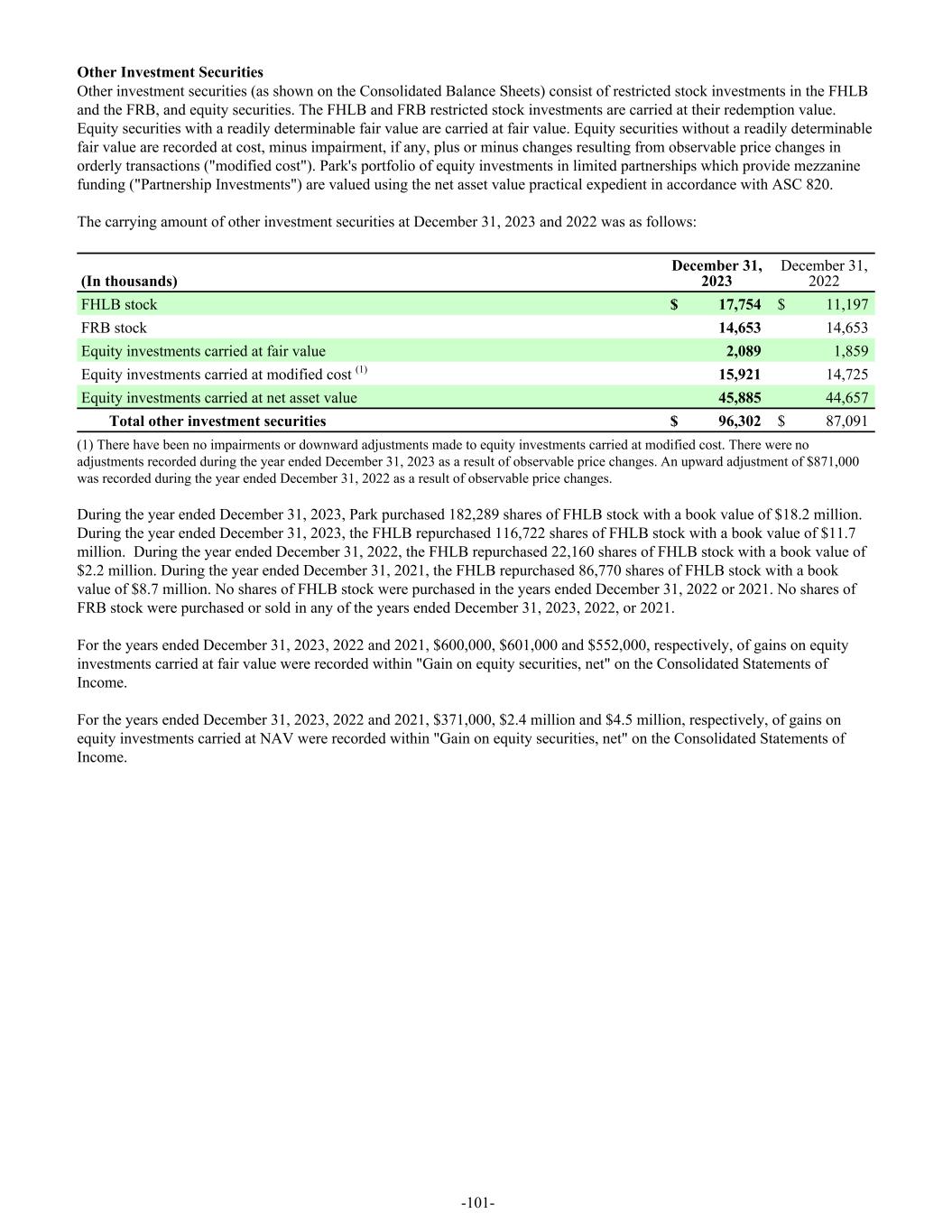 Other Investment Securities Other investment securities (as shown on the Consolidated Balance Sheets) consist of restricted stock investments in the FHLB and the FRB, and equity securities. The FHLB and FRB restricted stock investments are carried at their redemption value. Equity securities with a readily determinable fair value are carried at fair value. Equity securities without a readily determinable fair value are recorded at cost, minus impairment, if any, plus or minus changes resulting from observable price changes in orderly transactions ("modified cost"). Park's portfolio of equity investments in limited partnerships which provide mezzanine funding ("Partnership Investments") are valued using the net asset value practical expedient in accordance with ASC 820. The carrying amount of other investment securities at December 31, 2023 and 2022 was as follows: (In thousands) December 31, 2023 December 31, 2022 FHLB stock $ 17,754 $ 11,197 FRB stock 14,653 14,653 Equity investments carried at fair value 2,089 1,859 Equity investments carried at modified cost (1) 15,921 14,725 Equity investments carried at net asset value 45,885 44,657 Total other investment securities $ 96,302 $ 87,091 (1) There have been no impairments or downward adjustments made to equity investments carried at modified cost. There were no adjustments recorded during the year ended December 31, 2023 as a result of observable price changes. An upward adjustment of $871,000 was recorded during the year ended December 31, 2022 as a result of observable price changes. During the year ended December 31, 2023, Park purchased 182,289 shares of FHLB stock with a book value of $18.2 million. During the year ended December 31, 2023, the FHLB repurchased 116,722 shares of FHLB stock with a book value of $11.7 million. During the year ended December 31, 2022, the FHLB repurchased 22,160 shares of FHLB stock with a book value of $2.2 million. During the year ended December 31, 2021, the FHLB repurchased 86,770 shares of FHLB stock with a book value of $8.7 million. No shares of FHLB stock were purchased in the years ended December 31, 2022 or 2021. No shares of FRB stock were purchased or sold in any of the years ended December 31, 2023, 2022, or 2021. For the years ended December 31, 2023, 2022 and 2021, $600,000, $601,000 and $552,000, respectively, of gains on equity investments carried at fair value were recorded within "Gain on equity securities, net" on the Consolidated Statements of Income. For the years ended December 31, 2023, 2022 and 2021, $371,000, $2.4 million and $4.5 million, respectively, of gains on equity investments carried at NAV were recorded within "Gain on equity securities, net" on the Consolidated Statements of Income. -101-