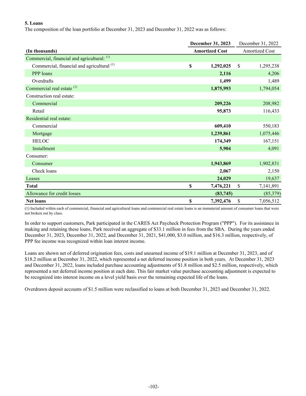 5. Loans The composition of the loan portfolio at December 31, 2023 and December 31, 2022 was as follows: December 31, 2023 December 31, 2022 (In thousands) Amortized Cost Amortized Cost Commercial, financial and agricultural: (1) Commercial, financial and agricultural (1) $ 1,292,025 $ 1,295,238 PPP loans 2,116 4,206 Overdrafts 1,499 1,489 Commercial real estate (1) 1,875,993 1,794,054 Construction real estate: Commercial 209,226 208,982 Retail 95,873 116,433 Residential real estate: Commercial 609,410 550,183 Mortgage 1,239,861 1,075,446 HELOC 174,349 167,151 Installment 5,904 4,091 Consumer: Consumer 1,943,869 1,902,831 Check loans 2,067 2,150 Leases 24,029 19,637 Total $ 7,476,221 $ 7,141,891 Allowance for credit losses (83,745) (85,379) Net loans $ 7,392,476 $ 7,056,512 (1) Included within each of commercial, financial and agricultural loans and commercial real estate loans is an immaterial amount of consumer loans that were not broken out by class. In order to support customers, Park participated in the CARES Act Paycheck Protection Program ("PPP"). For its assistance in making and retaining these loans, Park received an aggregate of $33.1 million in fees from the SBA. During the years ended December 31, 2023, December 31, 2022, and December 31, 2021, $41,000, $3.0 million, and $16.3 million, respectively, of PPP fee income was recognized within loan interest income. Loans are shown net of deferred origination fees, costs and unearned income of $19.1 million at December 31, 2023, and of $18.2 million at December 31, 2022, which represented a net deferred income position in both years. At December 31, 2023 and December 31, 2022, loans included purchase accounting adjustments of $1.8 million and $2.5 million, respectively, which represented a net deferred income position at each date. This fair market value purchase accounting adjustment is expected to be recognized into interest income on a level yield basis over the remaining expected life of the loans. Overdrawn deposit accounts of $1.5 million were reclassified to loans at both December 31, 2023 and December 31, 2022. -102-