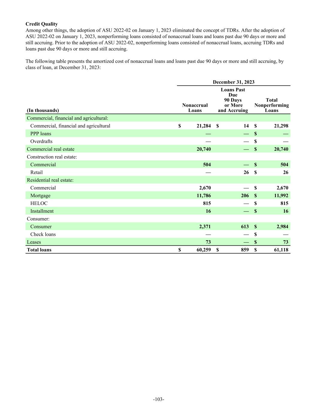 Credit Quality Among other things, the adoption of ASU 2022-02 on January 1, 2023 eliminated the concept of TDRs. After the adoption of ASU 2022-02 on January 1, 2023, nonperforming loans consisted of nonaccrual loans and loans past due 90 days or more and still accruing. Prior to the adoption of ASU 2022-02, nonperforming loans consisted of nonaccrual loans, accruing TDRs and loans past due 90 days or more and still accruing. The following table presents the amortized cost of nonaccrual loans and loans past due 90 days or more and still accruing, by class of loan, at December 31, 2023: December 31, 2023 (In thousands) Nonaccrual Loans Loans Past Due 90 Days or More and Accruing Total Nonperforming Loans Commercial, financial and agricultural: Commercial, financial and agricultural $ 21,284 $ 14 $ 21,298 PPP loans — — $ — Overdrafts — — $ — Commercial real estate 20,740 — $ 20,740 Construction real estate: Commercial 504 — $ 504 Retail — 26 $ 26 Residential real estate: Commercial 2,670 — $ 2,670 Mortgage 11,786 206 $ 11,992 HELOC 815 — $ 815 Installment 16 — $ 16 Consumer: Consumer 2,371 613 $ 2,984 Check loans — — $ — Leases 73 — $ 73 Total loans $ 60,259 $ 859 $ 61,118 -103-