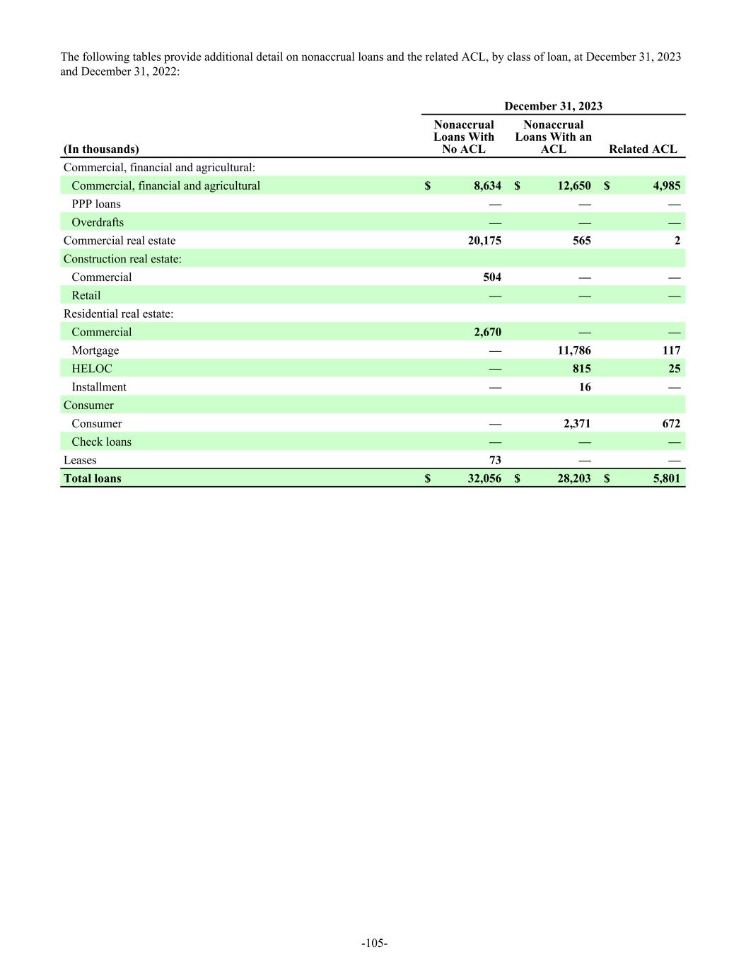 The following tables provide additional detail on nonaccrual loans and the related ACL, by class of loan, at December 31, 2023 and December 31, 2022: December 31, 2023 (In thousands) Nonaccrual Loans With No ACL Nonaccrual Loans With an ACL Related ACL Commercial, financial and agricultural: Commercial, financial and agricultural $ 8,634 $ 12,650 $ 4,985 PPP loans — — — Overdrafts — — — Commercial real estate 20,175 565 2 Construction real estate: Commercial 504 — — Retail — — — Residential real estate: Commercial 2,670 — — Mortgage — 11,786 117 HELOC — 815 25 Installment — 16 — Consumer Consumer — 2,371 672 Check loans — — — Leases 73 — — Total loans $ 32,056 $ 28,203 $ 5,801 -105-