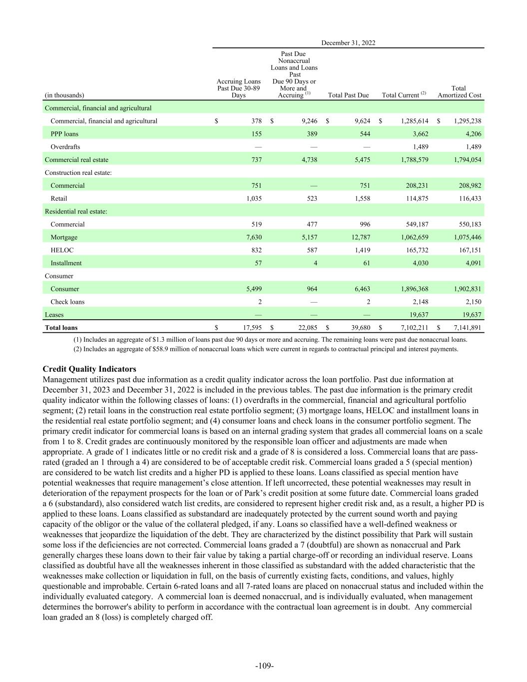 December 31, 2022 (in thousands) Accruing Loans Past Due 30-89 Days Past Due Nonaccrual Loans and Loans Past Due 90 Days or More and Accruing (1) Total Past Due Total Current (2) Total Amortized Cost Commercial, financial and agricultural Commercial, financial and agricultural $ 378 $ 9,246 $ 9,624 $ 1,285,614 $ 1,295,238 PPP loans 155 389 544 3,662 4,206 Overdrafts — — — 1,489 1,489 Commercial real estate 737 4,738 5,475 1,788,579 1,794,054 Construction real estate: Commercial 751 — 751 208,231 208,982 Retail 1,035 523 1,558 114,875 116,433 Residential real estate: Commercial 519 477 996 549,187 550,183 Mortgage 7,630 5,157 12,787 1,062,659 1,075,446 HELOC 832 587 1,419 165,732 167,151 Installment 57 4 61 4,030 4,091 Consumer Consumer 5,499 964 6,463 1,896,368 1,902,831 Check loans 2 — 2 2,148 2,150 Leases — — — 19,637 19,637 Total loans $ 17,595 $ 22,085 $ 39,680 $ 7,102,211 $ 7,141,891 (1) Includes an aggregate of $1.3 million of loans past due 90 days or more and accruing. The remaining loans were past due nonaccrual loans. (2) Includes an aggregate of $58.9 million of nonaccrual loans which were current in regards to contractual principal and interest payments. Credit Quality Indicators Management utilizes past due information as a credit quality indicator across the loan portfolio. Past due information at December 31, 2023 and December 31, 2022 is included in the previous tables. The past due information is the primary credit quality indicator within the following classes of loans: (1) overdrafts in the commercial, financial and agricultural portfolio segment; (2) retail loans in the construction real estate portfolio segment; (3) mortgage loans, HELOC and installment loans in the residential real estate portfolio segment; and (4) consumer loans and check loans in the consumer portfolio segment. The primary credit indicator for commercial loans is based on an internal grading system that grades all commercial loans on a scale from 1 to 8. Credit grades are continuously monitored by the responsible loan officer and adjustments are made when appropriate. A grade of 1 indicates little or no credit risk and a grade of 8 is considered a loss. Commercial loans that are pass- rated (graded an 1 through a 4) are considered to be of acceptable credit risk. Commercial loans graded a 5 (special mention) are considered to be watch list credits and a higher PD is applied to these loans. Loans classified as special mention have potential weaknesses that require management’s close attention. If left uncorrected, these potential weaknesses may result in deterioration of the repayment prospects for the loan or of Park’s credit position at some future date. Commercial loans graded a 6 (substandard), also considered watch list credits, are considered to represent higher credit risk and, as a result, a higher PD is applied to these loans. Loans classified as substandard are inadequately protected by the current sound worth and paying capacity of the obligor or the value of the collateral pledged, if any. Loans so classified have a well-defined weakness or weaknesses that jeopardize the liquidation of the debt. They are characterized by the distinct possibility that Park will sustain some loss if the deficiencies are not corrected. Commercial loans graded a 7 (doubtful) are shown as nonaccrual and Park generally charges these loans down to their fair value by taking a partial charge-off or recording an individual reserve. Loans classified as doubtful have all the weaknesses inherent in those classified as substandard with the added characteristic that the weaknesses make collection or liquidation in full, on the basis of currently existing facts, conditions, and values, highly questionable and improbable. Certain 6-rated loans and all 7-rated loans are placed on nonaccrual status and included within the individually evaluated category. A commercial loan is deemed nonaccrual, and is individually evaluated, when management determines the borrower's ability to perform in accordance with the contractual loan agreement is in doubt. Any commercial loan graded an 8 (loss) is completely charged off. -109-