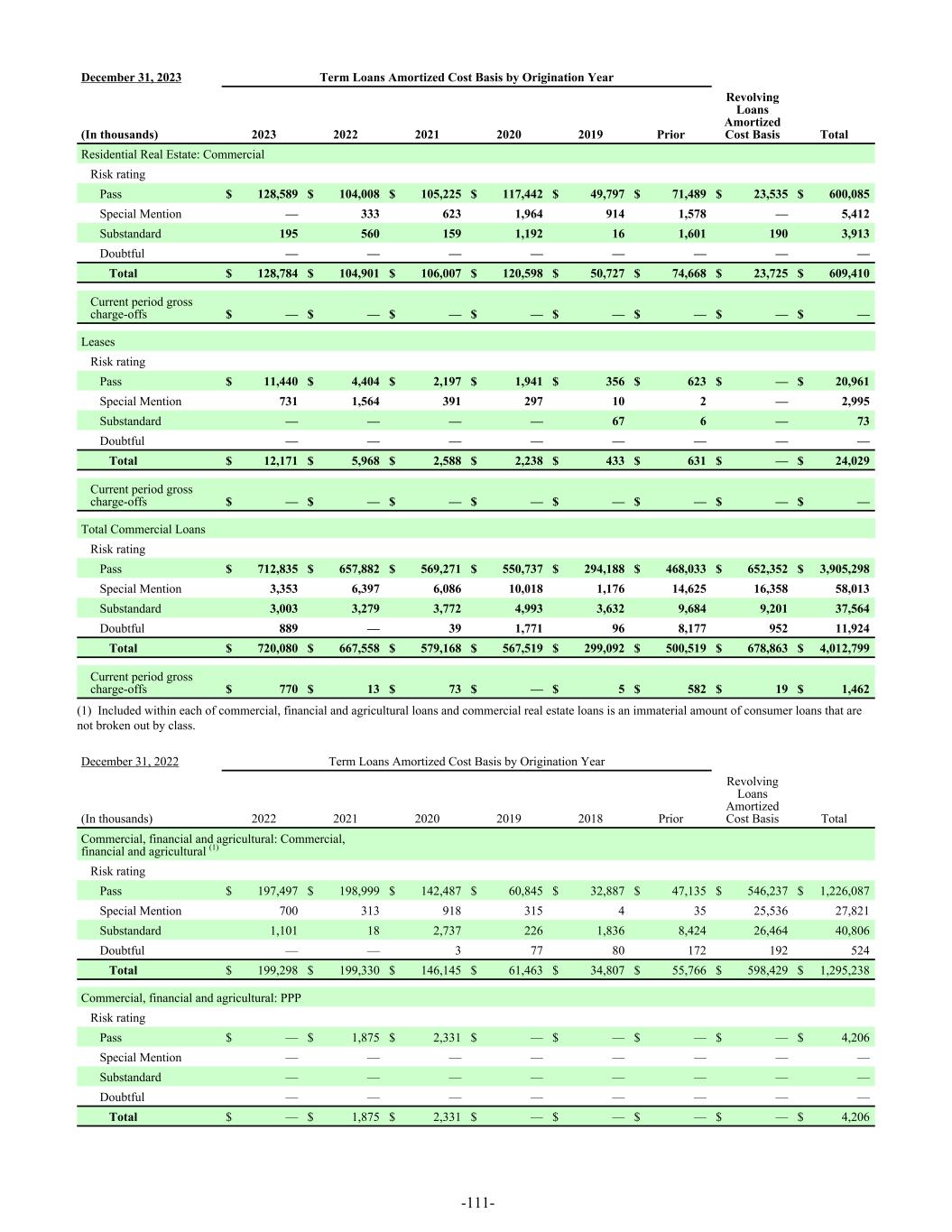 Residential Real Estate: Commercial Risk rating Pass $ 128,589 $ 104,008 $ 105,225 $ 117,442 $ 49,797 $ 71,489 $ 23,535 $ 600,085 Special Mention — 333 623 1,964 914 1,578 — 5,412 Substandard 195 560 159 1,192 16 1,601 190 3,913 Doubtful — — — — — — — — Total $ 128,784 $ 104,901 $ 106,007 $ 120,598 $ 50,727 $ 74,668 $ 23,725 $ 609,410 Current period gross charge-offs $ — $ — $ — $ — $ — $ — $ — $ — December 31, 2023 Term Loans Amortized Cost Basis by Origination Year (In thousands) 2023 2022 2021 2020 2019 Prior Revolving Loans Amortized Cost Basis Total Pass $ 11,440 $ 4,404 $ 2,197 $ 1,941 $ 356 $ 623 $ — $ 20,961 Special Mention 731 1,564 391 297 10 2 — 2,995 Substandard — — — — 67 6 — 73 Doubtful — — — — — — — — Total $ 12,171 $ 5,968 $ 2,588 $ 2,238 $ 433 $ 631 $ — $ 24,029 Current period gross charge-offs $ — $ — $ — $ — $ — $ — $ — $ — Leases Risk rating Pass $ 712,835 $ 657,882 $ 569,271 $ 550,737 $ 294,188 $ 468,033 $ 652,352 $ 3,905,298 Special Mention 3,353 6,397 6,086 10,018 1,176 14,625 16,358 58,013 Substandard 3,003 3,279 3,772 4,993 3,632 9,684 9,201 37,564 Doubtful 889 — 39 1,771 96 8,177 952 11,924 Total $ 720,080 $ 667,558 $ 579,168 $ 567,519 $ 299,092 $ 500,519 $ 678,863 $ 4,012,799 Current period gross charge-offs $ 770 $ 13 $ 73 $ — $ 5 $ 582 $ 19 $ 1,462 Total Commercial Loans Risk rating (1) Included within each of commercial, financial and agricultural loans and commercial real estate loans is an immaterial amount of consumer loans that are not broken out by class. December 31, 2022 Term Loans Amortized Cost Basis by Origination Year (In thousands) 2022 2021 2020 2019 2018 Prior Revolving Loans Amortized Cost Basis Total Commercial, financial and agricultural: Commercial, financial and agricultural (1) Risk rating Pass $ 197,497 $ 198,999 $ 142,487 $ 60,845 $ 32,887 $ 47,135 $ 546,237 $ 1,226,087 Special Mention 700 313 918 315 4 35 25,536 27,821 Substandard 1,101 18 2,737 226 1,836 8,424 26,464 40,806 Doubtful — — 3 77 80 172 192 524 Total $ 199,298 $ 199,330 $ 146,145 $ 61,463 $ 34,807 $ 55,766 $ 598,429 $ 1,295,238 Commercial, financial and agricultural: PPP Risk rating Pass $ — $ 1,875 $ 2,331 $ — $ — $ — $ — $ 4,206 Special Mention — — — — — — — — Substandard — — — — — — — — Doubtful — — — — — — — — Total $ — $ 1,875 $ 2,331 $ — $ — $ — $ — $ 4,206 -111-