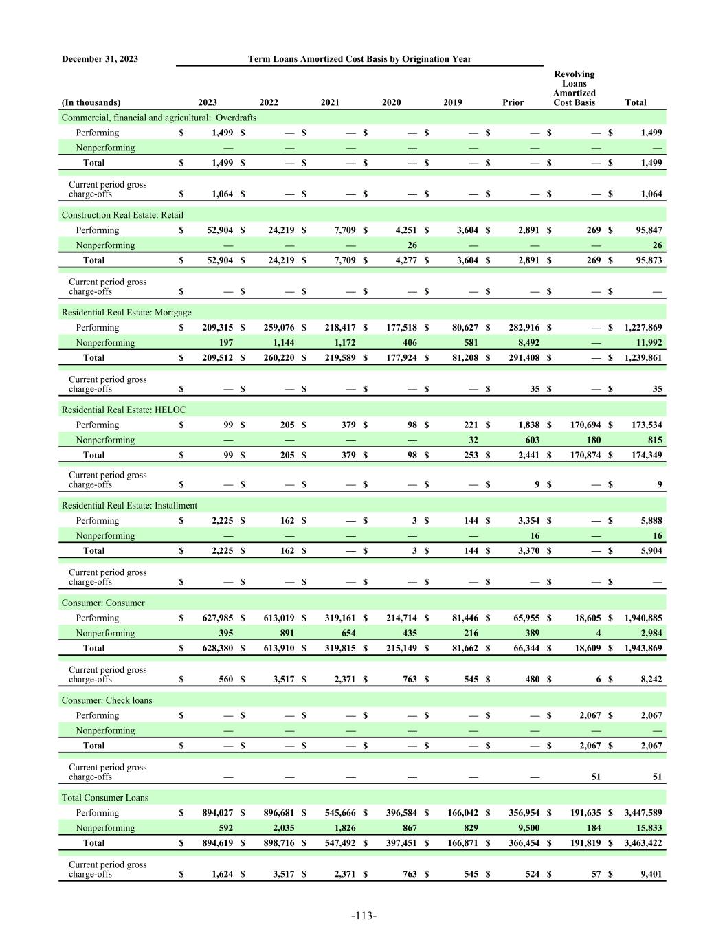 Commercial, financial and agricultural: Overdrafts Performing $ 1,499 $ — $ — $ — $ — $ — $ — $ 1,499 Nonperforming — — — — — — — — Total $ 1,499 $ — $ — $ — $ — $ — $ — $ 1,499 Current period gross charge-offs $ 1,064 $ — $ — $ — $ — $ — $ — $ 1,064 December 31, 2023 Term Loans Amortized Cost Basis by Origination Year (In thousands) 2023 2022 2021 2020 2019 Prior Revolving Loans Amortized Cost Basis Total Nonperforming — — — 26 — — — 26 Total $ 52,904 $ 24,219 $ 7,709 $ 4,277 $ 3,604 $ 2,891 $ 269 $ 95,873 Current period gross charge-offs $ — $ — $ — $ — $ — $ — $ — $ — Construction Real Estate: Retail Performing $ 52,904 $ 24,219 $ 7,709 $ 4,251 $ 3,604 $ 2,891 $ 269 $ 95,847 Nonperforming 197 1,144 1,172 406 581 8,492 — 11,992 Total $ 209,512 $ 260,220 $ 219,589 $ 177,924 $ 81,208 $ 291,408 $ — $ 1,239,861 Current period gross charge-offs $ — $ — $ — $ — $ — $ 35 $ — $ 35 Residential Real Estate: Mortgage Performing $ 209,315 $ 259,076 $ 218,417 $ 177,518 $ 80,627 $ 282,916 $ — $ 1,227,869 Residential Real Estate: HELOC Performing $ 99 $ 205 $ 379 $ 98 $ 221 $ 1,838 $ 170,694 $ 173,534 Nonperforming — — — — 32 603 180 815 Total $ 99 $ 205 $ 379 $ 98 $ 253 $ 2,441 $ 170,874 $ 174,349 Current period gross charge-offs $ — $ — $ — $ — $ — $ 9 $ — $ 9 Nonperforming — — — — — 16 — 16 Total $ 2,225 $ 162 $ — $ 3 $ 144 $ 3,370 $ — $ 5,904 Current period gross charge-offs $ — $ — $ — $ — $ — $ — $ — $ — Residential Real Estate: Installment Performing $ 2,225 $ 162 $ — $ 3 $ 144 $ 3,354 $ — $ 5,888 Nonperforming 395 891 654 435 216 389 4 2,984 Total $ 628,380 $ 613,910 $ 319,815 $ 215,149 $ 81,662 $ 66,344 $ 18,609 $ 1,943,869 Current period gross charge-offs $ 560 $ 3,517 $ 2,371 $ 763 $ 545 $ 480 $ 6 $ 8,242 Consumer: Consumer Performing $ 627,985 $ 613,019 $ 319,161 $ 214,714 $ 81,446 $ 65,955 $ 18,605 $ 1,940,885 Consumer: Check loans Performing $ — $ — $ — $ — $ — $ — $ 2,067 $ 2,067 Nonperforming — — — — — — — — Total $ — $ — $ — $ — $ — $ — $ 2,067 $ 2,067 Current period gross charge-offs — — — — — — 51 51 Total Consumer Loans Performing $ 894,027 $ 896,681 $ 545,666 $ 396,584 $ 166,042 $ 356,954 $ 191,635 $ 3,447,589 Nonperforming 592 2,035 1,826 867 829 9,500 184 15,833 Total $ 894,619 $ 898,716 $ 547,492 $ 397,451 $ 166,871 $ 366,454 $ 191,819 $ 3,463,422 Current period gross charge-offs $ 1,624 $ 3,517 $ 2,371 $ 763 $ 545 $ 524 $ 57 $ 9,401 -113-