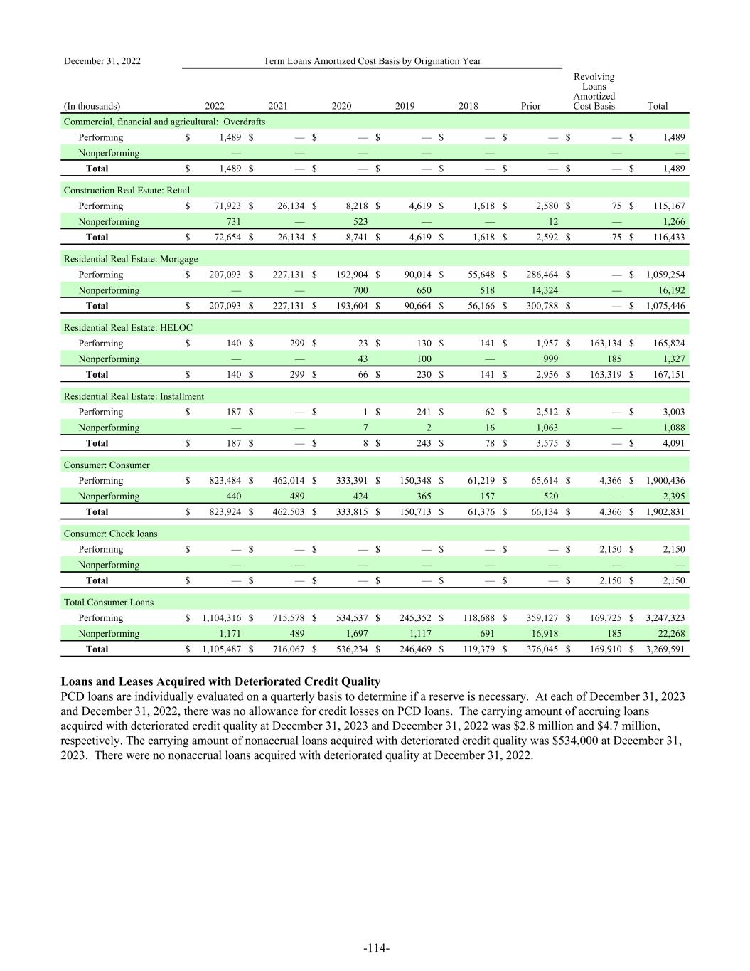 December 31, 2022 Term Loans Amortized Cost Basis by Origination Year (In thousands) 2022 2021 2020 2019 2018 Prior Revolving Loans Amortized Cost Basis Total Commercial, financial and agricultural: Overdrafts Performing $ 1,489 $ — $ — $ — $ — $ — $ — $ 1,489 Nonperforming — — — — — — — — Total $ 1,489 $ — $ — $ — $ — $ — $ — $ 1,489 Construction Real Estate: Retail Performing $ 71,923 $ 26,134 $ 8,218 $ 4,619 $ 1,618 $ 2,580 $ 75 $ 115,167 Nonperforming 731 — 523 — — 12 — 1,266 Total $ 72,654 $ 26,134 $ 8,741 $ 4,619 $ 1,618 $ 2,592 $ 75 $ 116,433 Residential Real Estate: Mortgage Performing $ 207,093 $ 227,131 $ 192,904 $ 90,014 $ 55,648 $ 286,464 $ — $ 1,059,254 Nonperforming — — 700 650 518 14,324 — 16,192 Total $ 207,093 $ 227,131 $ 193,604 $ 90,664 $ 56,166 $ 300,788 $ — $ 1,075,446 Residential Real Estate: HELOC Performing $ 140 $ 299 $ 23 $ 130 $ 141 $ 1,957 $ 163,134 $ 165,824 Nonperforming — — 43 100 — 999 185 1,327 Total $ 140 $ 299 $ 66 $ 230 $ 141 $ 2,956 $ 163,319 $ 167,151 Residential Real Estate: Installment Performing $ 187 $ — $ 1 $ 241 $ 62 $ 2,512 $ — $ 3,003 Nonperforming — — 7 2 16 1,063 — 1,088 Total $ 187 $ — $ 8 $ 243 $ 78 $ 3,575 $ — $ 4,091 Consumer: Consumer Performing $ 823,484 $ 462,014 $ 333,391 $ 150,348 $ 61,219 $ 65,614 $ 4,366 $ 1,900,436 Nonperforming 440 489 424 365 157 520 — 2,395 Total $ 823,924 $ 462,503 $ 333,815 $ 150,713 $ 61,376 $ 66,134 $ 4,366 $ 1,902,831 Consumer: Check loans Performing $ — $ — $ — $ — $ — $ — $ 2,150 $ 2,150 Nonperforming — — — — — — — — Total $ — $ — $ — $ — $ — $ — $ 2,150 $ 2,150 Total Consumer Loans Performing $ 1,104,316 $ 715,578 $ 534,537 $ 245,352 $ 118,688 $ 359,127 $ 169,725 $ 3,247,323 Nonperforming 1,171 489 1,697 1,117 691 16,918 185 22,268 Total $ 1,105,487 $ 716,067 $ 536,234 $ 246,469 $ 119,379 $ 376,045 $ 169,910 $ 3,269,591 Loans and Leases Acquired with Deteriorated Credit Quality PCD loans are individually evaluated on a quarterly basis to determine if a reserve is necessary. At each of December 31, 2023 and December 31, 2022, there was no allowance for credit losses on PCD loans. The carrying amount of accruing loans acquired with deteriorated credit quality at December 31, 2023 and December 31, 2022 was $2.8 million and $4.7 million, respectively. The carrying amount of nonaccrual loans acquired with deteriorated credit quality was $534,000 at December 31, 2023. There were no nonaccrual loans acquired with deteriorated quality at December 31, 2022. -114-