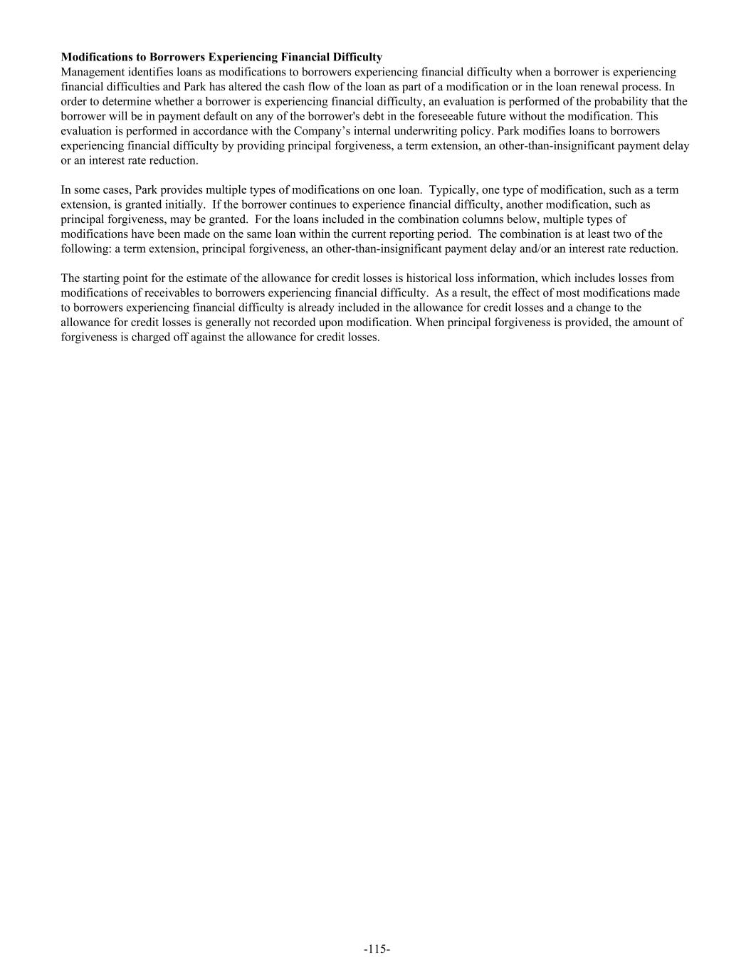 Modifications to Borrowers Experiencing Financial Difficulty Management identifies loans as modifications to borrowers experiencing financial difficulty when a borrower is experiencing financial difficulties and Park has altered the cash flow of the loan as part of a modification or in the loan renewal process. In order to determine whether a borrower is experiencing financial difficulty, an evaluation is performed of the probability that the borrower will be in payment default on any of the borrower's debt in the foreseeable future without the modification. This evaluation is performed in accordance with the Company’s internal underwriting policy. Park modifies loans to borrowers experiencing financial difficulty by providing principal forgiveness, a term extension, an other-than-insignificant payment delay or an interest rate reduction. In some cases, Park provides multiple types of modifications on one loan. Typically, one type of modification, such as a term extension, is granted initially. If the borrower continues to experience financial difficulty, another modification, such as principal forgiveness, may be granted. For the loans included in the combination columns below, multiple types of modifications have been made on the same loan within the current reporting period. The combination is at least two of the following: a term extension, principal forgiveness, an other-than-insignificant payment delay and/or an interest rate reduction. The starting point for the estimate of the allowance for credit losses is historical loss information, which includes losses from modifications of receivables to borrowers experiencing financial difficulty. As a result, the effect of most modifications made to borrowers experiencing financial difficulty is already included in the allowance for credit losses and a change to the allowance for credit losses is generally not recorded upon modification. When principal forgiveness is provided, the amount of forgiveness is charged off against the allowance for credit losses. -115-