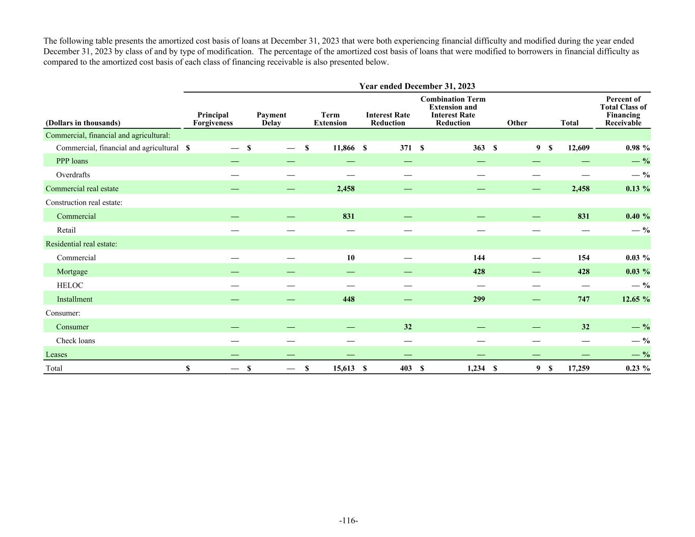 The following table presents the amortized cost basis of loans at December 31, 2023 that were both experiencing financial difficulty and modified during the year ended December 31, 2023 by class of and by type of modification. The percentage of the amortized cost basis of loans that were modified to borrowers in financial difficulty as compared to the amortized cost basis of each class of financing receivable is also presented below. Year ended December 31, 2023 (Dollars in thousands) Principal Forgiveness Payment Delay Term Extension Interest Rate Reduction Combination Term Extension and Interest Rate Reduction Other Total Percent of Total Class of Financing Receivable Commercial, financial and agricultural: Commercial, financial and agricultural $ — $ — $ 11,866 $ 371 $ 363 $ 9 $ 12,609 0.98 % PPP loans — — — — — — — — % Overdrafts — — — — — — — — % Commercial real estate — — 2,458 — — — 2,458 0.13 % Construction real estate: Commercial — — 831 — — — 831 0.40 % Retail — — — — — — — — % Residential real estate: Commercial — — 10 — 144 — 154 0.03 % Mortgage — — — — 428 — 428 0.03 % HELOC — — — — — — — — % Installment — — 448 — 299 — 747 12.65 % Consumer: Consumer — — — 32 — — 32 — % Check loans — — — — — — — — % Leases — — — — — — — — % Total $ — $ — $ 15,613 $ 403 $ 1,234 $ 9 $ 17,259 0.23 % -116-