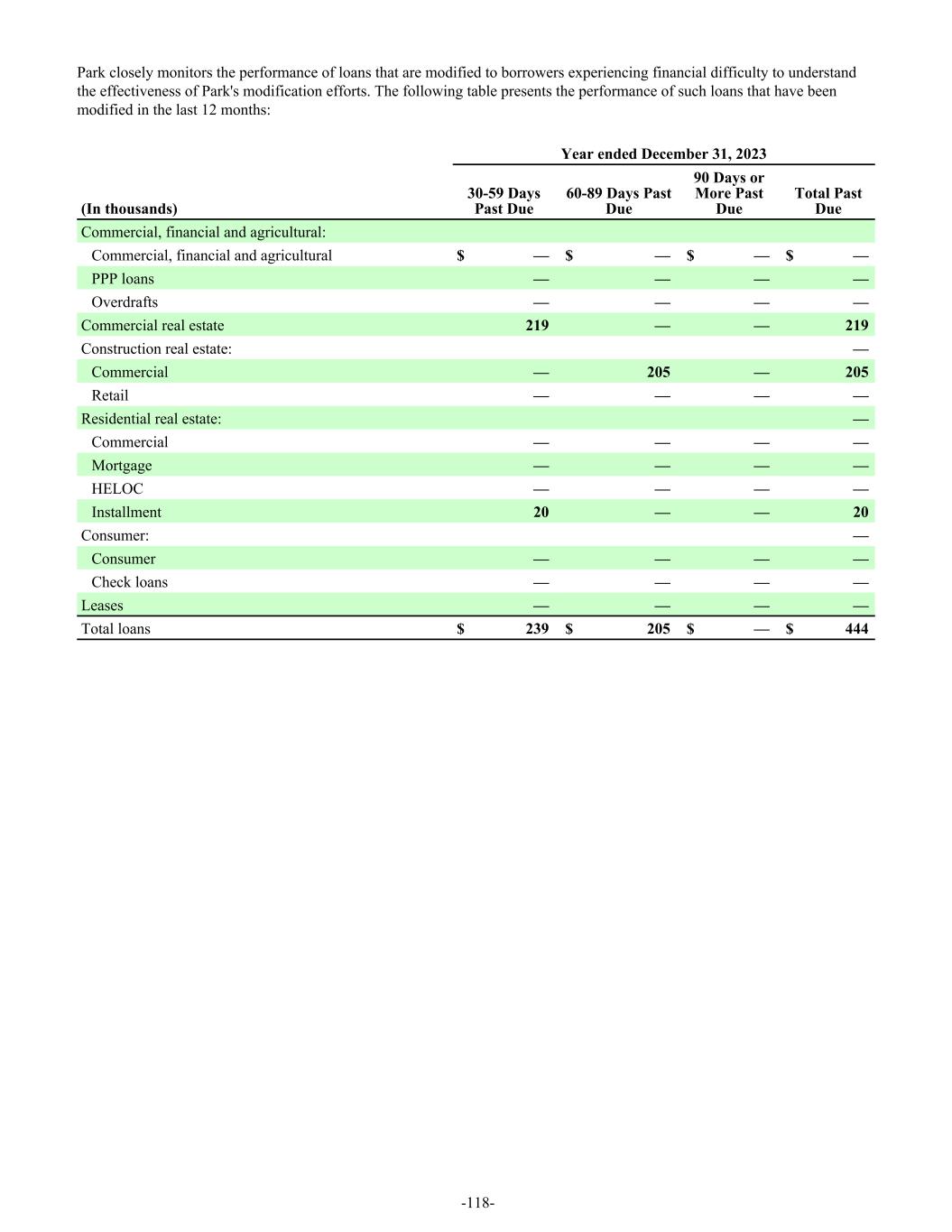 Park closely monitors the performance of loans that are modified to borrowers experiencing financial difficulty to understand the effectiveness of Park's modification efforts. The following table presents the performance of such loans that have been modified in the last 12 months: Year ended December 31, 2023 (In thousands) 30-59 Days Past Due 60-89 Days Past Due 90 Days or More Past Due Total Past Due Commercial, financial and agricultural: Commercial, financial and agricultural $ — $ — $ — $ — PPP loans — — — — Overdrafts — — — — Commercial real estate 219 — — 219 Construction real estate: — Commercial — 205 — 205 Retail — — — — Residential real estate: — Commercial — — — — Mortgage — — — — HELOC — — — — Installment 20 — — 20 Consumer: — Consumer — — — — Check loans — — — — Leases — — — — Total loans $ 239 $ 205 $ — $ 444 -118-