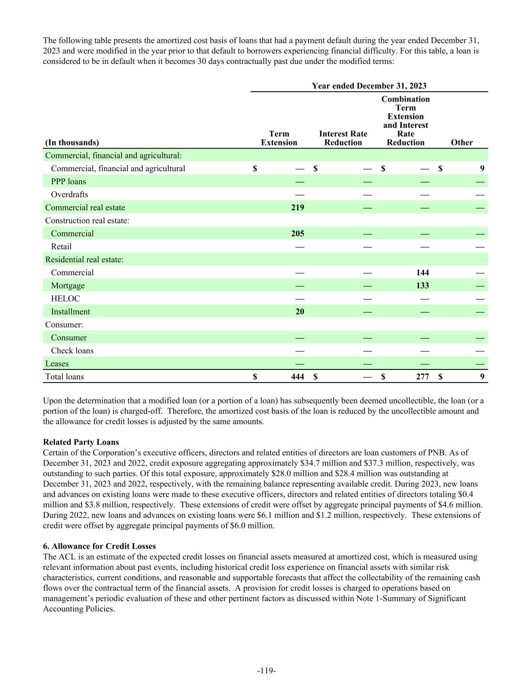 The following table presents the amortized cost basis of loans that had a payment default during the year ended December 31, 2023 and were modified in the year prior to that default to borrowers experiencing financial difficulty. For this table, a loan is considered to be in default when it becomes 30 days contractually past due under the modified terms: Year ended December 31, 2023 (In thousands) Term Extension Interest Rate Reduction Combination Term Extension and Interest Rate Reduction Other Commercial, financial and agricultural: Commercial, financial and agricultural $ — $ — $ — $ 9 PPP loans — — — — Overdrafts — — — — Commercial real estate 219 — — — Construction real estate: Commercial 205 — — — Retail — — — — Residential real estate: Commercial — — 144 — Mortgage — — 133 — HELOC — — — — Installment 20 — — — Consumer: Consumer — — — — Check loans — — — — Leases — — — — Total loans $ 444 $ — $ 277 $ 9 Upon the determination that a modified loan (or a portion of a loan) has subsequently been deemed uncollectible, the loan (or a portion of the loan) is charged-off. Therefore, the amortized cost basis of the loan is reduced by the uncollectible amount and the allowance for credit losses is adjusted by the same amounts. Related Party Loans Certain of the Corporation’s executive officers, directors and related entities of directors are loan customers of PNB. As of December 31, 2023 and 2022, credit exposure aggregating approximately $34.7 million and $37.3 million, respectively, was outstanding to such parties. Of this total exposure, approximately $28.0 million and $28.4 million was outstanding at December 31, 2023 and 2022, respectively, with the remaining balance representing available credit. During 2023, new loans and advances on existing loans were made to these executive officers, directors and related entities of directors totaling $0.4 million and $3.8 million, respectively. These extensions of credit were offset by aggregate principal payments of $4.6 million. During 2022, new loans and advances on existing loans were $6.1 million and $1.2 million, respectively. These extensions of credit were offset by aggregate principal payments of $6.0 million. 6. Allowance for Credit Losses The ACL is an estimate of the expected credit losses on financial assets measured at amortized cost, which is measured using relevant information about past events, including historical credit loss experience on financial assets with similar risk characteristics, current conditions, and reasonable and supportable forecasts that affect the collectability of the remaining cash flows over the contractual term of the financial assets. A provision for credit losses is charged to operations based on management’s periodic evaluation of these and other pertinent factors as discussed within Note 1-Summary of Significant Accounting Policies. -119-