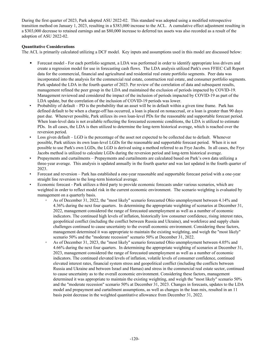 During the first quarter of 2023, Park adopted ASU 2022-02. This standard was adopted using a modified retrospective transition method on January 1, 2023, resulting in a $383,000 increase to the ACL. A cumulative effect adjustment resulting in a $303,000 decrease to retained earnings and an $80,000 increase to deferred tax assets was also recorded as a result of the adoption of ASU 2022-02. Quantitative Considerations The ACL is primarily calculated utilizing a DCF model. Key inputs and assumptions used in this model are discussed below: • Forecast model - For each portfolio segment, a LDA was performed in order to identify appropriate loss drivers and create a regression model for use in forecasting cash flows. The LDA analysis utilized Park's own FFIEC Call Report data for the commercial, financial and agricultural and residential real estate portfolio segments. Peer data was incorporated into the analysis for the commercial real estate, construction real estate, and consumer portfolio segments. Park updated the LDA in the fourth quarter of 2023. Per review of the correlation of data and subsequent results, management refined the peer group in the LDA and maintained the exclusion of periods impacted by COVID-19. Management reviewed and considered the impact of the inclusion of periods impacted by COVID-19 as part of the LDA update, but the correlation of the inclusion of COVID-19 periods was lower. • Probability of default – PD is the probability that an asset will be in default within a given time frame. Park has defined default to be when a charge-off has occurred, a loan is placed on nonaccrual, or a loan is greater than 90 days past due. Whenever possible, Park utilizes its own loan-level PDs for the reasonable and supportable forecast period. When loan-level data is not available reflecting the forecasted economic conditions, the LDA is utilized to estimate PDs. In all cases, the LDA is then utilized to determine the long-term historical average, which is reached over the reversion period. • Loss given default – LGD is the percentage of the asset not expected to be collected due to default. Whenever possible, Park utilizes its own loan-level LGDs for the reasonable and supportable forecast period. When it is not possible to use Park's own LGDs, the LGD is derived using a method referred to as Frye Jacobs. In all cases, the Frye Jacobs method is utilized to calculate LGDs during the reversion period and long-term historical average. • Prepayments and curtailments – Prepayments and curtailments are calculated based on Park’s own data utilizing a three-year average. This analysis is updated annually in the fourth quarter and was last updated in the fourth quarter of 2023. • Forecast and reversion – Park has established a one-year reasonable and supportable forecast period with a one-year straight line reversion to the long-term historical average. • Economic forecast - Park utilizes a third party to provide economic forecasts under various scenarios, which are weighted in order to reflect model risk in the current economic environment. The scenario weighting is evaluated by management on a quarterly basis. ◦ As of December 31, 2022, the "most likely" scenario forecasted Ohio unemployment between 4.14% and 4.36% during the next four quarters. In determining the appropriate weighting of scenarios at December 31, 2022, management considered the range of forecasted unemployment as well as a number of economic indicators. The continued high levels of inflation, historically low consumer confidence, rising interest rates, geopolitical conflict (including the conflict between Russia and Ukraine), and workforce and supply chain challenges continued to cause uncertainty to the overall economic environment. Considering these factors, management determined it was appropriate to maintain the existing weighting, and weigh the "most likely" scenario 50% and the "moderate recession" scenario 50% at December 31, 2022. ◦ As of December 31, 2023, the "most likely" scenario forecasted Ohio unemployment between 4.05% and 4.66% during the next four quarters. In determining the appropriate weighting of scenarios at December 31, 2023, management considered the range of forecasted unemployment as well as a number of economic indicators. The continued elevated levels of inflation, volatile levels of consumer confidence, continued elevated interest rates, financial system stress and geopolitical conflict (including the conflicts between Russia and Ukraine and between Israel and Hamas) and stress in the commercial real estate sector, continued to cause uncertainty as to the overall economic environment. Considering these factors, management determined it was appropriate to maintain the existing weighting, and weigh the "most likely" scenario 50% and the "moderate recession" scenario 50% at December 31, 2023. Changes in forecasts, updates to the LDA model and prepayment and curtailment assumptions, as well as changes in the loan mix, resulted in an 11 basis point decrease in the weighted quantitative allowance from December 31, 2022. -120-
