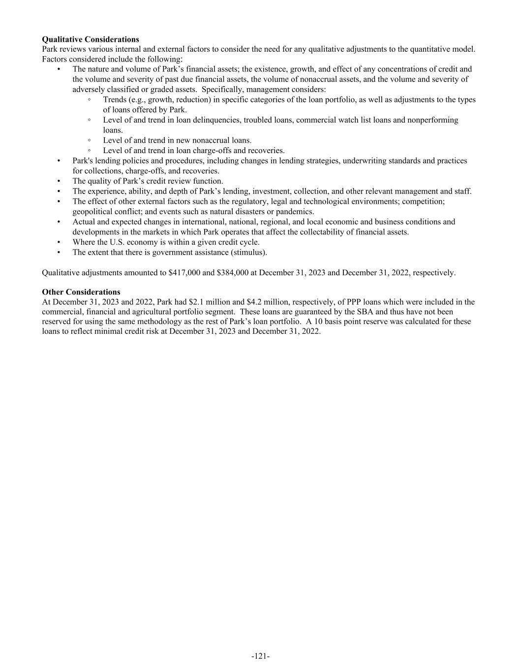 Qualitative Considerations Park reviews various internal and external factors to consider the need for any qualitative adjustments to the quantitative model. Factors considered include the following: • The nature and volume of Park’s financial assets; the existence, growth, and effect of any concentrations of credit and the volume and severity of past due financial assets, the volume of nonaccrual assets, and the volume and severity of adversely classified or graded assets. Specifically, management considers: ◦ Trends (e.g., growth, reduction) in specific categories of the loan portfolio, as well as adjustments to the types of loans offered by Park. ◦ Level of and trend in loan delinquencies, troubled loans, commercial watch list loans and nonperforming loans. ◦ Level of and trend in new nonaccrual loans. ◦ Level of and trend in loan charge-offs and recoveries. • Park's lending policies and procedures, including changes in lending strategies, underwriting standards and practices for collections, charge-offs, and recoveries. • The quality of Park’s credit review function. • The experience, ability, and depth of Park’s lending, investment, collection, and other relevant management and staff. • The effect of other external factors such as the regulatory, legal and technological environments; competition; geopolitical conflict; and events such as natural disasters or pandemics. • Actual and expected changes in international, national, regional, and local economic and business conditions and developments in the markets in which Park operates that affect the collectability of financial assets. • Where the U.S. economy is within a given credit cycle. • The extent that there is government assistance (stimulus). Qualitative adjustments amounted to $417,000 and $384,000 at December 31, 2023 and December 31, 2022, respectively. Other Considerations At December 31, 2023 and 2022, Park had $2.1 million and $4.2 million, respectively, of PPP loans which were included in the commercial, financial and agricultural portfolio segment. These loans are guaranteed by the SBA and thus have not been reserved for using the same methodology as the rest of Park’s loan portfolio. A 10 basis point reserve was calculated for these loans to reflect minimal credit risk at December 31, 2023 and December 31, 2022. -121-