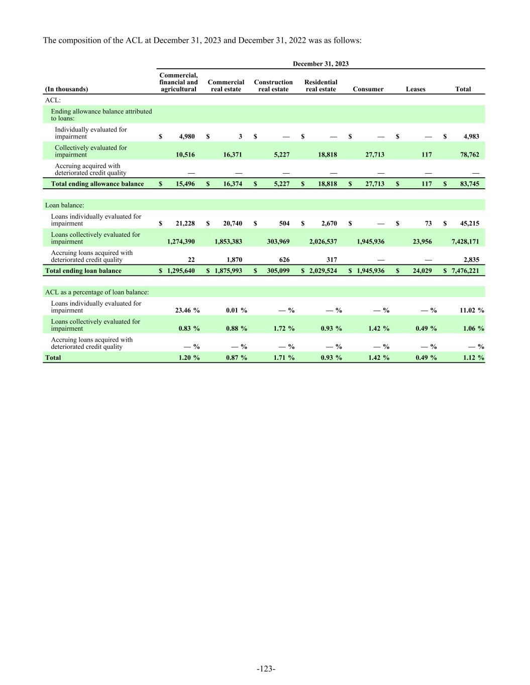 The composition of the ACL at December 31, 2023 and December 31, 2022 was as follows: December 31, 2023 (In thousands) Commercial, financial and agricultural Commercial real estate Construction real estate Residential real estate Consumer Leases Total ACL: Ending allowance balance attributed to loans: Individually evaluated for impairment $ 4,980 $ 3 $ — $ — $ — $ — $ 4,983 Collectively evaluated for impairment 10,516 16,371 5,227 18,818 27,713 117 78,762 Accruing acquired with deteriorated credit quality — — — — — — — Total ending allowance balance $ 15,496 $ 16,374 $ 5,227 $ 18,818 $ 27,713 $ 117 $ 83,745 Loan balance: Loans individually evaluated for impairment $ 21,228 $ 20,740 $ 504 $ 2,670 $ — $ 73 $ 45,215 Loans collectively evaluated for impairment 1,274,390 1,853,383 303,969 2,026,537 1,945,936 23,956 7,428,171 Accruing loans acquired with deteriorated credit quality 22 1,870 626 317 — — 2,835 Total ending loan balance $ 1,295,640 $ 1,875,993 $ 305,099 $ 2,029,524 $ 1,945,936 $ 24,029 $ 7,476,221 ACL as a percentage of loan balance: Loans individually evaluated for impairment 23.46 % 0.01 % — % — % — % — % 11.02 % Loans collectively evaluated for impairment 0.83 % 0.88 % 1.72 % 0.93 % 1.42 % 0.49 % 1.06 % Accruing loans acquired with deteriorated credit quality — % — % — % — % — % — % — % Total 1.20 % 0.87 % 1.71 % 0.93 % 1.42 % 0.49 % 1.12 % -123-
