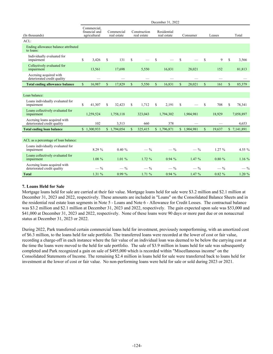 December 31, 2022 (In thousands) Commercial, financial and agricultural Commercial real estate Construction real estate Residential real estate Consumer Leases Total ACL: Ending allowance balance attributed to loans: Individually evaluated for impairment $ 3,426 $ 131 $ — $ — $ — $ 9 $ 3,566 Collectively evaluated for impairment 13,561 17,698 5,550 16,831 28,021 152 81,813 Accruing acquired with deteriorated credit quality — — — — — — — Total ending allowance balance $ 16,987 $ 17,829 $ 5,550 $ 16,831 $ 28,021 $ 161 $ 85,379 Loan balance: Loans individually evaluated for impairment $ 41,307 $ 32,423 $ 1,712 $ 2,191 $ — $ 708 $ 78,341 Loans collectively evaluated for impairment 1,259,524 1,758,118 323,043 1,794,302 1,904,981 18,929 7,058,897 Accruing loans acquired with deteriorated credit quality 102 3,513 660 378 — — 4,653 Total ending loan balance $ 1,300,933 $ 1,794,054 $ 325,415 $ 1,796,871 $ 1,904,981 $ 19,637 $ 7,141,891 ACL as a percentage of loan balance: Loans individually evaluated for impairment 8.29 % 0.40 % — % — % — % 1.27 % 4.55 % Loans collectively evaluated for impairment 1.08 % 1.01 % 1.72 % 0.94 % 1.47 % 0.80 % 1.16 % Accruing loans acquired with deteriorated credit quality — % — % — % — % — % — % — % Total 1.31 % 0.99 % 1.71 % 0.94 % 1.47 % 0.82 % 1.20 % 7. Loans Held for Sale Mortgage loans held for sale are carried at their fair value. Mortgage loans held for sale were $3.2 million and $2.1 million at December 31, 2023 and 2022, respectively. These amounts are included in "Loans" on the Consolidated Balance Sheets and in the residential real estate loan segments in Note 5 - Loans and Note 6 - Allowance for Credit Losses. The contractual balance was $3.2 million and $2.1 million at December 31, 2023 and 2022, respectively. The gain expected upon sale was $53,000 and $41,000 at December 31, 2023 and 2022, respectively. None of these loans were 90 days or more past due or on nonaccrual status at December 31, 2023 or 2022. During 2022, Park transferred certain commercial loans held for investment, previously nonperforming, with an amortized cost of $6.3 million, to the loans held for sale portfolio. The transferred loans were recorded at the lower of cost or fair value, recording a charge-off in each instance where the fair value of an individual loan was deemed to be below the carrying cost at the time the loans were moved to the held for sale portfolio. The sale of $3.9 million in loans held for sale was subsequently completed and Park recognized a gain on sale of $495,000 which is recorded within "Miscellaneous income" on the Consolidated Statements of Income. The remaining $2.4 million in loans held for sale were transferred back to loans held for investment at the lower of cost or fair value. No non-performing loans were held for sale or sold during 2023 or 2021. -124-