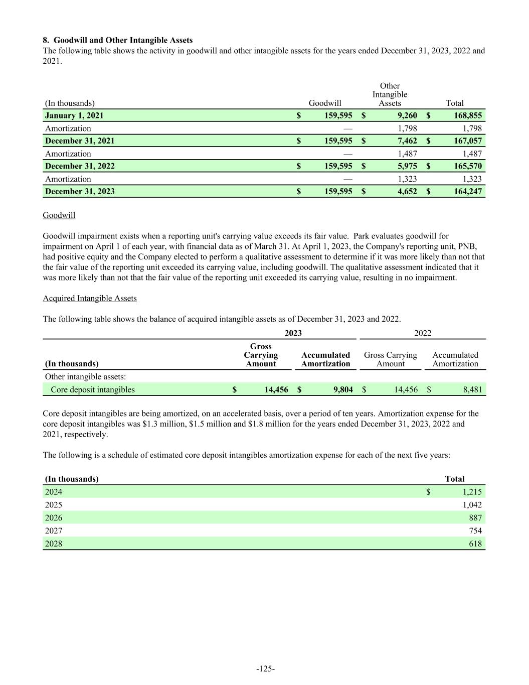 8. Goodwill and Other Intangible Assets The following table shows the activity in goodwill and other intangible assets for the years ended December 31, 2023, 2022 and 2021. (In thousands) Goodwill Other Intangible Assets Total January 1, 2021 $ 159,595 $ 9,260 $ 168,855 Amortization — 1,798 1,798 December 31, 2021 $ 159,595 $ 7,462 $ 167,057 Amortization — 1,487 1,487 December 31, 2022 $ 159,595 $ 5,975 $ 165,570 Amortization — 1,323 1,323 December 31, 2023 $ 159,595 $ 4,652 $ 164,247 Goodwill Goodwill impairment exists when a reporting unit's carrying value exceeds its fair value. Park evaluates goodwill for impairment on April 1 of each year, with financial data as of March 31. At April 1, 2023, the Company's reporting unit, PNB, had positive equity and the Company elected to perform a qualitative assessment to determine if it was more likely than not that the fair value of the reporting unit exceeded its carrying value, including goodwill. The qualitative assessment indicated that it was more likely than not that the fair value of the reporting unit exceeded its carrying value, resulting in no impairment. Acquired Intangible Assets The following table shows the balance of acquired intangible assets as of December 31, 2023 and 2022. 2023 2022 (In thousands) Gross Carrying Amount Accumulated Amortization Gross Carrying Amount Accumulated Amortization Other intangible assets: Core deposit intangibles $ 14,456 $ 9,804 $ 14,456 $ 8,481 Core deposit intangibles are being amortized, on an accelerated basis, over a period of ten years. Amortization expense for the core deposit intangibles was $1.3 million, $1.5 million and $1.8 million for the years ended December 31, 2023, 2022 and 2021, respectively. The following is a schedule of estimated core deposit intangibles amortization expense for each of the next five years: (In thousands) Total 2024 $ 1,215 2025 1,042 2026 887 2027 754 2028 618 -125-