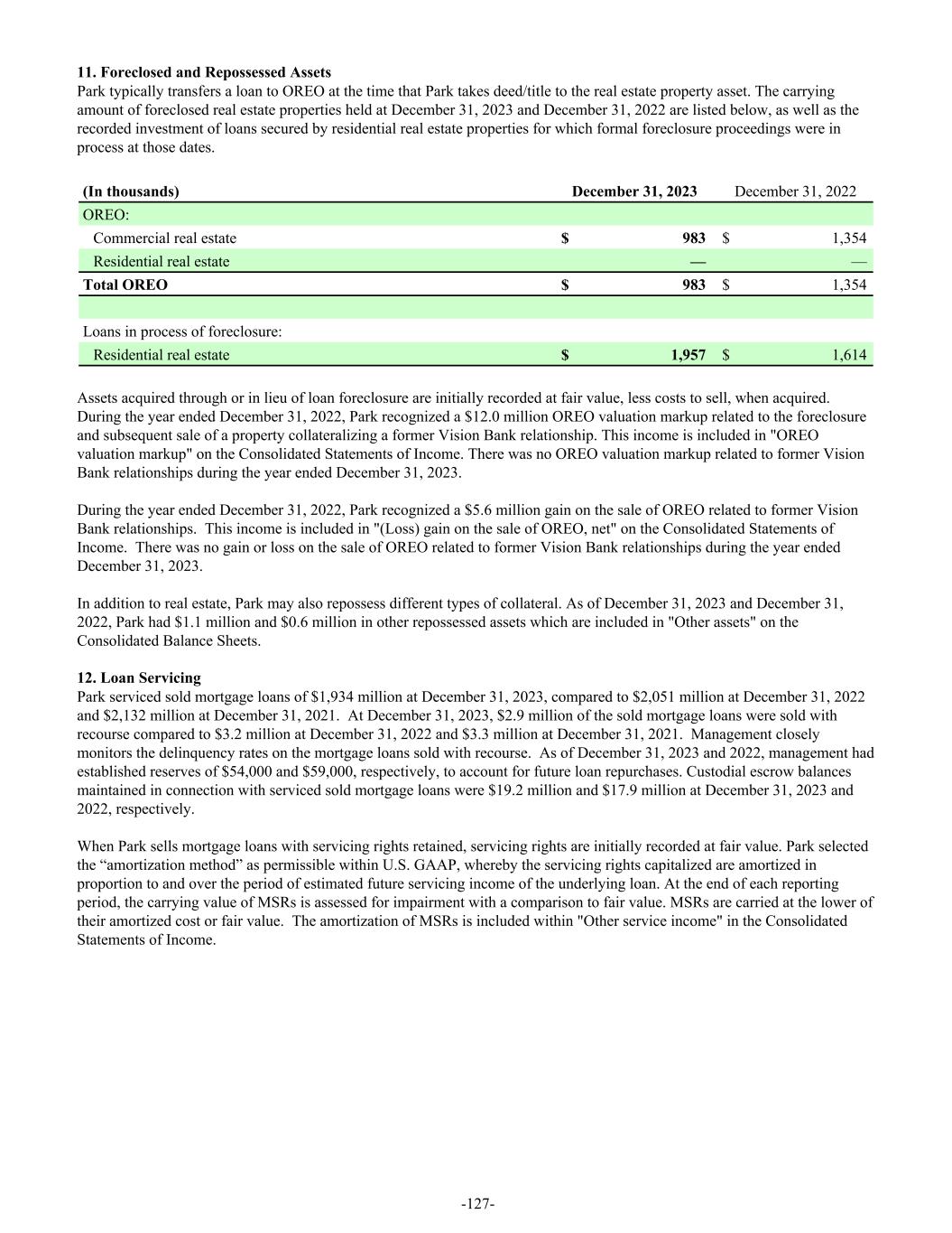 11. Foreclosed and Repossessed Assets Park typically transfers a loan to OREO at the time that Park takes deed/title to the real estate property asset. The carrying amount of foreclosed real estate properties held at December 31, 2023 and December 31, 2022 are listed below, as well as the recorded investment of loans secured by residential real estate properties for which formal foreclosure proceedings were in process at those dates. (In thousands) December 31, 2023 December 31, 2022 OREO: Commercial real estate $ 983 $ 1,354 Residential real estate — — Total OREO $ 983 $ 1,354 Loans in process of foreclosure: Residential real estate $ 1,957 $ 1,614 Assets acquired through or in lieu of loan foreclosure are initially recorded at fair value, less costs to sell, when acquired. During the year ended December 31, 2022, Park recognized a $12.0 million OREO valuation markup related to the foreclosure and subsequent sale of a property collateralizing a former Vision Bank relationship. This income is included in "OREO valuation markup" on the Consolidated Statements of Income. There was no OREO valuation markup related to former Vision Bank relationships during the year ended December 31, 2023. During the year ended December 31, 2022, Park recognized a $5.6 million gain on the sale of OREO related to former Vision Bank relationships. This income is included in "(Loss) gain on the sale of OREO, net" on the Consolidated Statements of Income. There was no gain or loss on the sale of OREO related to former Vision Bank relationships during the year ended December 31, 2023. In addition to real estate, Park may also repossess different types of collateral. As of December 31, 2023 and December 31, 2022, Park had $1.1 million and $0.6 million in other repossessed assets which are included in "Other assets" on the Consolidated Balance Sheets. 12. Loan Servicing Park serviced sold mortgage loans of $1,934 million at December 31, 2023, compared to $2,051 million at December 31, 2022 and $2,132 million at December 31, 2021. At December 31, 2023, $2.9 million of the sold mortgage loans were sold with recourse compared to $3.2 million at December 31, 2022 and $3.3 million at December 31, 2021. Management closely monitors the delinquency rates on the mortgage loans sold with recourse. As of December 31, 2023 and 2022, management had established reserves of $54,000 and $59,000, respectively, to account for future loan repurchases. Custodial escrow balances maintained in connection with serviced sold mortgage loans were $19.2 million and $17.9 million at December 31, 2023 and 2022, respectively. When Park sells mortgage loans with servicing rights retained, servicing rights are initially recorded at fair value. Park selected the “amortization method” as permissible within U.S. GAAP, whereby the servicing rights capitalized are amortized in proportion to and over the period of estimated future servicing income of the underlying loan. At the end of each reporting period, the carrying value of MSRs is assessed for impairment with a comparison to fair value. MSRs are carried at the lower of their amortized cost or fair value. The amortization of MSRs is included within "Other service income" in the Consolidated Statements of Income. -127-