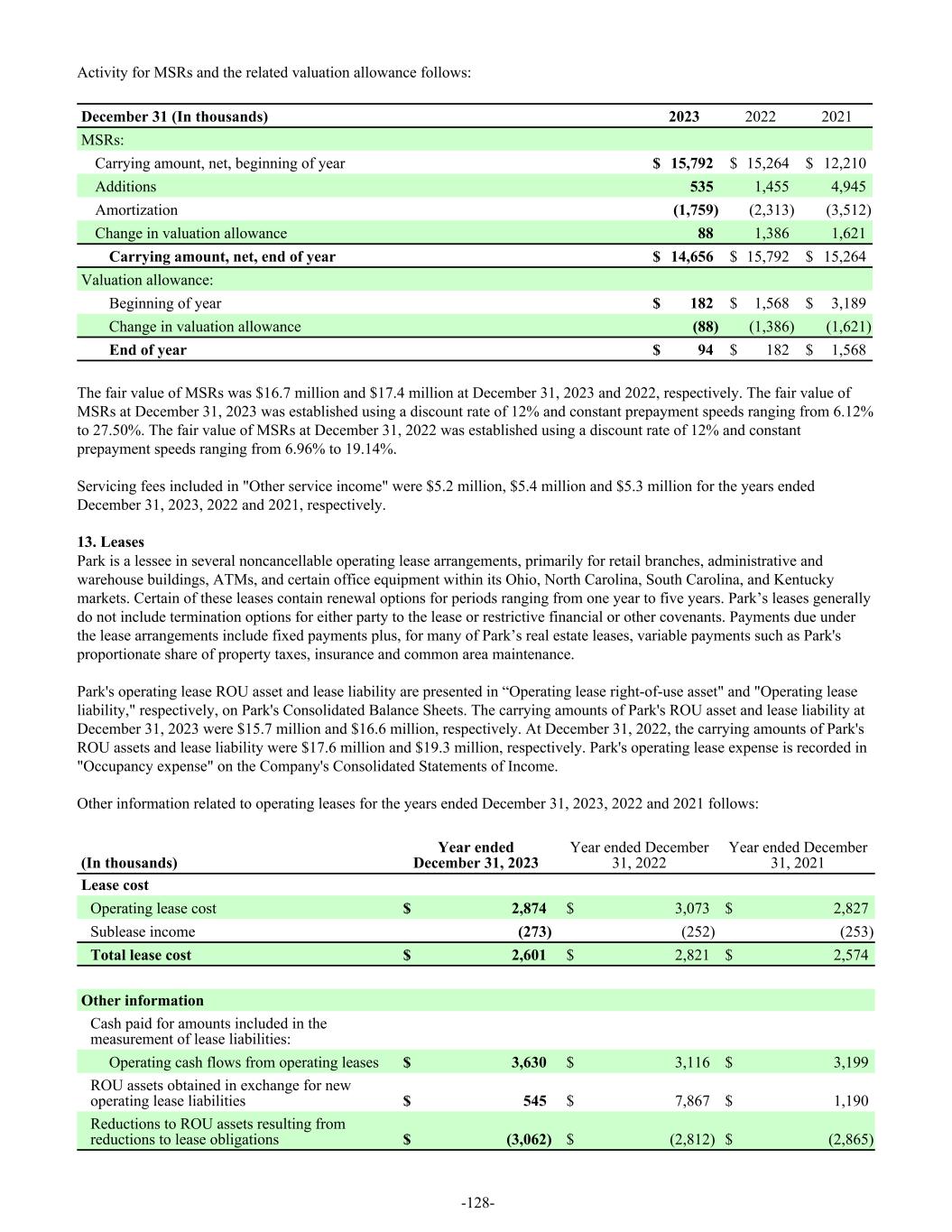 Activity for MSRs and the related valuation allowance follows: December 31 (In thousands) 2023 2022 2021 MSRs: Carrying amount, net, beginning of year $ 15,792 $ 15,264 $ 12,210 Additions 535 1,455 4,945 Amortization (1,759) (2,313) (3,512) Change in valuation allowance 88 1,386 1,621 Carrying amount, net, end of year $ 14,656 $ 15,792 $ 15,264 Valuation allowance: Beginning of year $ 182 $ 1,568 $ 3,189 Change in valuation allowance (88) (1,386) (1,621) End of year $ 94 $ 182 $ 1,568 The fair value of MSRs was $16.7 million and $17.4 million at December 31, 2023 and 2022, respectively. The fair value of MSRs at December 31, 2023 was established using a discount rate of 12% and constant prepayment speeds ranging from 6.12% to 27.50%. The fair value of MSRs at December 31, 2022 was established using a discount rate of 12% and constant prepayment speeds ranging from 6.96% to 19.14%. Servicing fees included in "Other service income" were $5.2 million, $5.4 million and $5.3 million for the years ended December 31, 2023, 2022 and 2021, respectively. 13. Leases Park is a lessee in several noncancellable operating lease arrangements, primarily for retail branches, administrative and warehouse buildings, ATMs, and certain office equipment within its Ohio, North Carolina, South Carolina, and Kentucky markets. Certain of these leases contain renewal options for periods ranging from one year to five years. Park’s leases generally do not include termination options for either party to the lease or restrictive financial or other covenants. Payments due under the lease arrangements include fixed payments plus, for many of Park’s real estate leases, variable payments such as Park's proportionate share of property taxes, insurance and common area maintenance. Park's operating lease ROU asset and lease liability are presented in “Operating lease right-of-use asset" and "Operating lease liability," respectively, on Park's Consolidated Balance Sheets. The carrying amounts of Park's ROU asset and lease liability at December 31, 2023 were $15.7 million and $16.6 million, respectively. At December 31, 2022, the carrying amounts of Park's ROU assets and lease liability were $17.6 million and $19.3 million, respectively. Park's operating lease expense is recorded in "Occupancy expense" on the Company's Consolidated Statements of Income. Other information related to operating leases for the years ended December 31, 2023, 2022 and 2021 follows: (In thousands) Year ended December 31, 2023 Year ended December 31, 2022 Year ended December 31, 2021 Lease cost Operating lease cost $ 2,874 $ 3,073 $ 2,827 Sublease income (273) (252) (253) Total lease cost $ 2,601 $ 2,821 $ 2,574 Other information Cash paid for amounts included in the measurement of lease liabilities: Operating cash flows from operating leases $ 3,630 $ 3,116 $ 3,199 ROU assets obtained in exchange for new operating lease liabilities $ 545 $ 7,867 $ 1,190 Reductions to ROU assets resulting from reductions to lease obligations $ (3,062) $ (2,812) $ (2,865) -128-