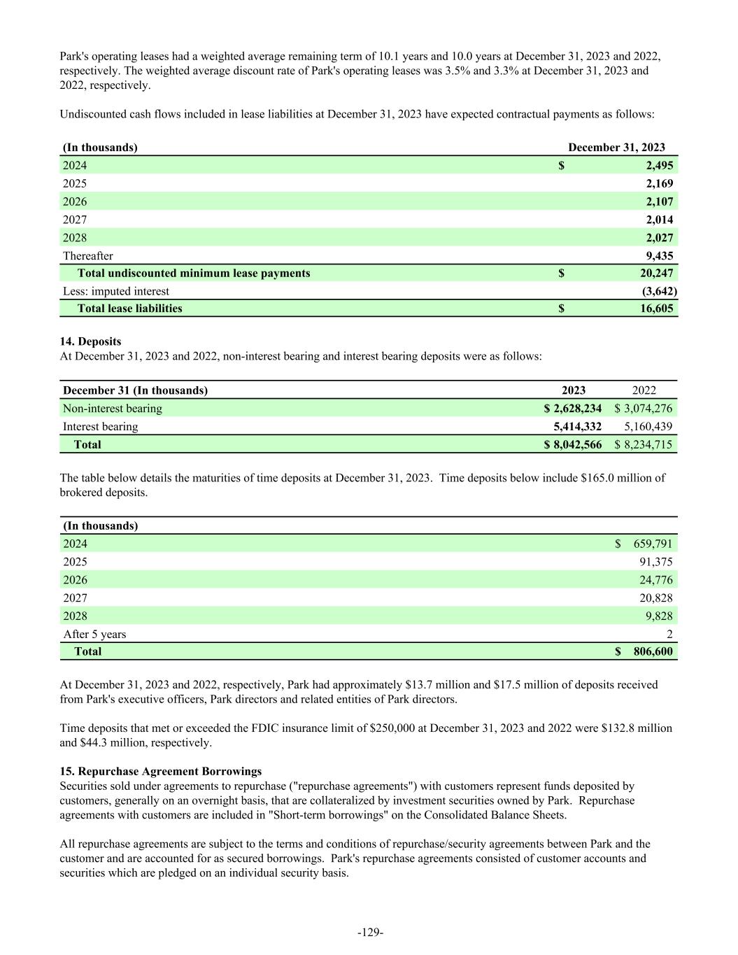 Park's operating leases had a weighted average remaining term of 10.1 years and 10.0 years at December 31, 2023 and 2022, respectively. The weighted average discount rate of Park's operating leases was 3.5% and 3.3% at December 31, 2023 and 2022, respectively. Undiscounted cash flows included in lease liabilities at December 31, 2023 have expected contractual payments as follows: (In thousands) December 31, 2023 2024 $ 2,495 2025 2,169 2026 2,107 2027 2,014 2028 2,027 Thereafter 9,435 Total undiscounted minimum lease payments $ 20,247 Less: imputed interest (3,642) Total lease liabilities $ 16,605 14. Deposits At December 31, 2023 and 2022, non-interest bearing and interest bearing deposits were as follows: December 31 (In thousands) 2023 2022 Non-interest bearing $ 2,628,234 $ 3,074,276 Interest bearing 5,414,332 5,160,439 Total $ 8,042,566 $ 8,234,715 The table below details the maturities of time deposits at December 31, 2023. Time deposits below include $165.0 million of brokered deposits. (In thousands) 2024 $ 659,791 2025 91,375 2026 24,776 2027 20,828 2028 9,828 After 5 years 2 Total $ 806,600 At December 31, 2023 and 2022, respectively, Park had approximately $13.7 million and $17.5 million of deposits received from Park's executive officers, Park directors and related entities of Park directors. Time deposits that met or exceeded the FDIC insurance limit of $250,000 at December 31, 2023 and 2022 were $132.8 million and $44.3 million, respectively. 15. Repurchase Agreement Borrowings Securities sold under agreements to repurchase ("repurchase agreements") with customers represent funds deposited by customers, generally on an overnight basis, that are collateralized by investment securities owned by Park. Repurchase agreements with customers are included in "Short-term borrowings" on the Consolidated Balance Sheets. All repurchase agreements are subject to the terms and conditions of repurchase/security agreements between Park and the customer and are accounted for as secured borrowings. Park's repurchase agreements consisted of customer accounts and securities which are pledged on an individual security basis. -129-