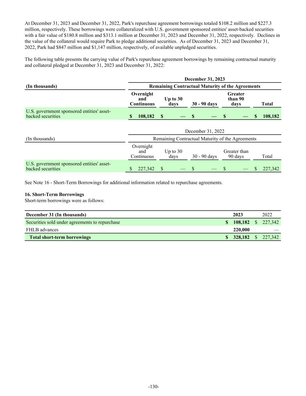 At December 31, 2023 and December 31, 2022, Park's repurchase agreement borrowings totaled $108.2 million and $227.3 million, respectively. These borrowings were collateralized with U.S. government sponsored entities' asset-backed securities with a fair value of $180.8 million and $313.1 million at December 31, 2023 and December 31, 2022, respectively. Declines in the value of the collateral would require Park to pledge additional securities. As of December 31, 2023 and December 31, 2022, Park had $847 million and $1,147 million, respectively, of available unpledged securities. The following table presents the carrying value of Park's repurchase agreement borrowings by remaining contractual maturity and collateral pledged at December 31, 2023 and December 31, 2022: December 31, 2023 (In thousands) Remaining Contractual Maturity of the Agreements Overnight and Continuous Up to 30 days 30 - 90 days Greater than 90 days Total U.S. government sponsored entities' asset- backed securities $ 108,182 $ — $ — $ — $ 108,182 December 31, 2022 (In thousands) Remaining Contractual Maturity of the Agreements Overnight and Continuous Up to 30 days 30 - 90 days Greater than 90 days Total U.S. government sponsored entities' asset- backed securities $ 227,342 $ — $ — $ — $ 227,342 See Note 16 - Short-Term Borrowings for additional information related to repurchase agreements. 16. Short-Term Borrowings Short-term borrowings were as follows: December 31 (In thousands) 2023 2022 Securities sold under agreements to repurchase $ 108,182 $ 227,342 FHLB advances 220,000 — Total short-term borrowings $ 328,182 $ 227,342 -130-