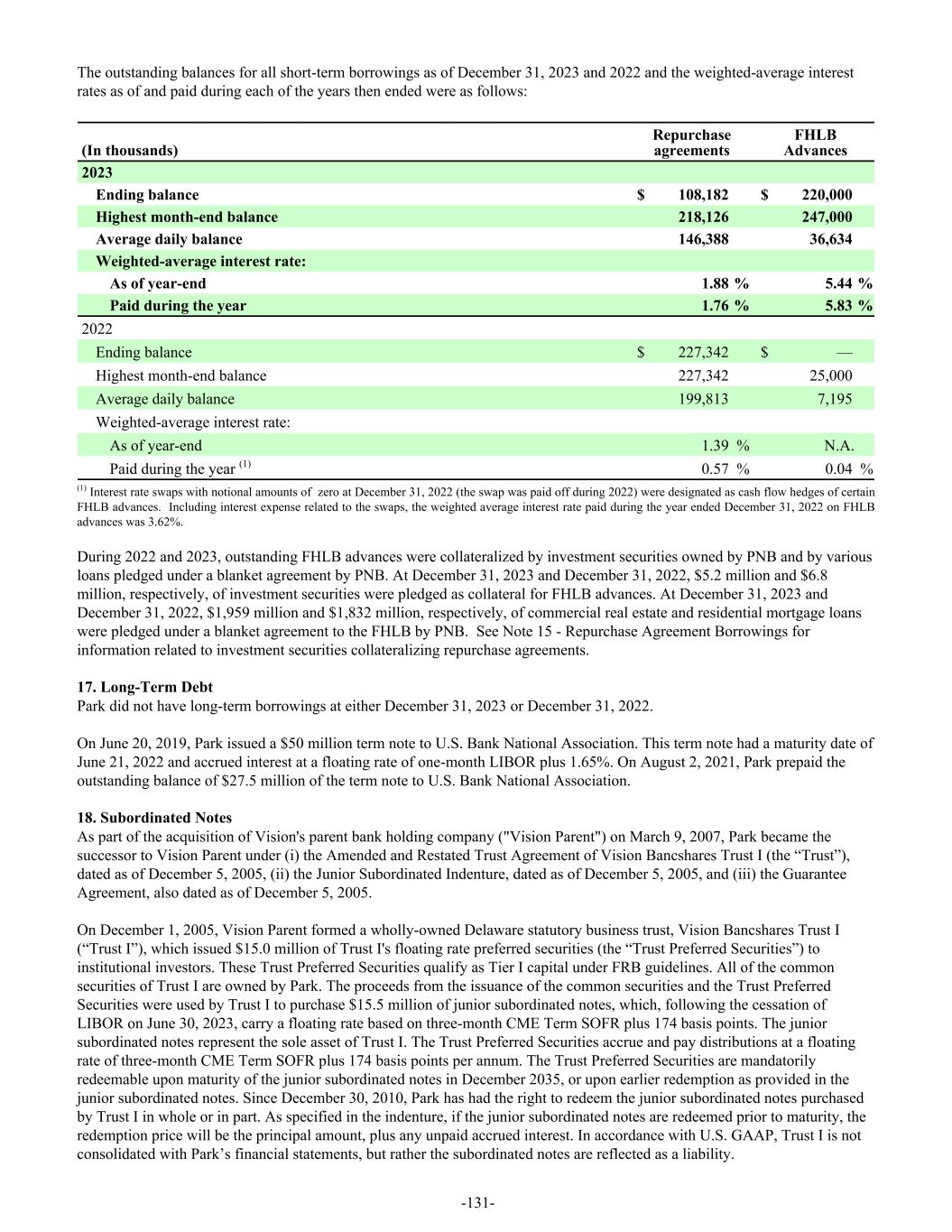 The outstanding balances for all short-term borrowings as of December 31, 2023 and 2022 and the weighted-average interest rates as of and paid during each of the years then ended were as follows: (In thousands) Repurchase agreements FHLB Advances 2023 Ending balance $ 108,182 $ 220,000 Highest month-end balance 218,126 247,000 Average daily balance 146,388 36,634 Weighted-average interest rate: As of year-end 1.88 % 5.44 % Paid during the year 1.76 % 5.83 % 2022 Ending balance $ 227,342 $ — Highest month-end balance 227,342 25,000 Average daily balance 199,813 7,195 Weighted-average interest rate: As of year-end 1.39 % N.A. Paid during the year (1) 0.57 % 0.04 % (1) Interest rate swaps with notional amounts of zero at December 31, 2022 (the swap was paid off during 2022) were designated as cash flow hedges of certain FHLB advances. Including interest expense related to the swaps, the weighted average interest rate paid during the year ended December 31, 2022 on FHLB advances was 3.62%. During 2022 and 2023, outstanding FHLB advances were collateralized by investment securities owned by PNB and by various loans pledged under a blanket agreement by PNB. At December 31, 2023 and December 31, 2022, $5.2 million and $6.8 million, respectively, of investment securities were pledged as collateral for FHLB advances. At December 31, 2023 and December 31, 2022, $1,959 million and $1,832 million, respectively, of commercial real estate and residential mortgage loans were pledged under a blanket agreement to the FHLB by PNB. See Note 15 - Repurchase Agreement Borrowings for information related to investment securities collateralizing repurchase agreements. 17. Long-Term Debt Park did not have long-term borrowings at either December 31, 2023 or December 31, 2022. On June 20, 2019, Park issued a $50 million term note to U.S. Bank National Association. This term note had a maturity date of June 21, 2022 and accrued interest at a floating rate of one-month LIBOR plus 1.65%. On August 2, 2021, Park prepaid the outstanding balance of $27.5 million of the term note to U.S. Bank National Association. 18. Subordinated Notes As part of the acquisition of Vision's parent bank holding company ("Vision Parent") on March 9, 2007, Park became the successor to Vision Parent under (i) the Amended and Restated Trust Agreement of Vision Bancshares Trust I (the “Trust”), dated as of December 5, 2005, (ii) the Junior Subordinated Indenture, dated as of December 5, 2005, and (iii) the Guarantee Agreement, also dated as of December 5, 2005. On December 1, 2005, Vision Parent formed a wholly-owned Delaware statutory business trust, Vision Bancshares Trust I (“Trust I”), which issued $15.0 million of Trust I's floating rate preferred securities (the “Trust Preferred Securities”) to institutional investors. These Trust Preferred Securities qualify as Tier I capital under FRB guidelines. All of the common securities of Trust I are owned by Park. The proceeds from the issuance of the common securities and the Trust Preferred Securities were used by Trust I to purchase $15.5 million of junior subordinated notes, which, following the cessation of LIBOR on June 30, 2023, carry a floating rate based on three-month CME Term SOFR plus 174 basis points. The junior subordinated notes represent the sole asset of Trust I. The Trust Preferred Securities accrue and pay distributions at a floating rate of three-month CME Term SOFR plus 174 basis points per annum. The Trust Preferred Securities are mandatorily redeemable upon maturity of the junior subordinated notes in December 2035, or upon earlier redemption as provided in the junior subordinated notes. Since December 30, 2010, Park has had the right to redeem the junior subordinated notes purchased by Trust I in whole or in part. As specified in the indenture, if the junior subordinated notes are redeemed prior to maturity, the redemption price will be the principal amount, plus any unpaid accrued interest. In accordance with U.S. GAAP, Trust I is not consolidated with Park’s financial statements, but rather the subordinated notes are reflected as a liability. -131-