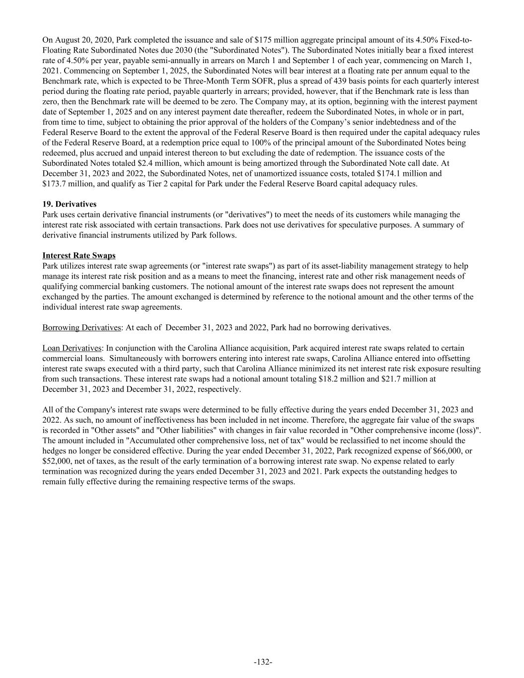 On August 20, 2020, Park completed the issuance and sale of $175 million aggregate principal amount of its 4.50% Fixed-to- Floating Rate Subordinated Notes due 2030 (the "Subordinated Notes"). The Subordinated Notes initially bear a fixed interest rate of 4.50% per year, payable semi-annually in arrears on March 1 and September 1 of each year, commencing on March 1, 2021. Commencing on September 1, 2025, the Subordinated Notes will bear interest at a floating rate per annum equal to the Benchmark rate, which is expected to be Three-Month Term SOFR, plus a spread of 439 basis points for each quarterly interest period during the floating rate period, payable quarterly in arrears; provided, however, that if the Benchmark rate is less than zero, then the Benchmark rate will be deemed to be zero. The Company may, at its option, beginning with the interest payment date of September 1, 2025 and on any interest payment date thereafter, redeem the Subordinated Notes, in whole or in part, from time to time, subject to obtaining the prior approval of the holders of the Company’s senior indebtedness and of the Federal Reserve Board to the extent the approval of the Federal Reserve Board is then required under the capital adequacy rules of the Federal Reserve Board, at a redemption price equal to 100% of the principal amount of the Subordinated Notes being redeemed, plus accrued and unpaid interest thereon to but excluding the date of redemption. The issuance costs of the Subordinated Notes totaled $2.4 million, which amount is being amortized through the Subordinated Note call date. At December 31, 2023 and 2022, the Subordinated Notes, net of unamortized issuance costs, totaled $174.1 million and $173.7 million, and qualify as Tier 2 capital for Park under the Federal Reserve Board capital adequacy rules. 19. Derivatives Park uses certain derivative financial instruments (or "derivatives") to meet the needs of its customers while managing the interest rate risk associated with certain transactions. Park does not use derivatives for speculative purposes. A summary of derivative financial instruments utilized by Park follows. Interest Rate Swaps Park utilizes interest rate swap agreements (or "interest rate swaps") as part of its asset-liability management strategy to help manage its interest rate risk position and as a means to meet the financing, interest rate and other risk management needs of qualifying commercial banking customers. The notional amount of the interest rate swaps does not represent the amount exchanged by the parties. The amount exchanged is determined by reference to the notional amount and the other terms of the individual interest rate swap agreements. Borrowing Derivatives: At each of December 31, 2023 and 2022, Park had no borrowing derivatives. Loan Derivatives: In conjunction with the Carolina Alliance acquisition, Park acquired interest rate swaps related to certain commercial loans. Simultaneously with borrowers entering into interest rate swaps, Carolina Alliance entered into offsetting interest rate swaps executed with a third party, such that Carolina Alliance minimized its net interest rate risk exposure resulting from such transactions. These interest rate swaps had a notional amount totaling $18.2 million and $21.7 million at December 31, 2023 and December 31, 2022, respectively. All of the Company's interest rate swaps were determined to be fully effective during the years ended December 31, 2023 and 2022. As such, no amount of ineffectiveness has been included in net income. Therefore, the aggregate fair value of the swaps is recorded in "Other assets" and "Other liabilities" with changes in fair value recorded in "Other comprehensive income (loss)". The amount included in "Accumulated other comprehensive loss, net of tax" would be reclassified to net income should the hedges no longer be considered effective. During the year ended December 31, 2022, Park recognized expense of $66,000, or $52,000, net of taxes, as the result of the early termination of a borrowing interest rate swap. No expense related to early termination was recognized during the years ended December 31, 2023 and 2021. Park expects the outstanding hedges to remain fully effective during the remaining respective terms of the swaps. -132-