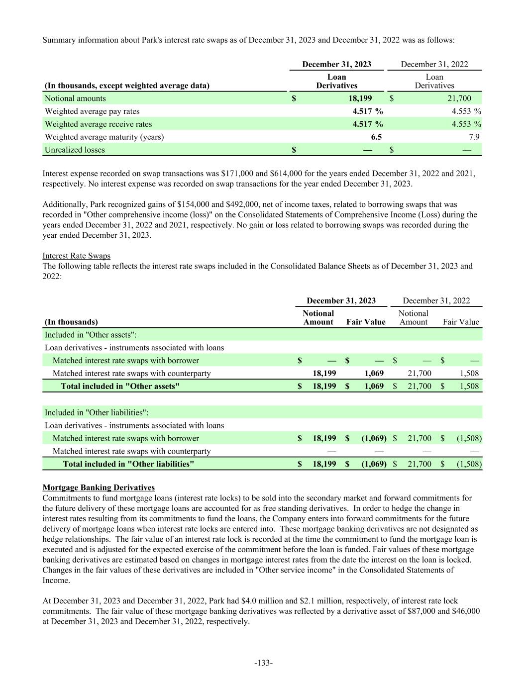 Summary information about Park's interest rate swaps as of December 31, 2023 and December 31, 2022 was as follows: December 31, 2023 December 31, 2022 (In thousands, except weighted average data) Loan Derivatives Loan Derivatives Notional amounts $ 18,199 $ 21,700 Weighted average pay rates 4.517 % 4.553 % Weighted average receive rates 4.517 % 4.553 % Weighted average maturity (years) 6.5 7.9 Unrealized losses $ — $ — Interest expense recorded on swap transactions was $171,000 and $614,000 for the years ended December 31, 2022 and 2021, respectively. No interest expense was recorded on swap transactions for the year ended December 31, 2023. Additionally, Park recognized gains of $154,000 and $492,000, net of income taxes, related to borrowing swaps that was recorded in "Other comprehensive income (loss)" on the Consolidated Statements of Comprehensive Income (Loss) during the years ended December 31, 2022 and 2021, respectively. No gain or loss related to borrowing swaps was recorded during the year ended December 31, 2023. Interest Rate Swaps The following table reflects the interest rate swaps included in the Consolidated Balance Sheets as of December 31, 2023 and 2022: (In thousands) December 31, 2023 December 31, 2022 Notional Amount Fair Value Notional Amount Fair Value Included in "Other assets": Loan derivatives - instruments associated with loans Matched interest rate swaps with borrower $ — $ — $ — $ — Matched interest rate swaps with counterparty 18,199 1,069 21,700 1,508 Total included in "Other assets" $ 18,199 $ 1,069 $ 21,700 $ 1,508 Included in "Other liabilities": Loan derivatives - instruments associated with loans Matched interest rate swaps with borrower $ 18,199 $ (1,069) $ 21,700 $ (1,508) Matched interest rate swaps with counterparty — — — — Total included in "Other liabilities" $ 18,199 $ (1,069) $ 21,700 $ (1,508) Mortgage Banking Derivatives Commitments to fund mortgage loans (interest rate locks) to be sold into the secondary market and forward commitments for the future delivery of these mortgage loans are accounted for as free standing derivatives. In order to hedge the change in interest rates resulting from its commitments to fund the loans, the Company enters into forward commitments for the future delivery of mortgage loans when interest rate locks are entered into. These mortgage banking derivatives are not designated as hedge relationships. The fair value of an interest rate lock is recorded at the time the commitment to fund the mortgage loan is executed and is adjusted for the expected exercise of the commitment before the loan is funded. Fair values of these mortgage banking derivatives are estimated based on changes in mortgage interest rates from the date the interest on the loan is locked. Changes in the fair values of these derivatives are included in "Other service income" in the Consolidated Statements of Income. At December 31, 2023 and December 31, 2022, Park had $4.0 million and $2.1 million, respectively, of interest rate lock commitments. The fair value of these mortgage banking derivatives was reflected by a derivative asset of $87,000 and $46,000 at December 31, 2023 and December 31, 2022, respectively. -133-