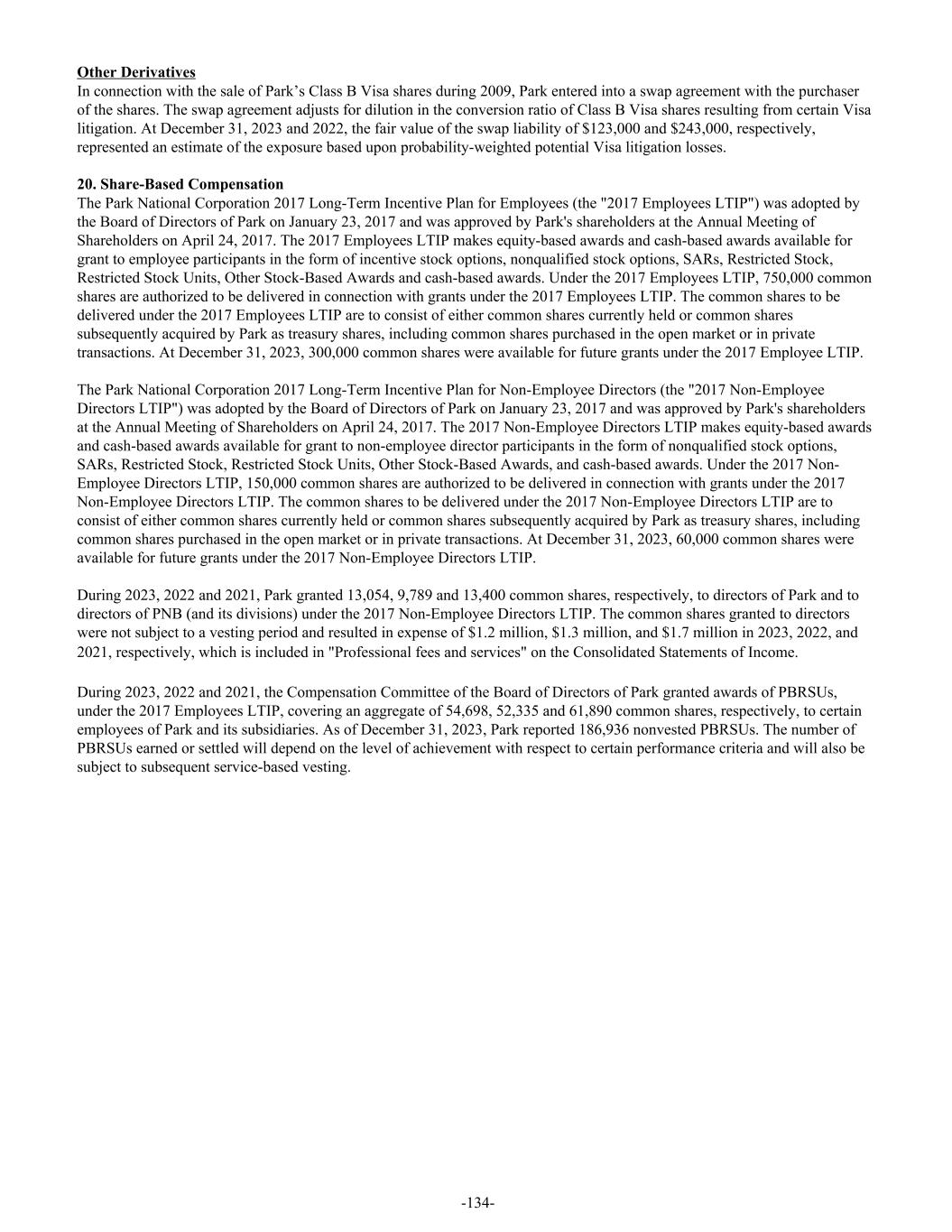 Other Derivatives In connection with the sale of Park’s Class B Visa shares during 2009, Park entered into a swap agreement with the purchaser of the shares. The swap agreement adjusts for dilution in the conversion ratio of Class B Visa shares resulting from certain Visa litigation. At December 31, 2023 and 2022, the fair value of the swap liability of $123,000 and $243,000, respectively, represented an estimate of the exposure based upon probability-weighted potential Visa litigation losses. 20. Share-Based Compensation The Park National Corporation 2017 Long-Term Incentive Plan for Employees (the "2017 Employees LTIP") was adopted by the Board of Directors of Park on January 23, 2017 and was approved by Park's shareholders at the Annual Meeting of Shareholders on April 24, 2017. The 2017 Employees LTIP makes equity-based awards and cash-based awards available for grant to employee participants in the form of incentive stock options, nonqualified stock options, SARs, Restricted Stock, Restricted Stock Units, Other Stock-Based Awards and cash-based awards. Under the 2017 Employees LTIP, 750,000 common shares are authorized to be delivered in connection with grants under the 2017 Employees LTIP. The common shares to be delivered under the 2017 Employees LTIP are to consist of either common shares currently held or common shares subsequently acquired by Park as treasury shares, including common shares purchased in the open market or in private transactions. At December 31, 2023, 300,000 common shares were available for future grants under the 2017 Employee LTIP. The Park National Corporation 2017 Long-Term Incentive Plan for Non-Employee Directors (the "2017 Non-Employee Directors LTIP") was adopted by the Board of Directors of Park on January 23, 2017 and was approved by Park's shareholders at the Annual Meeting of Shareholders on April 24, 2017. The 2017 Non-Employee Directors LTIP makes equity-based awards and cash-based awards available for grant to non-employee director participants in the form of nonqualified stock options, SARs, Restricted Stock, Restricted Stock Units, Other Stock-Based Awards, and cash-based awards. Under the 2017 Non- Employee Directors LTIP, 150,000 common shares are authorized to be delivered in connection with grants under the 2017 Non-Employee Directors LTIP. The common shares to be delivered under the 2017 Non-Employee Directors LTIP are to consist of either common shares currently held or common shares subsequently acquired by Park as treasury shares, including common shares purchased in the open market or in private transactions. At December 31, 2023, 60,000 common shares were available for future grants under the 2017 Non-Employee Directors LTIP. During 2023, 2022 and 2021, Park granted 13,054, 9,789 and 13,400 common shares, respectively, to directors of Park and to directors of PNB (and its divisions) under the 2017 Non-Employee Directors LTIP. The common shares granted to directors were not subject to a vesting period and resulted in expense of $1.2 million, $1.3 million, and $1.7 million in 2023, 2022, and 2021, respectively, which is included in "Professional fees and services" on the Consolidated Statements of Income. During 2023, 2022 and 2021, the Compensation Committee of the Board of Directors of Park granted awards of PBRSUs, under the 2017 Employees LTIP, covering an aggregate of 54,698, 52,335 and 61,890 common shares, respectively, to certain employees of Park and its subsidiaries. As of December 31, 2023, Park reported 186,936 nonvested PBRSUs. The number of PBRSUs earned or settled will depend on the level of achievement with respect to certain performance criteria and will also be subject to subsequent service-based vesting. -134-