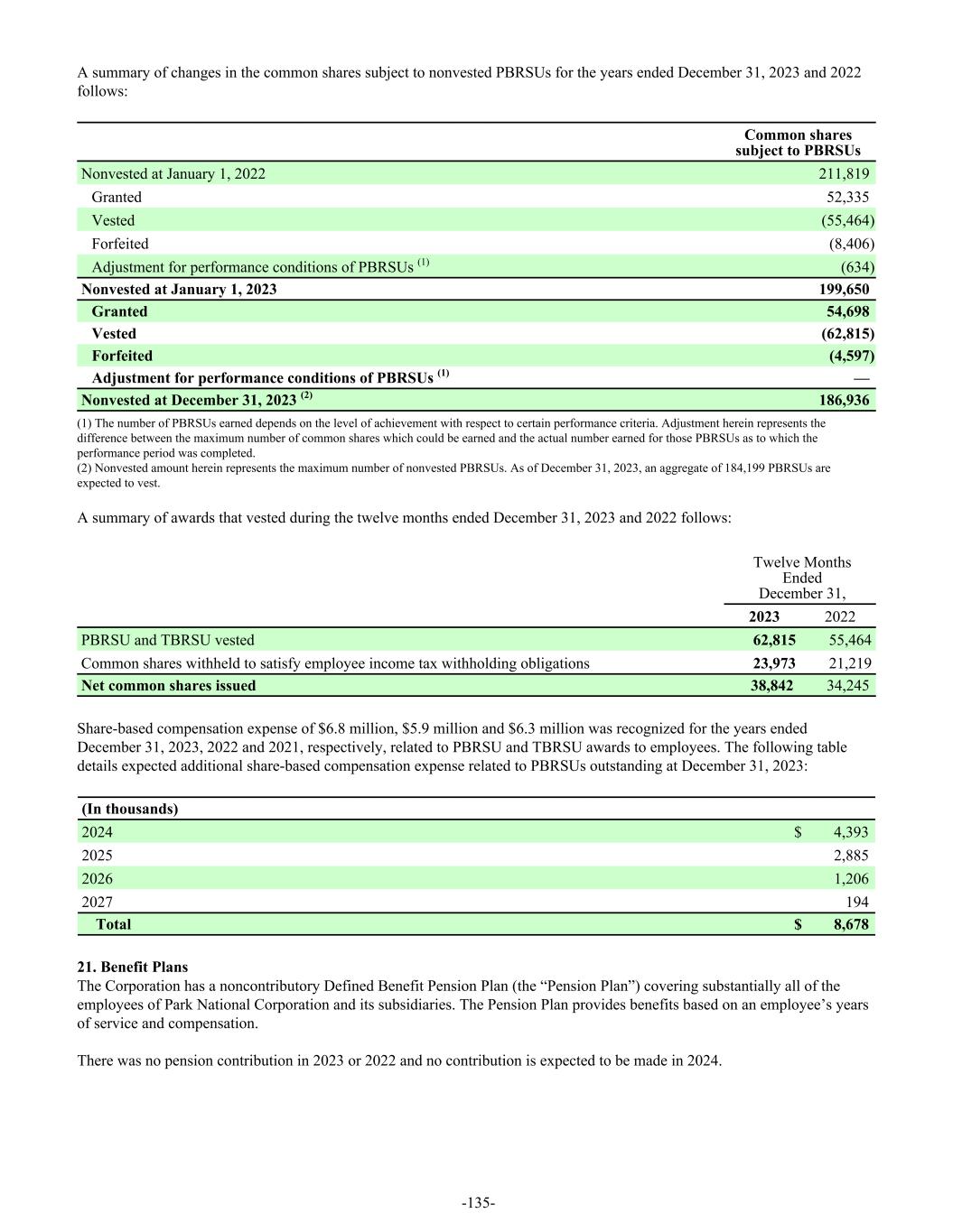 A summary of changes in the common shares subject to nonvested PBRSUs for the years ended December 31, 2023 and 2022 follows: Common shares subject to PBRSUs Nonvested at January 1, 2022 211,819 Granted 52,335 Vested (55,464) Forfeited (8,406) Adjustment for performance conditions of PBRSUs (1) (634) Nonvested at January 1, 2023 199,650 Granted 54,698 Vested (62,815) Forfeited (4,597) Adjustment for performance conditions of PBRSUs (1) — Nonvested at December 31, 2023 (2) 186,936 (1) The number of PBRSUs earned depends on the level of achievement with respect to certain performance criteria. Adjustment herein represents the difference between the maximum number of common shares which could be earned and the actual number earned for those PBRSUs as to which the performance period was completed. (2) Nonvested amount herein represents the maximum number of nonvested PBRSUs. As of December 31, 2023, an aggregate of 184,199 PBRSUs are expected to vest. A summary of awards that vested during the twelve months ended December 31, 2023 and 2022 follows: Twelve Months Ended December 31, 2023 2022 PBRSU and TBRSU vested 62,815 55,464 Common shares withheld to satisfy employee income tax withholding obligations 23,973 21,219 Net common shares issued 38,842 34,245 Share-based compensation expense of $6.8 million, $5.9 million and $6.3 million was recognized for the years ended December 31, 2023, 2022 and 2021, respectively, related to PBRSU and TBRSU awards to employees. The following table details expected additional share-based compensation expense related to PBRSUs outstanding at December 31, 2023: (In thousands) 2024 $ 4,393 2025 2,885 2026 1,206 2027 194 Total $ 8,678 21. Benefit Plans The Corporation has a noncontributory Defined Benefit Pension Plan (the “Pension Plan”) covering substantially all of the employees of Park National Corporation and its subsidiaries. The Pension Plan provides benefits based on an employee’s years of service and compensation. There was no pension contribution in 2023 or 2022 and no contribution is expected to be made in 2024. -135-