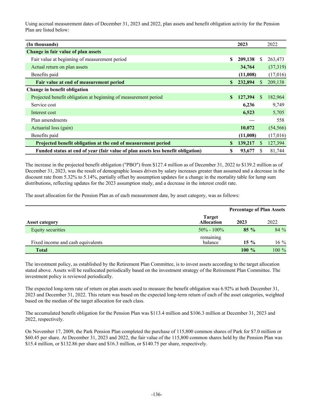 Using accrual measurement dates of December 31, 2023 and 2022, plan assets and benefit obligation activity for the Pension Plan are listed below: (In thousands) 2023 2022 Change in fair value of plan assets Fair value at beginning of measurement period $ 209,138 $ 263,473 Actual return on plan assets 34,764 (37,319) Benefits paid (11,008) (17,016) Fair value at end of measurement period $ 232,894 $ 209,138 Change in benefit obligation Projected benefit obligation at beginning of measurement period $ 127,394 $ 182,964 Service cost 6,236 9,749 Interest cost 6,523 5,705 Plan amendments — 558 Actuarial loss (gain) 10,072 (54,566) Benefits paid (11,008) (17,016) Projected benefit obligation at the end of measurement period $ 139,217 $ 127,394 Funded status at end of year (fair value of plan assets less benefit obligation) $ 93,677 $ 81,744 The increase in the projected benefit obligation ("PBO") from $127.4 million as of December 31, 2022 to $139.2 million as of December 31, 2023, was the result of demographic losses driven by salary increases greater than assumed and a decrease in the discount rate from 5.32% to 5.14%, partially offset by assumption updates for a change in the mortality table for lump sum distributions, reflecting updates for the 2023 assumption study, and a decrease in the interest credit rate. The asset allocation for the Pension Plan as of each measurement date, by asset category, was as follows: Percentage of Plan Assets Asset category Target Allocation 2023 2022 Equity securities 50% - 100% 85 % 84 % Fixed income and cash equivalents remaining balance 15 % 16 % Total 100 % 100 % The investment policy, as established by the Retirement Plan Committee, is to invest assets according to the target allocation stated above. Assets will be reallocated periodically based on the investment strategy of the Retirement Plan Committee. The investment policy is reviewed periodically. The expected long-term rate of return on plan assets used to measure the benefit obligation was 6.92% at both December 31, 2023 and December 31, 2022. This return was based on the expected long-term return of each of the asset categories, weighted based on the median of the target allocation for each class. The accumulated benefit obligation for the Pension Plan was $113.4 million and $106.3 million at December 31, 2023 and 2022, respectively. On November 17, 2009, the Park Pension Plan completed the purchase of 115,800 common shares of Park for $7.0 million or $60.45 per share. At December 31, 2023 and 2022, the fair value of the 115,800 common shares held by the Pension Plan was $15.4 million, or $132.86 per share and $16.3 million, or $140.75 per share, respectively. -136-