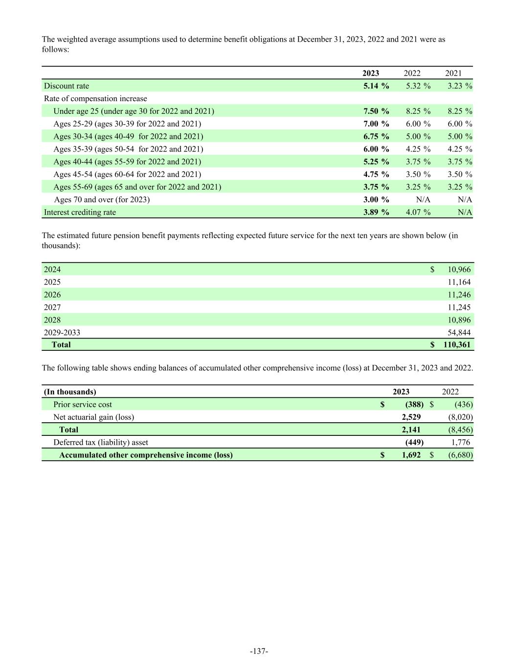 The weighted average assumptions used to determine benefit obligations at December 31, 2023, 2022 and 2021 were as follows: 2023 2022 2021 Discount rate 5.14 % 5.32 % 3.23 % Rate of compensation increase Under age 25 (under age 30 for 2022 and 2021) 7.50 % 8.25 % 8.25 % Ages 25-29 (ages 30-39 for 2022 and 2021) 7.00 % 6.00 % 6.00 % Ages 30-34 (ages 40-49 for 2022 and 2021) 6.75 % 5.00 % 5.00 % Ages 35-39 (ages 50-54 for 2022 and 2021) 6.00 % 4.25 % 4.25 % Ages 40-44 (ages 55-59 for 2022 and 2021) 5.25 % 3.75 % 3.75 % Ages 45-54 (ages 60-64 for 2022 and 2021) 4.75 % 3.50 % 3.50 % Ages 55-69 (ages 65 and over for 2022 and 2021) 3.75 % 3.25 % 3.25 % Ages 70 and over (for 2023) 3.00 % N/A N/A Interest crediting rate 3.89 % 4.07 % N/A The estimated future pension benefit payments reflecting expected future service for the next ten years are shown below (in thousands): 2024 $ 10,966 2025 11,164 2026 11,246 2027 11,245 2028 10,896 2029-2033 54,844 Total $ 110,361 The following table shows ending balances of accumulated other comprehensive income (loss) at December 31, 2023 and 2022. (In thousands) 2023 2022 Prior service cost $ (388) $ (436) Net actuarial gain (loss) 2,529 (8,020) Total 2,141 (8,456) Deferred tax (liability) asset (449) 1,776 Accumulated other comprehensive income (loss) $ 1,692 $ (6,680) -137-