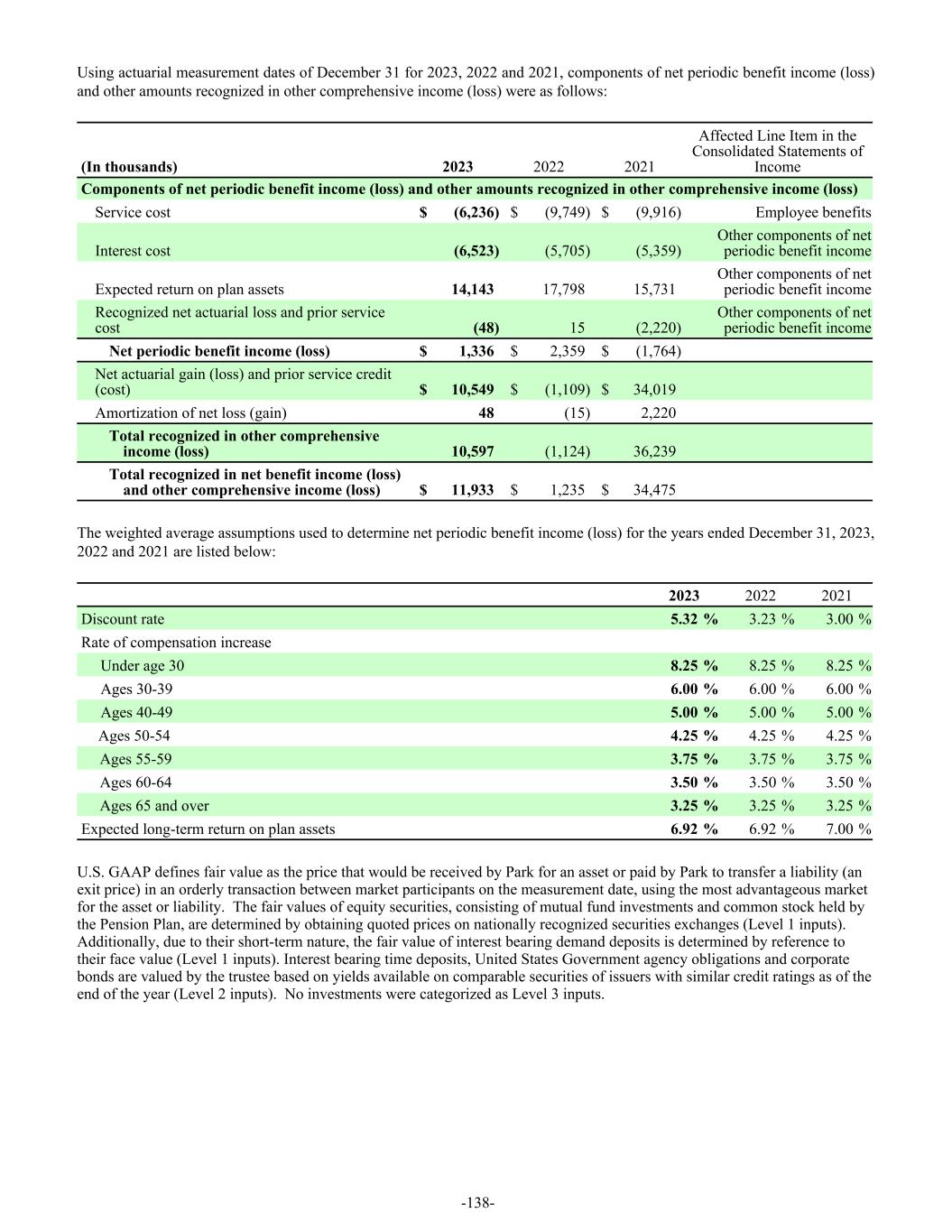 Using actuarial measurement dates of December 31 for 2023, 2022 and 2021, components of net periodic benefit income (loss) and other amounts recognized in other comprehensive income (loss) were as follows: (In thousands) 2023 2022 2021 Affected Line Item in the Consolidated Statements of Income Components of net periodic benefit income (loss) and other amounts recognized in other comprehensive income (loss) Service cost $ (6,236) $ (9,749) $ (9,916) Employee benefits Interest cost (6,523) (5,705) (5,359) Other components of net periodic benefit income Expected return on plan assets 14,143 17,798 15,731 Other components of net periodic benefit income Recognized net actuarial loss and prior service cost (48) 15 (2,220) Other components of net periodic benefit income Net periodic benefit income (loss) $ 1,336 $ 2,359 $ (1,764) Net actuarial gain (loss) and prior service credit (cost) $ 10,549 $ (1,109) $ 34,019 Amortization of net loss (gain) 48 (15) 2,220 Total recognized in other comprehensive income (loss) 10,597 (1,124) 36,239 Total recognized in net benefit income (loss) and other comprehensive income (loss) $ 11,933 $ 1,235 $ 34,475 The weighted average assumptions used to determine net periodic benefit income (loss) for the years ended December 31, 2023, 2022 and 2021 are listed below: 2023 2022 2021 Discount rate 5.32 % 3.23 % 3.00 % Rate of compensation increase Under age 30 8.25 % 8.25 % 8.25 % Ages 30-39 6.00 % 6.00 % 6.00 % Ages 40-49 5.00 % 5.00 % 5.00 % Ages 50-54 4.25 % 4.25 % 4.25 % Ages 55-59 3.75 % 3.75 % 3.75 % Ages 60-64 3.50 % 3.50 % 3.50 % Ages 65 and over 3.25 % 3.25 % 3.25 % Expected long-term return on plan assets 6.92 % 6.92 % 7.00 % U.S. GAAP defines fair value as the price that would be received by Park for an asset or paid by Park to transfer a liability (an exit price) in an orderly transaction between market participants on the measurement date, using the most advantageous market for the asset or liability. The fair values of equity securities, consisting of mutual fund investments and common stock held by the Pension Plan, are determined by obtaining quoted prices on nationally recognized securities exchanges (Level 1 inputs). Additionally, due to their short-term nature, the fair value of interest bearing demand deposits is determined by reference to their face value (Level 1 inputs). Interest bearing time deposits, United States Government agency obligations and corporate bonds are valued by the trustee based on yields available on comparable securities of issuers with similar credit ratings as of the end of the year (Level 2 inputs). No investments were categorized as Level 3 inputs. -138-