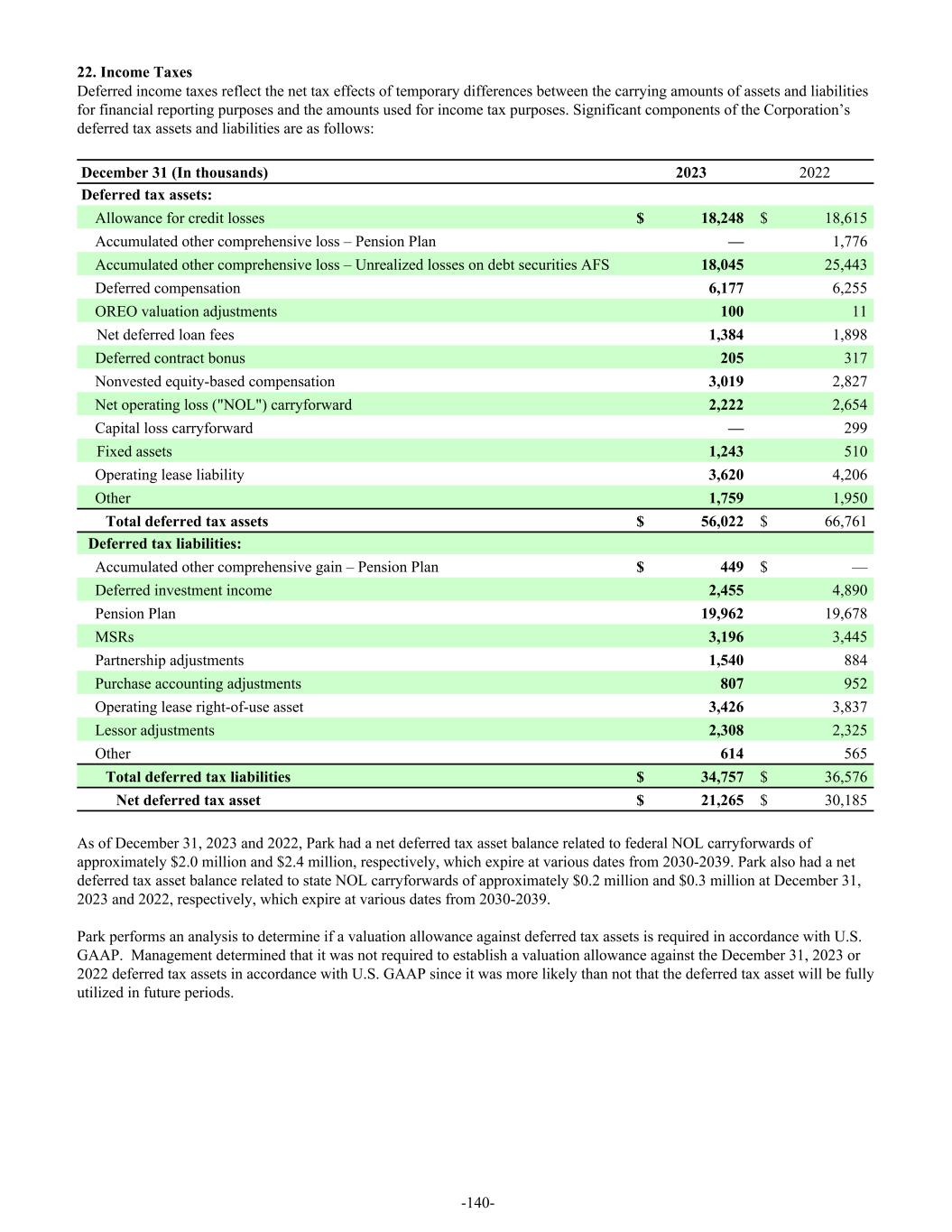 22. Income Taxes Deferred income taxes reflect the net tax effects of temporary differences between the carrying amounts of assets and liabilities for financial reporting purposes and the amounts used for income tax purposes. Significant components of the Corporation’s deferred tax assets and liabilities are as follows: December 31 (In thousands) 2023 2022 Deferred tax assets: Allowance for credit losses $ 18,248 $ 18,615 Accumulated other comprehensive loss – Pension Plan — 1,776 Accumulated other comprehensive loss – Unrealized losses on debt securities AFS 18,045 25,443 Deferred compensation 6,177 6,255 OREO valuation adjustments 100 11 Net deferred loan fees 1,384 1,898 Deferred contract bonus 205 317 Nonvested equity-based compensation 3,019 2,827 Net operating loss ("NOL") carryforward 2,222 2,654 Capital loss carryforward — 299 Fixed assets 1,243 510 Operating lease liability 3,620 4,206 Other 1,759 1,950 Total deferred tax assets $ 56,022 $ 66,761 Deferred tax liabilities: Accumulated other comprehensive gain – Pension Plan $ 449 $ — Deferred investment income 2,455 4,890 Pension Plan 19,962 19,678 MSRs 3,196 3,445 Partnership adjustments 1,540 884 Purchase accounting adjustments 807 952 Operating lease right-of-use asset 3,426 3,837 Lessor adjustments 2,308 2,325 Other 614 565 Total deferred tax liabilities $ 34,757 $ 36,576 Net deferred tax asset $ 21,265 $ 30,185 As of December 31, 2023 and 2022, Park had a net deferred tax asset balance related to federal NOL carryforwards of approximately $2.0 million and $2.4 million, respectively, which expire at various dates from 2030-2039. Park also had a net deferred tax asset balance related to state NOL carryforwards of approximately $0.2 million and $0.3 million at December 31, 2023 and 2022, respectively, which expire at various dates from 2030-2039. Park performs an analysis to determine if a valuation allowance against deferred tax assets is required in accordance with U.S. GAAP. Management determined that it was not required to establish a valuation allowance against the December 31, 2023 or 2022 deferred tax assets in accordance with U.S. GAAP since it was more likely than not that the deferred tax asset will be fully utilized in future periods. -140-