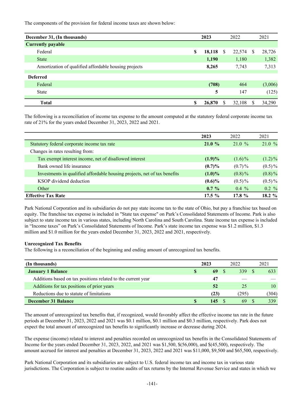 The components of the provision for federal income taxes are shown below: December 31, (In thousands) 2023 2022 2021 Currently payable Federal $ 18,118 $ 22,574 $ 28,726 State 1,190 1,180 1,382 Amortization of qualified affordable housing projects 8,265 7,743 7,313 Deferred Federal (708) 464 (3,006) State 5 147 (125) Total $ 26,870 $ 32,108 $ 34,290 The following is a reconciliation of income tax expense to the amount computed at the statutory federal corporate income tax rate of 21% for the years ended December 31, 2023, 2022 and 2021. 2023 2022 2021 Statutory federal corporate income tax rate 21.0 % 21.0 % 21.0 % Changes in rates resulting from: Tax exempt interest income, net of disallowed interest (1.9) % (1.6) % (1.2) % Bank owned life insurance (0.7) % (0.7) % (0.5) % Investments in qualified affordable housing projects, net of tax benefits (1.0) % (0.8) % (0.8) % KSOP dividend deduction (0.6) % (0.5) % (0.5) % Other 0.7 % 0.4 % 0.2 % Effective Tax Rate 17.5 % 17.8 % 18.2 % Park National Corporation and its subsidiaries do not pay state income tax to the state of Ohio, but pay a franchise tax based on equity. The franchise tax expense is included in "State tax expense" on Park’s Consolidated Statements of Income. Park is also subject to state income tax in various states, including North Carolina and South Carolina. State income tax expense is included in “Income taxes” on Park’s Consolidated Statements of Income. Park’s state income tax expense was $1.2 million, $1.3 million and $1.0 million for the years ended December 31, 2023, 2022 and 2021, respectively. Unrecognized Tax Benefits The following is a reconciliation of the beginning and ending amount of unrecognized tax benefits. (In thousands) 2023 2022 2021 January 1 Balance $ 69 $ 339 $ 633 Additions based on tax positions related to the current year 47 — — Additions for tax positions of prior years 52 25 10 Reductions due to statute of limitations (23) (295) (304) December 31 Balance $ 145 $ 69 $ 339 The amount of unrecognized tax benefits that, if recognized, would favorably affect the effective income tax rate in the future periods at December 31, 2023, 2022 and 2021 was $0.1 million, $0.1 million and $0.3 million, respectively. Park does not expect the total amount of unrecognized tax benefits to significantly increase or decrease during 2024. The expense (income) related to interest and penalties recorded on unrecognized tax benefits in the Consolidated Statements of Income for the years ended December 31, 2023, 2022, and 2021 was $1,500, $(56,000), and $(45,500), respectively. The amount accrued for interest and penalties at December 31, 2023, 2022 and 2021 was $11,000, $9,500 and $65,500, respectively. Park National Corporation and its subsidiaries are subject to U.S. federal income tax and income tax in various state jurisdictions. The Corporation is subject to routine audits of tax returns by the Internal Revenue Service and states in which we -141-