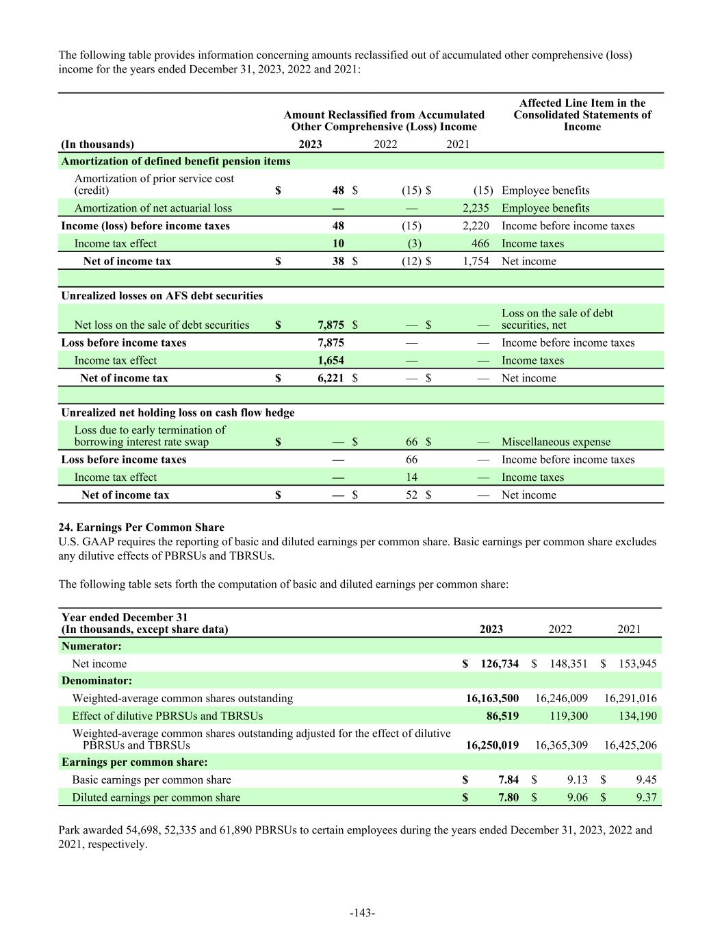 The following table provides information concerning amounts reclassified out of accumulated other comprehensive (loss) income for the years ended December 31, 2023, 2022 and 2021: Amount Reclassified from Accumulated Other Comprehensive (Loss) Income Affected Line Item in the Consolidated Statements of Income (In thousands) 2023 2022 2021 Amortization of defined benefit pension items Amortization of prior service cost (credit) $ 48 $ (15) $ (15) Employee benefits Amortization of net actuarial loss — — 2,235 Employee benefits Income (loss) before income taxes 48 (15) 2,220 Income before income taxes Income tax effect 10 (3) 466 Income taxes Net of income tax $ 38 $ (12) $ 1,754 Net income Unrealized losses on AFS debt securities Net loss on the sale of debt securities $ 7,875 $ — $ — Loss on the sale of debt securities, net Loss before income taxes 7,875 — — Income before income taxes Income tax effect 1,654 — — Income taxes Net of income tax $ 6,221 $ — $ — Net income Unrealized net holding loss on cash flow hedge Loss due to early termination of borrowing interest rate swap $ — $ 66 $ — Miscellaneous expense Loss before income taxes — 66 — Income before income taxes Income tax effect — 14 — Income taxes Net of income tax $ — $ 52 $ — Net income 24. Earnings Per Common Share U.S. GAAP requires the reporting of basic and diluted earnings per common share. Basic earnings per common share excludes any dilutive effects of PBRSUs and TBRSUs. The following table sets forth the computation of basic and diluted earnings per common share: Year ended December 31 (In thousands, except share data) 2023 2022 2021 Numerator: Net income $ 126,734 $ 148,351 $ 153,945 Denominator: Weighted-average common shares outstanding 16,163,500 16,246,009 16,291,016 Effect of dilutive PBRSUs and TBRSUs 86,519 119,300 134,190 Weighted-average common shares outstanding adjusted for the effect of dilutive PBRSUs and TBRSUs 16,250,019 16,365,309 16,425,206 Earnings per common share: Basic earnings per common share $ 7.84 $ 9.13 $ 9.45 Diluted earnings per common share $ 7.80 $ 9.06 $ 9.37 Park awarded 54,698, 52,335 and 61,890 PBRSUs to certain employees during the years ended December 31, 2023, 2022 and 2021, respectively. -143-